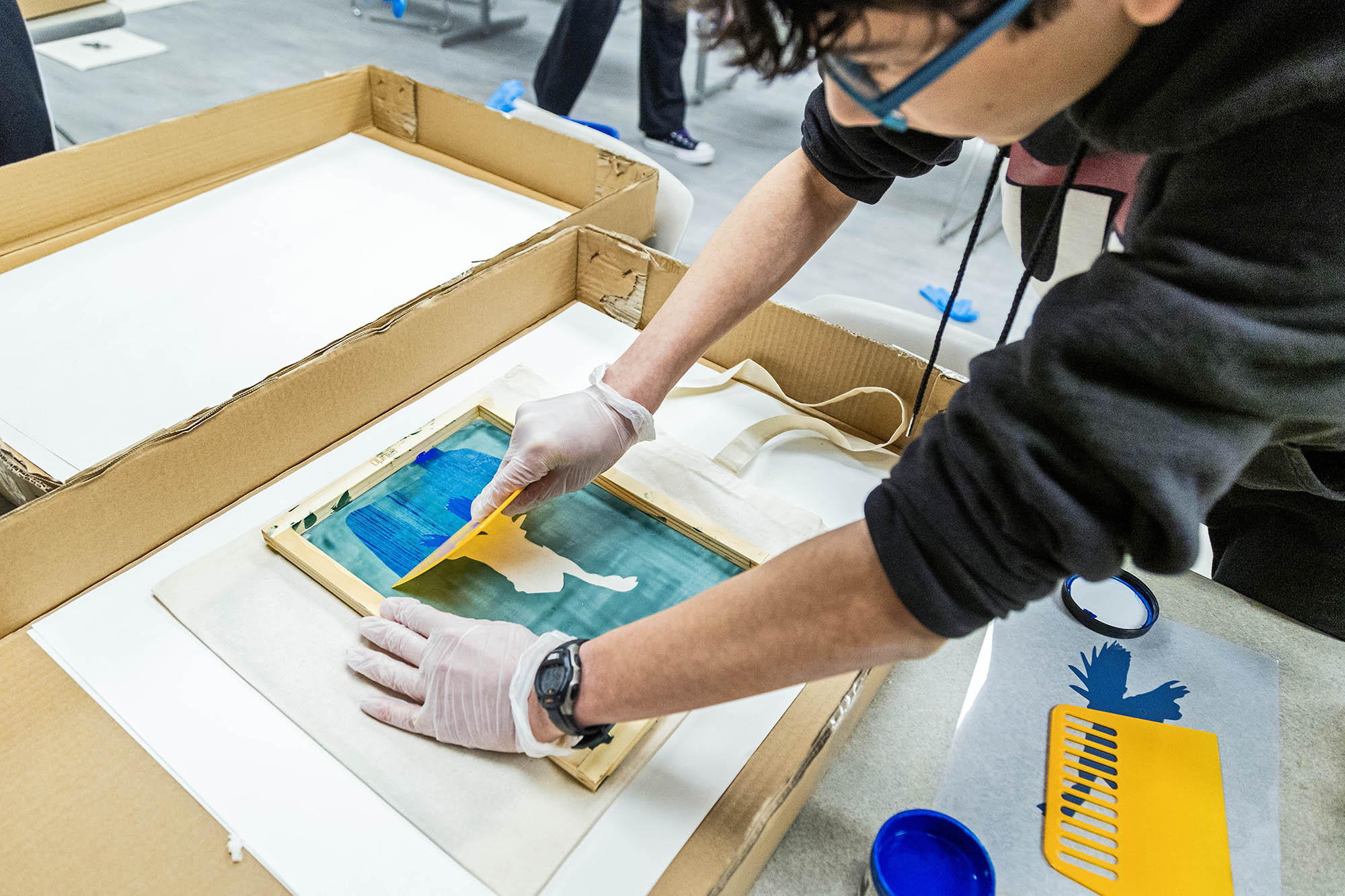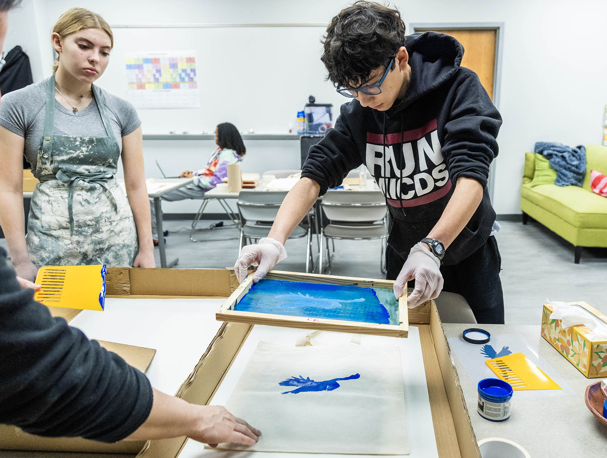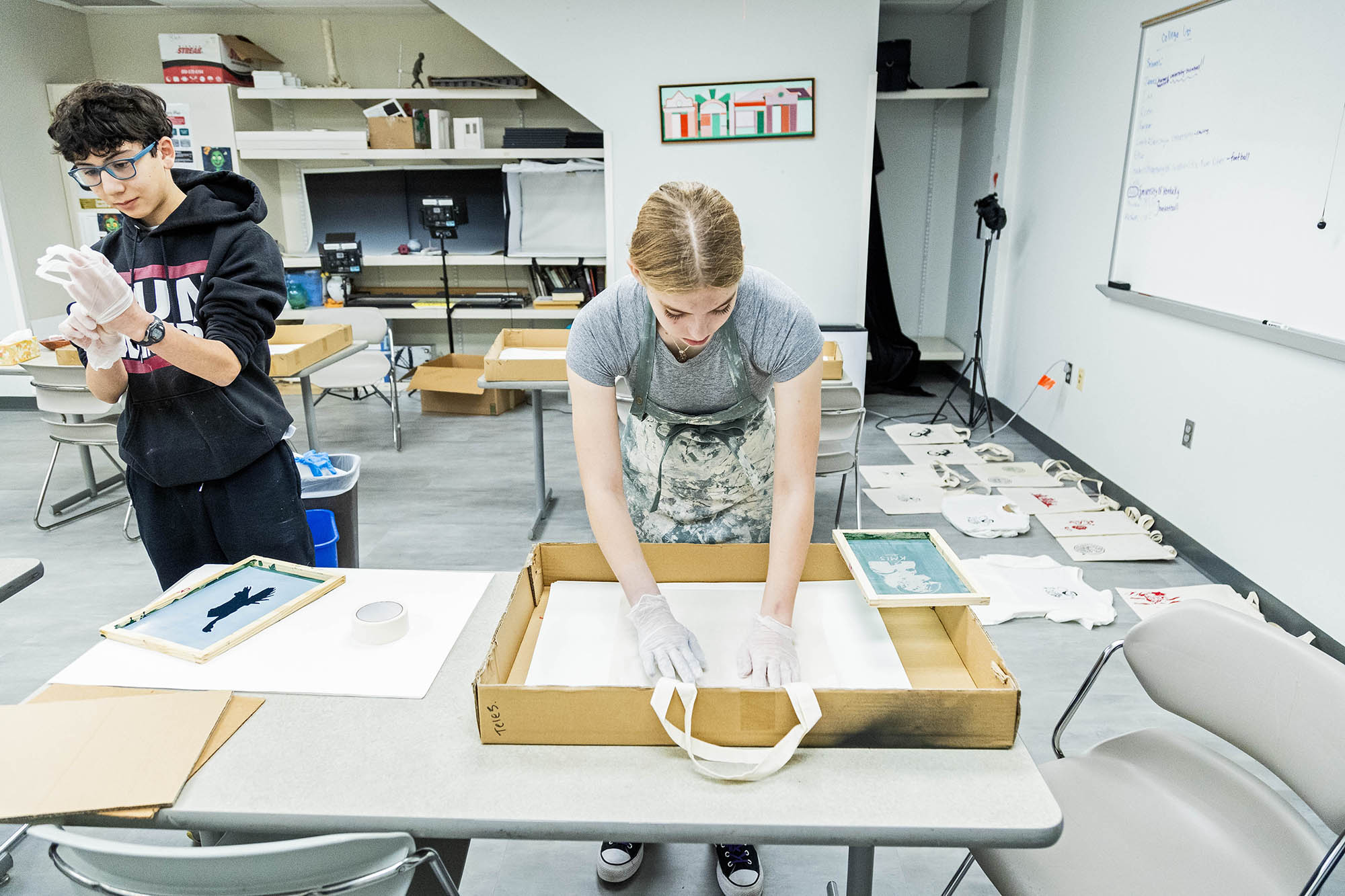 While examining the students’ final screenprinting designs before putting ink to fabric, Williams said, “3D art is expressive. Students have dabbled in screen printing to design bold prints, fired up their imaginations with copper enameling, made jewelry and pottery, and more. Whether they love making wearable art, custom décor, or just want to try something new, this class is all about experimenting, creating, and discovering your unique artistic voice.”