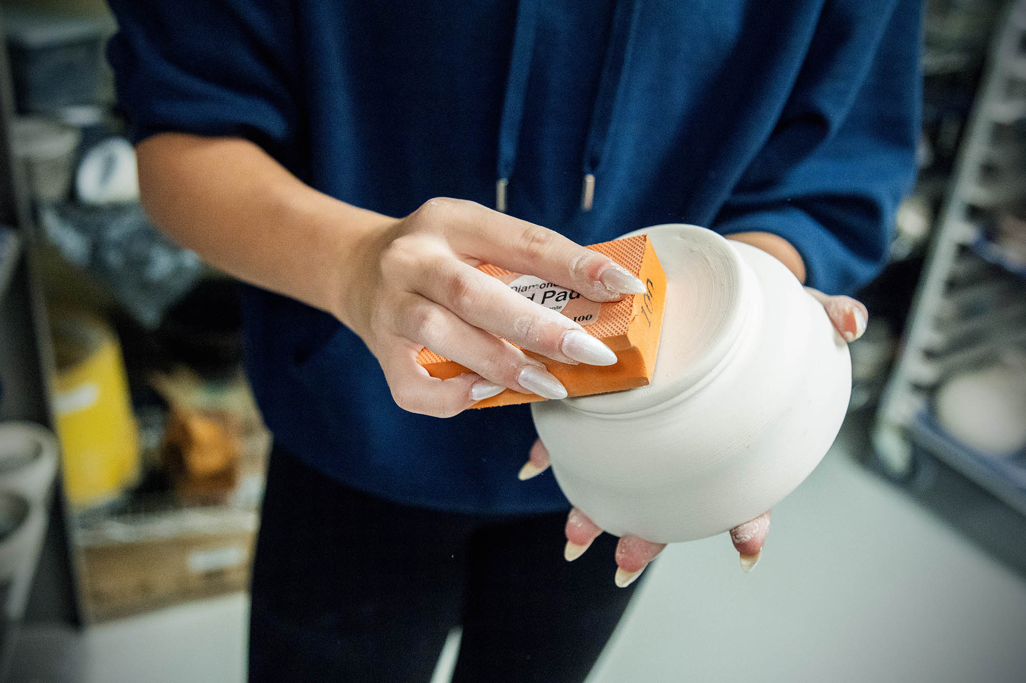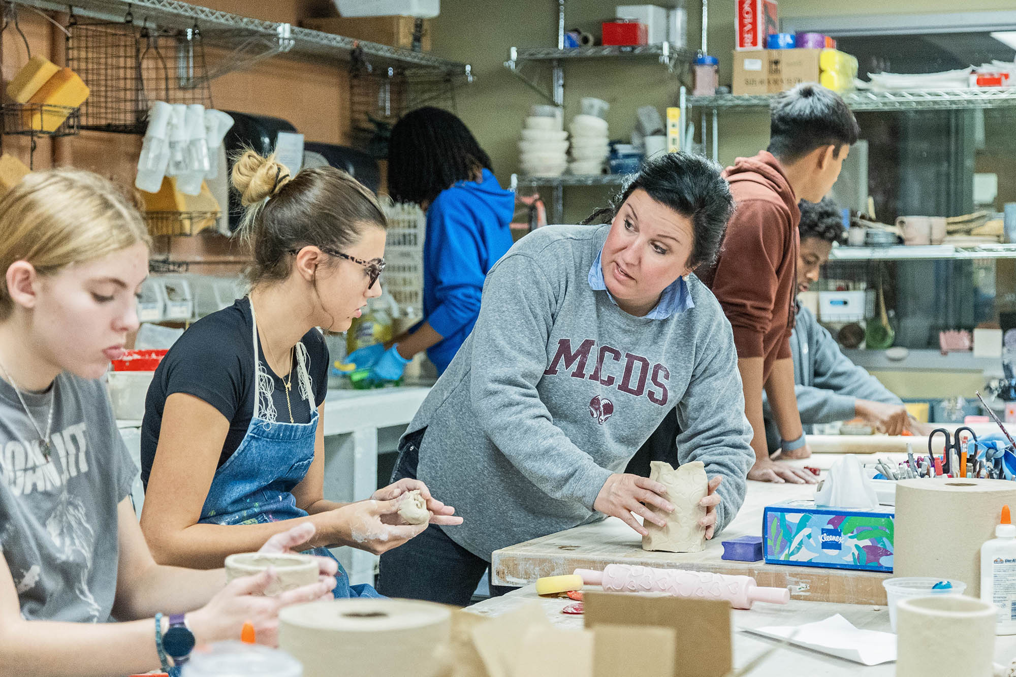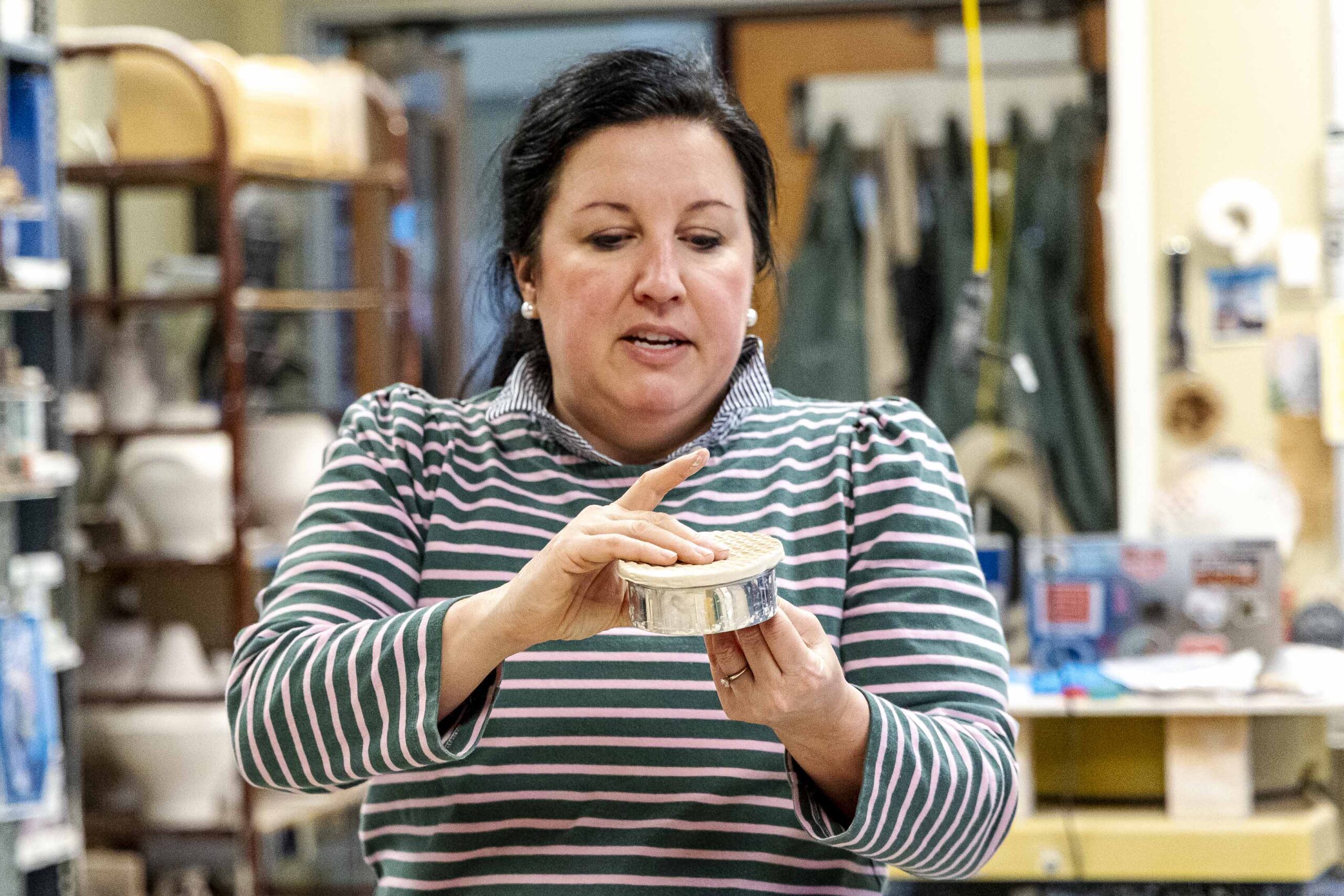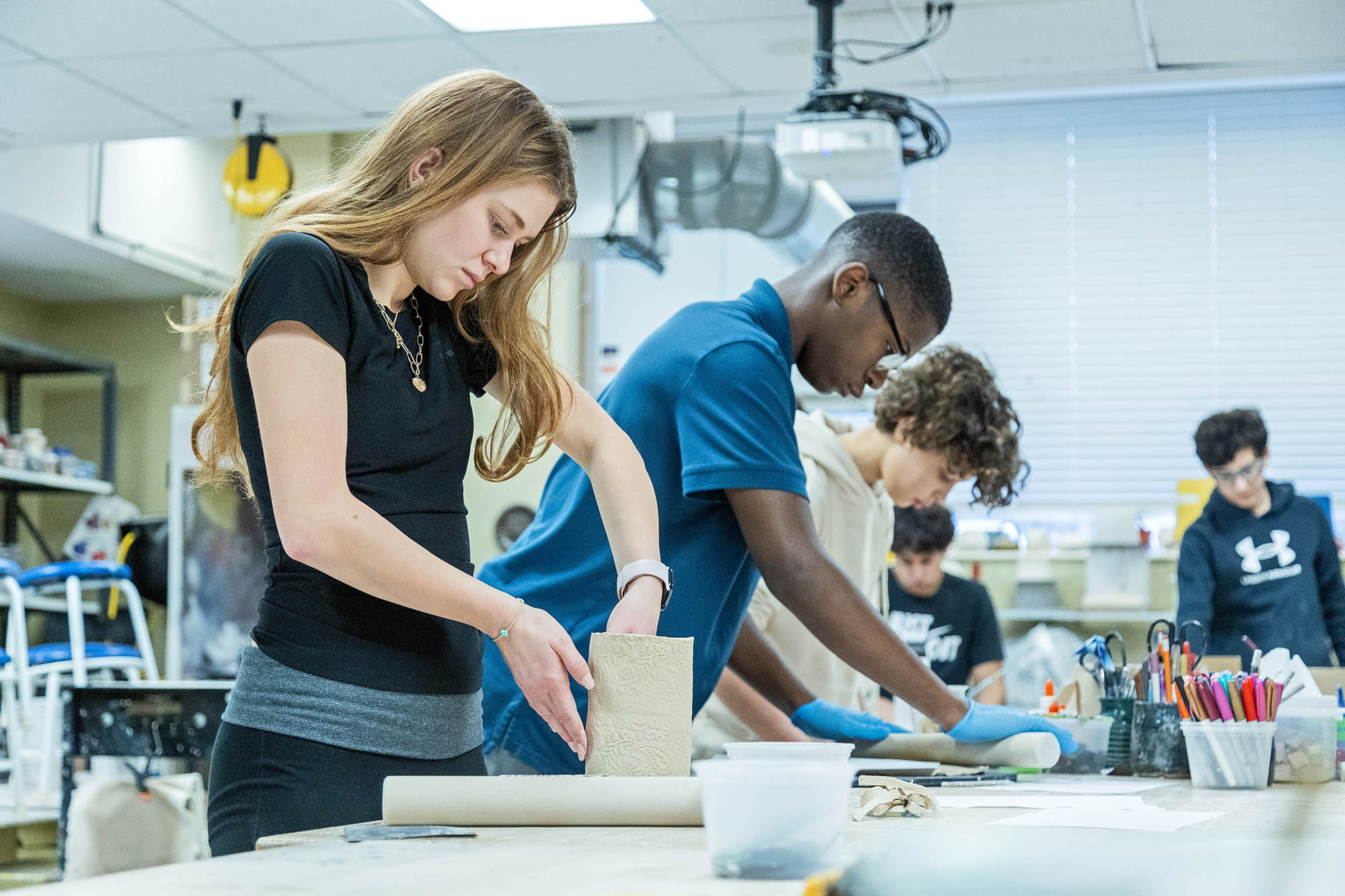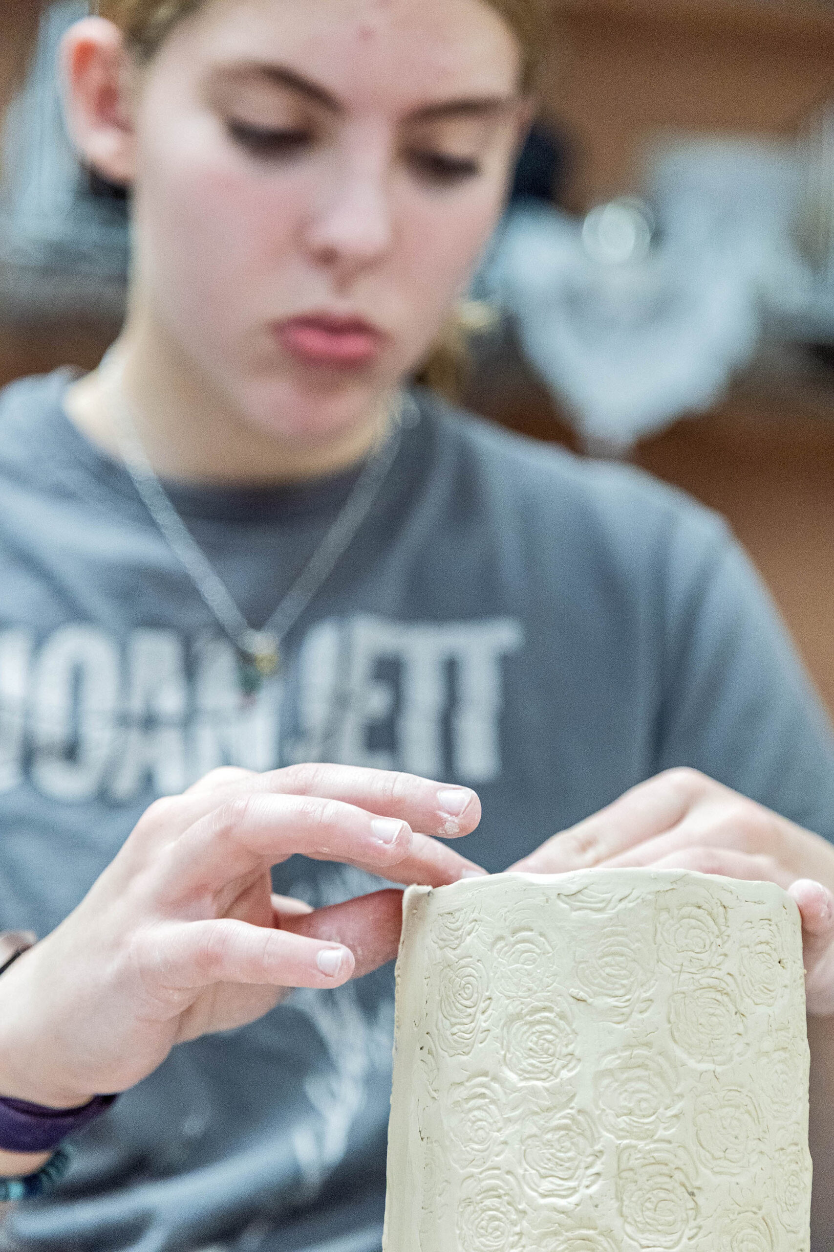 In a vibrant, clay-dusted art studio in Bryant Arts Center, Upper School Arts Teacher Brooke Williams opens the kiln to check on the glass pieces that had been cooling all morning. The glass designs were the first of many creations to spend time overnight in the kiln. They were created by students in the Winter Term course, Creative Fusion: Hands-On Art Lab. Williams said, “This class gives students a small taste of the types of art they can explore independently or incorporate into their other art projects.”