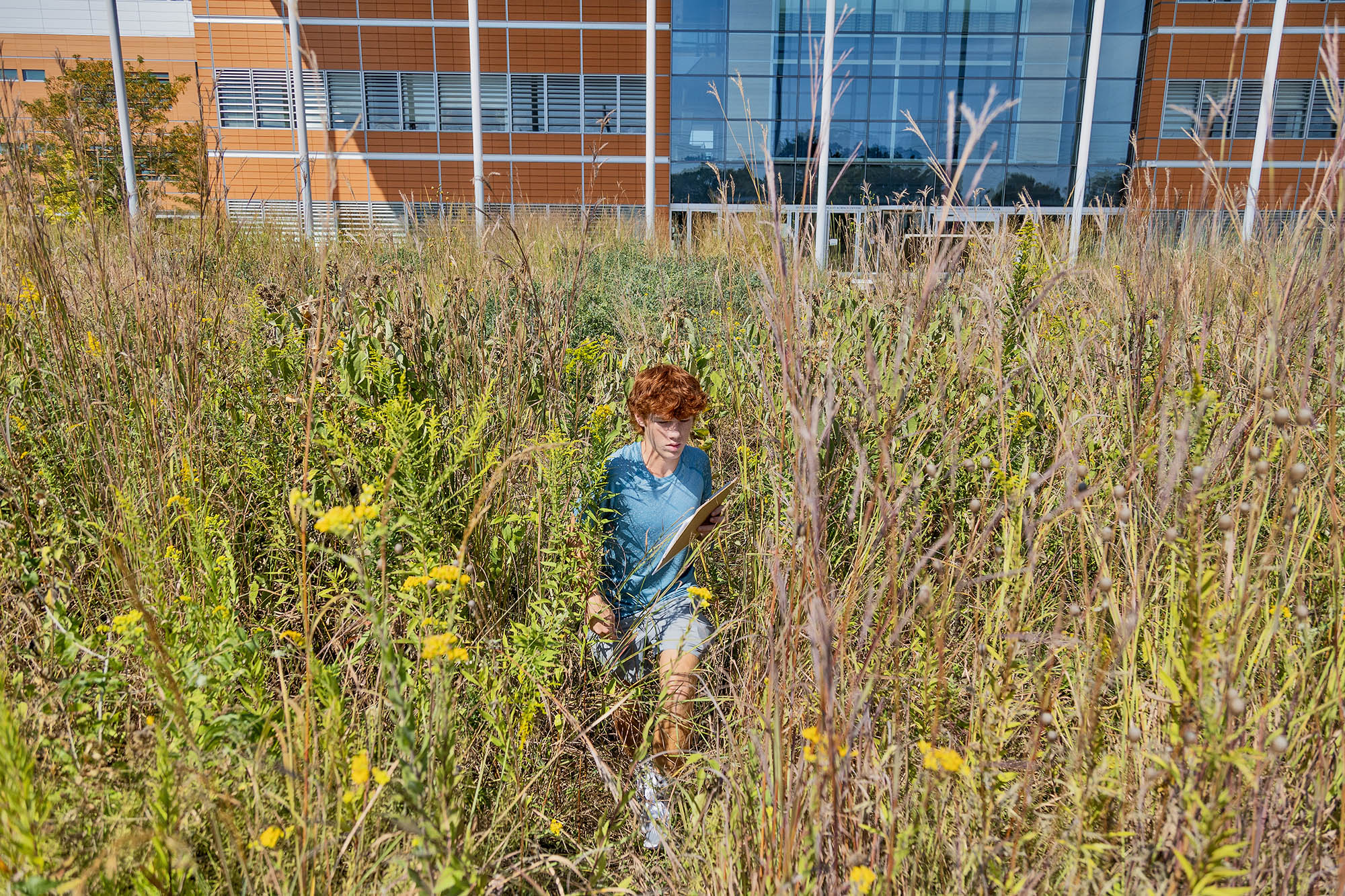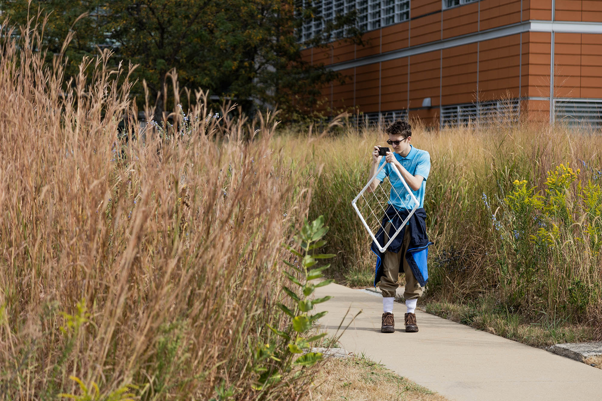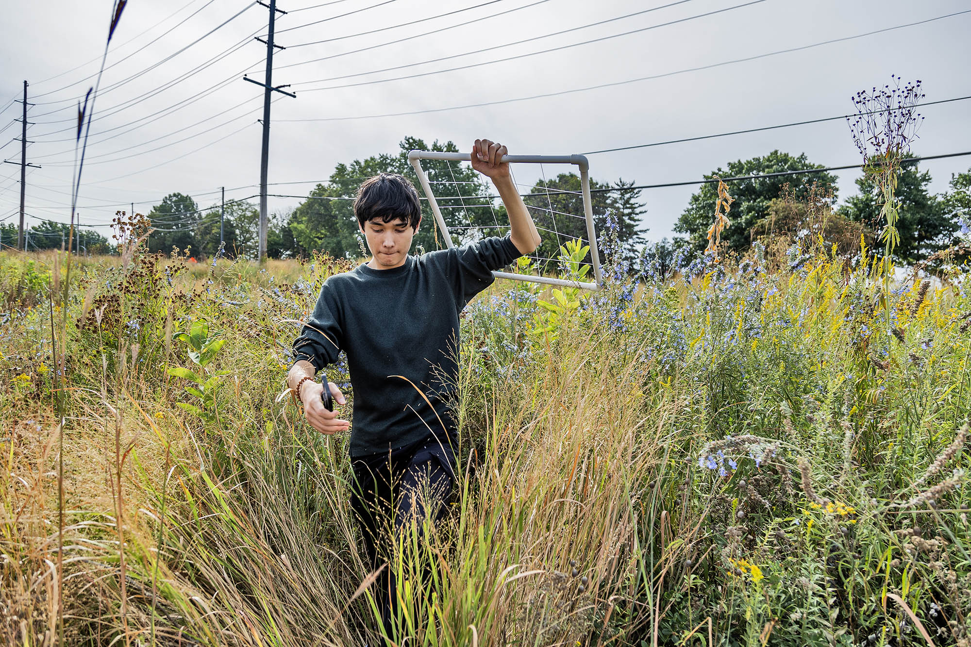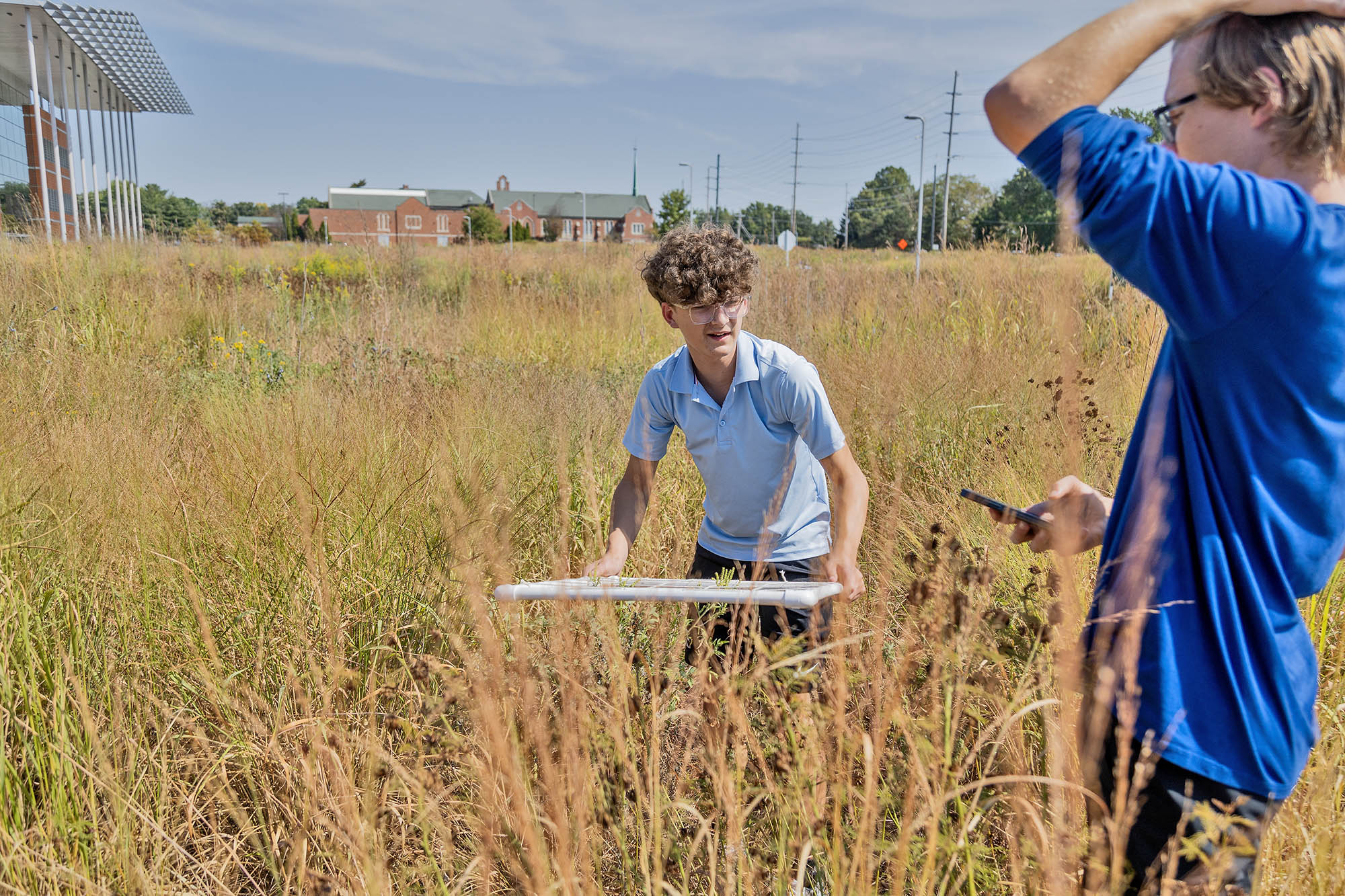 To start, biology students headed to the north end of A Lot on campus, where a sign peeks through the tall plants: Prairie Restoration Area. Using quadrats, they collected a wide variety of data to calculate percent cover, identify species, and calculate biodiversity.