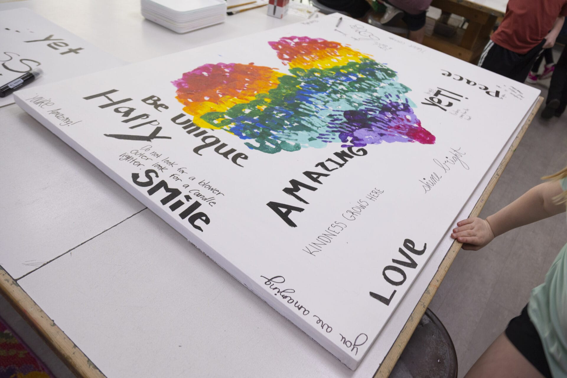 These are all phrases thoughtfully inscribed on the evolving Kindness Crew mural in Beasley Lower School.