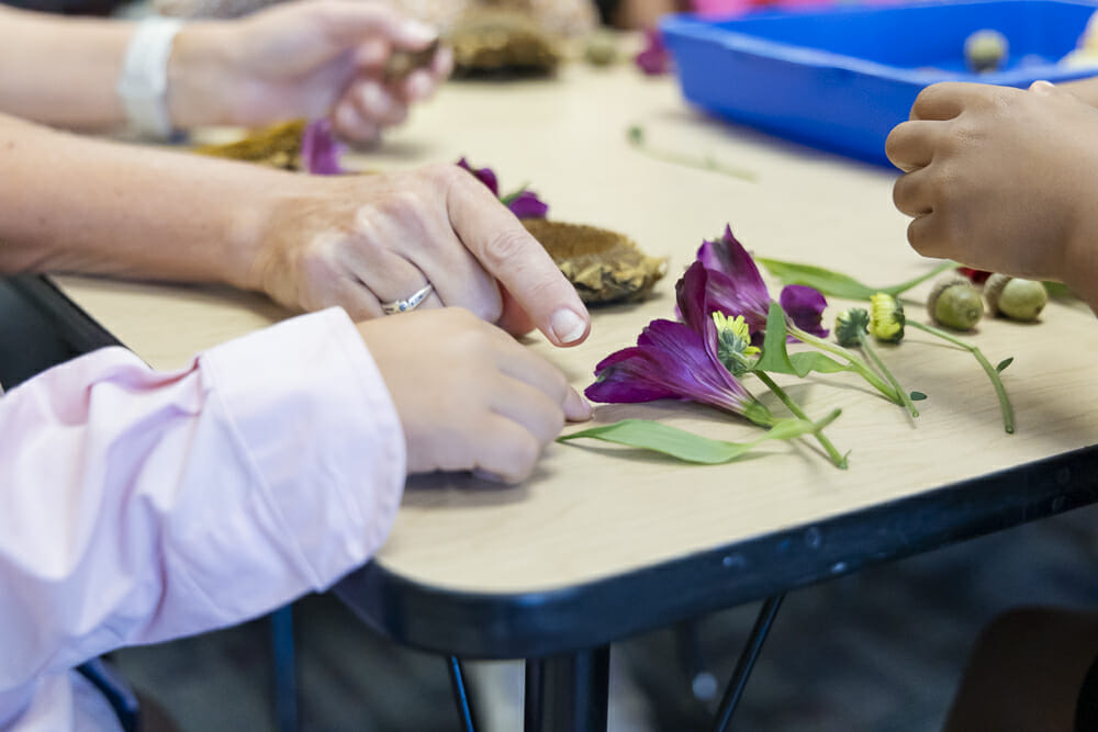 Junior Kindergartners sorted flower parts and connected to the book The Tiny Seed by using unifix cubes to measure flowers. Senior kindergarten students explored what colors exist in nature, drawing pictures along a rainbow walk. “The only color we couldn’t find was blue, which got us thinking about seasonal colors,” said Lower School Science Teacher Laura Pupillo. “Later in the week, SK dissected sunflowers from our own science courtyard. These sunflowers had just made seeds, so we pulled seeds for planting in the spring. How exciting it will be to plant seeds that we harvested earlier in the year!”