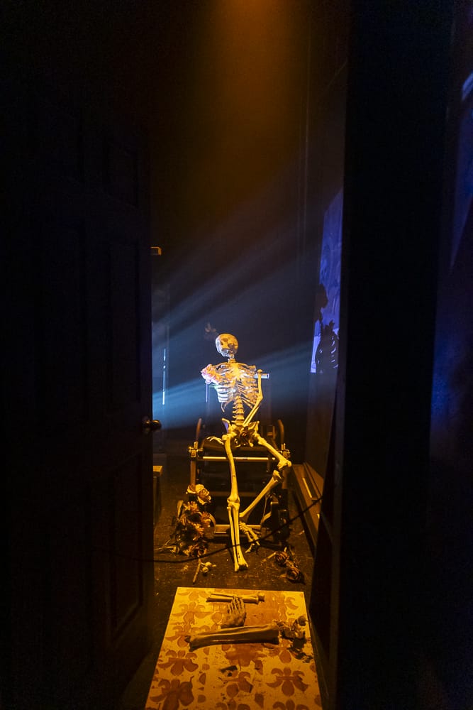 Two Doors: Arissa Alpaslan, Gwen Benson-Reschke, Felipe Ferreira, Tara Sadasivam, Ian Sims Materials: Furniture, lighting, sound, and animation Measurements: Doors - 32"x82", Piano - 19"x56", width of space 142.5" height 161.5" Our installation represents the concept of lost and found. We did this by dividing it into two rooms then a center walkway with a curtain and a mirror. The left door represents the concept of found. The inside is a piano, and on it sits a smaller mirror and a flower; these show calm as in the viewer is finding a calm in themselves. The other side has a skeleton, which shows the lost side and represents a struggle with health.