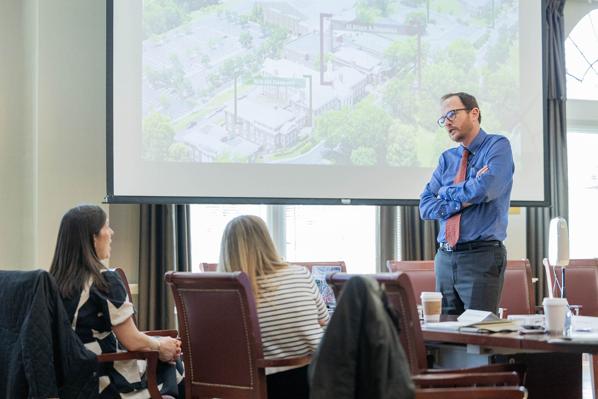 Dean of Digital Learning Tex Tourais spoke on “AI in (and out) of the classroom,” providing an overview of MICDS’ approach to AI. He divided the group into two and walked them through two examples of projects on FLINT that the students have actually used this year. FLINT is the School-approved artificial intelligence tool used by our teachers and students. One project was from an Upper School Anatomy and Physiology class where the students select a case study of a sick patient exhibiting various symptoms. The students position themselves as new doctors, treating FLINT as a mentor doctor to converse about the case study and ultimately determine a diagnosis. In the classroom setting, students then wrote essays on their diagnoses based on their conversations with the FLINT “doctor.” The other project was used in a Middle School science lesson. Students selected an element from the periodic table and gave FLINT a description of what they believed the element would look and act like if it were a person. The student then asked FLINT to create a picture using their description, a creative way to bring learning elements to life.