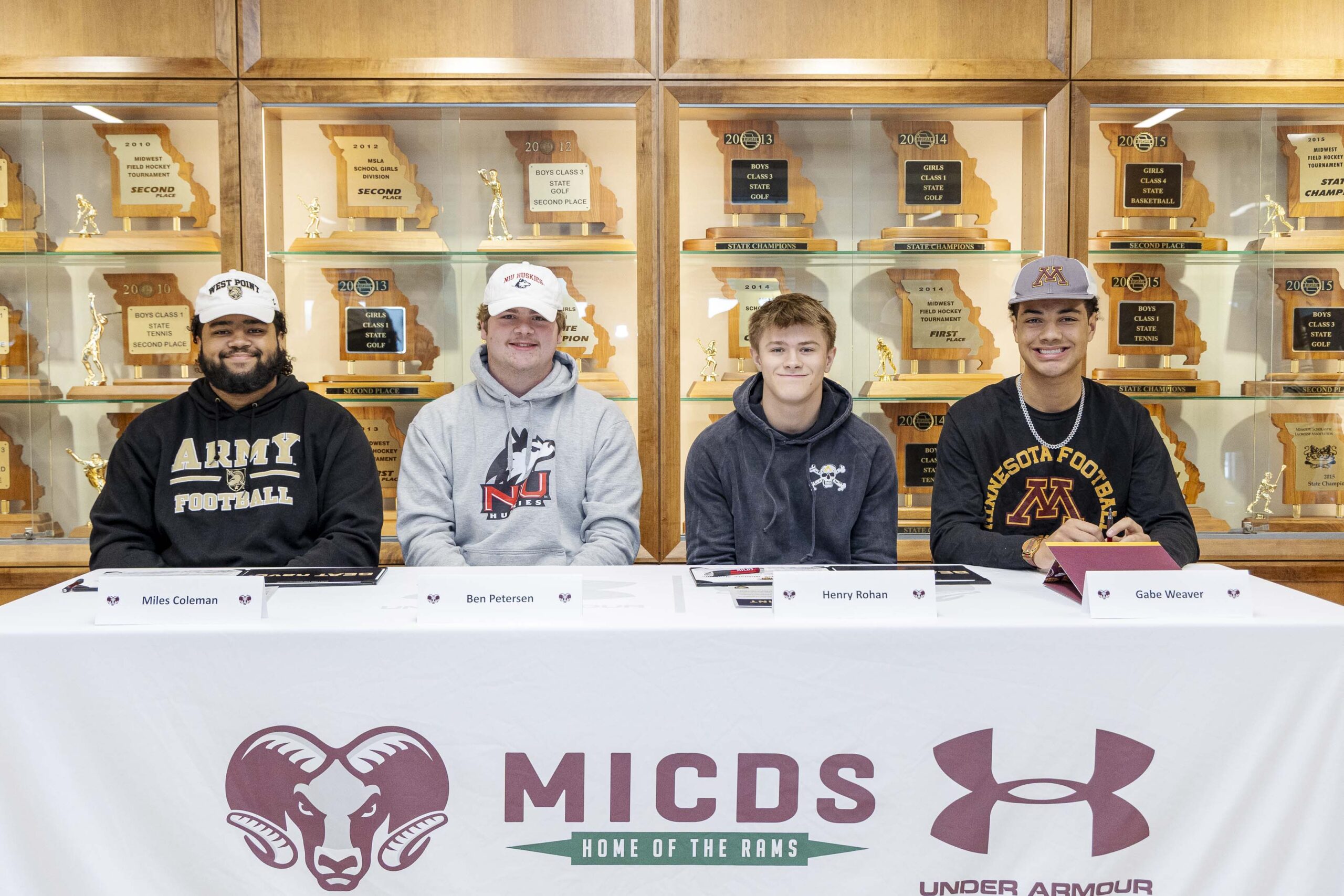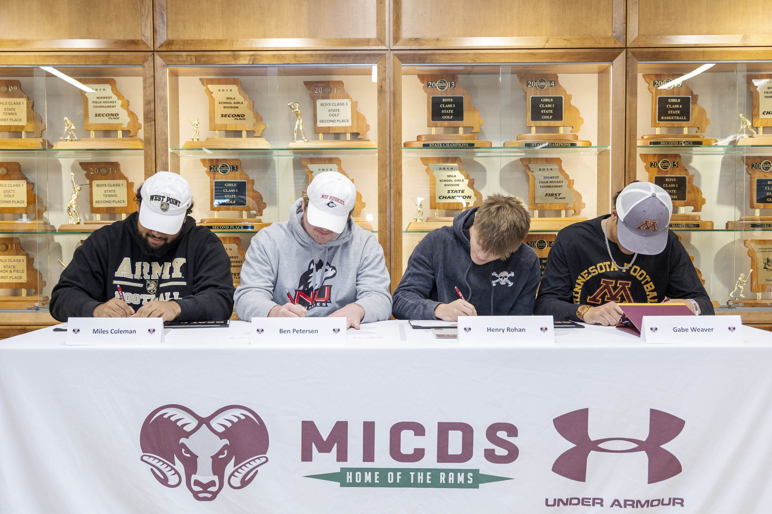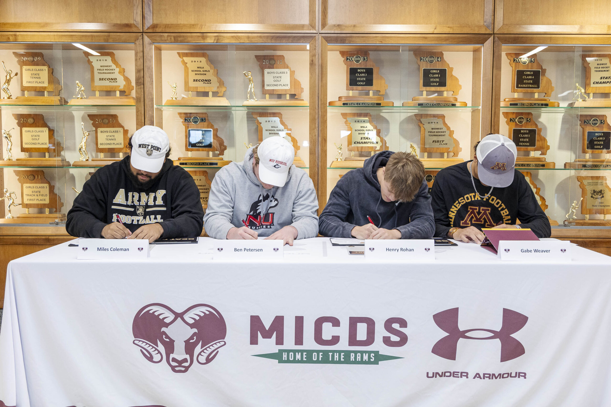 This week, four MICDS seniors signed early letters of intent to join collegiate-level football and track programs. The early signing ceremony follows one held on November 12 and precedes a larger event in February that will include additional student-athletes committing to college athletics.