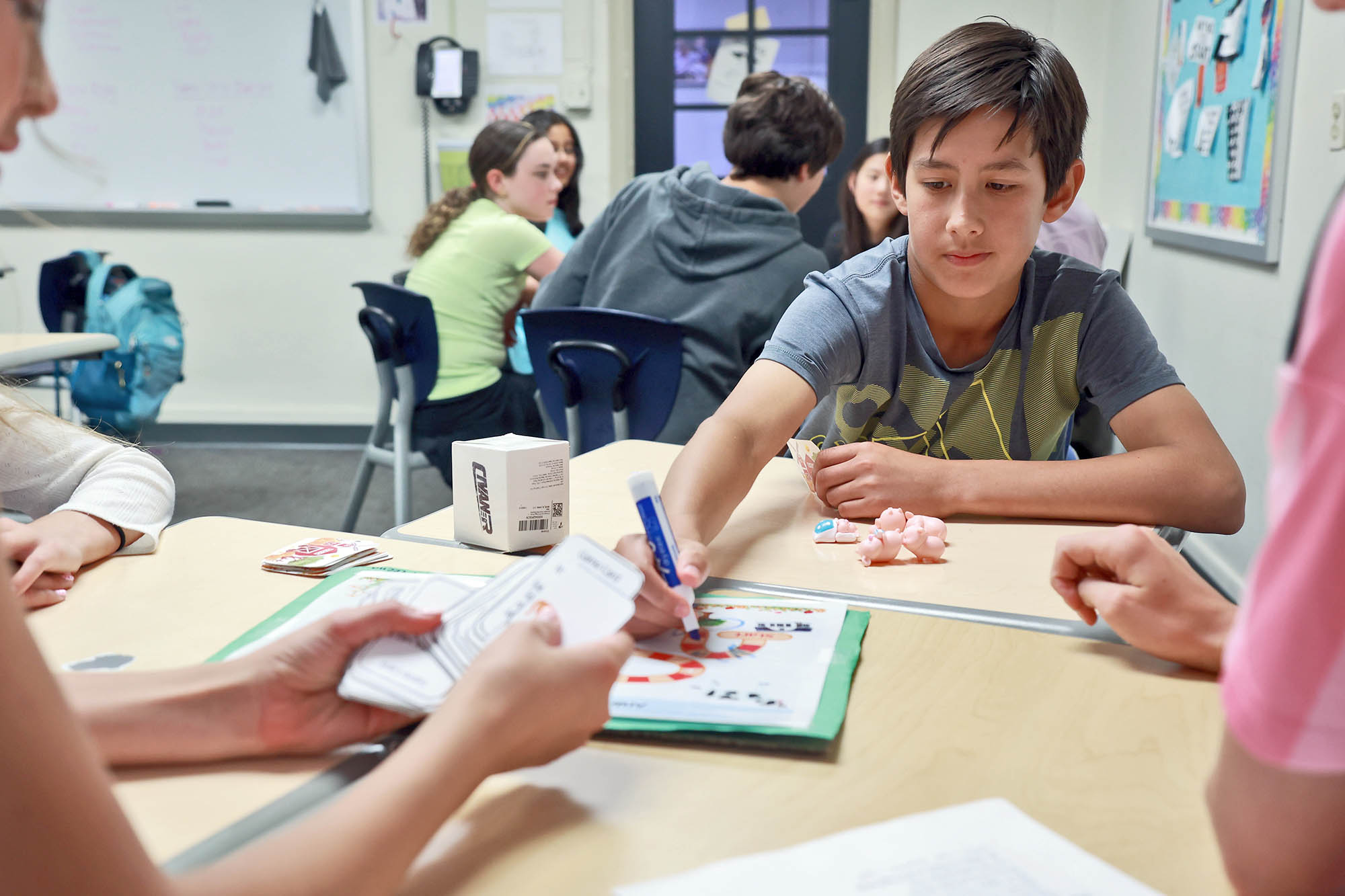 Caulfield and Halverson picked up the games and transported them to the Middle School, since by then the seniors had graduated. “I was super excited when my senior soccer player, CeCe Harris, told me about the senior board games she made in Ms. Prince’s class,” said Caulfield. “I love that we were able to make a connection with the work done in the Upper School.”
