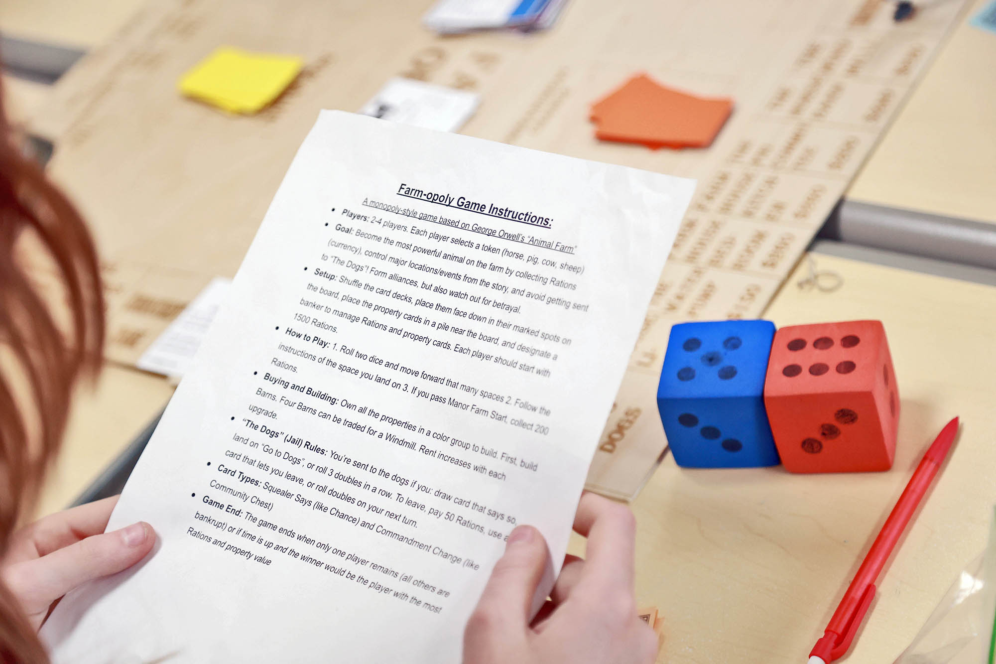 Leena Daud ’25 mentioned that her seventh-grade brother, Samir ’30, was reading Animal Farm, which made it more intriguing to her classmates. CeCe Harris ’25 is on the varsity Girls Soccer team and, after her ALT class chose the book, shared with her coach that they were creating board games. The connection was inevitable.