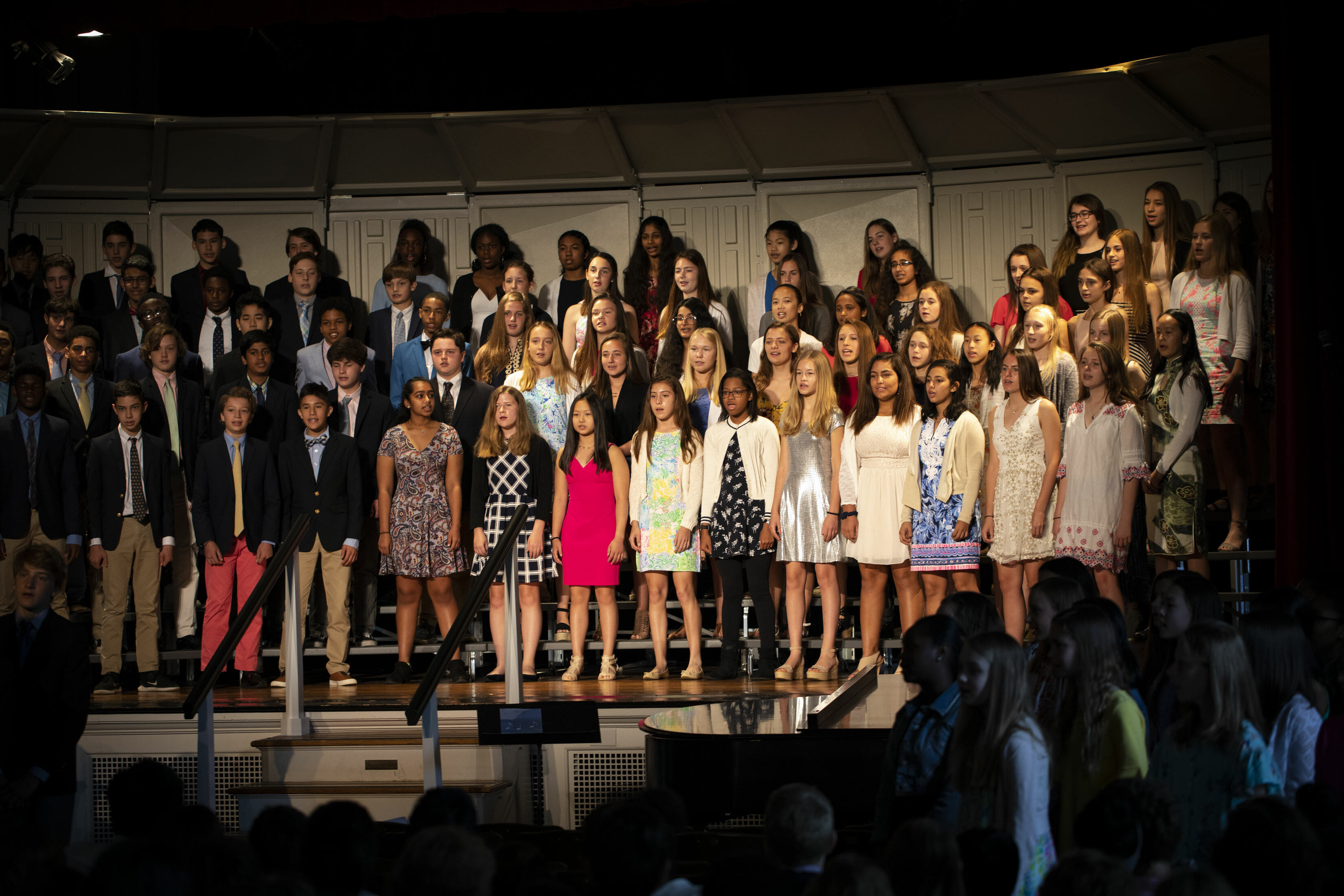 As the class of 2024 exited the stage and made way for the 8th graders, Mr. Jason Roberts, the Middle School Choir Director, led the audience in a series of movements that filled Eliot Chapel with the sounds of a rainforest. Guests rubbed their hands together, snapped, and tapped their feet, creating a sonic rainfall inside.