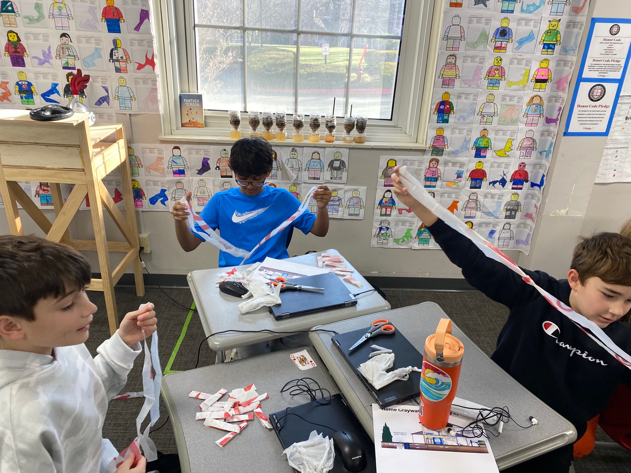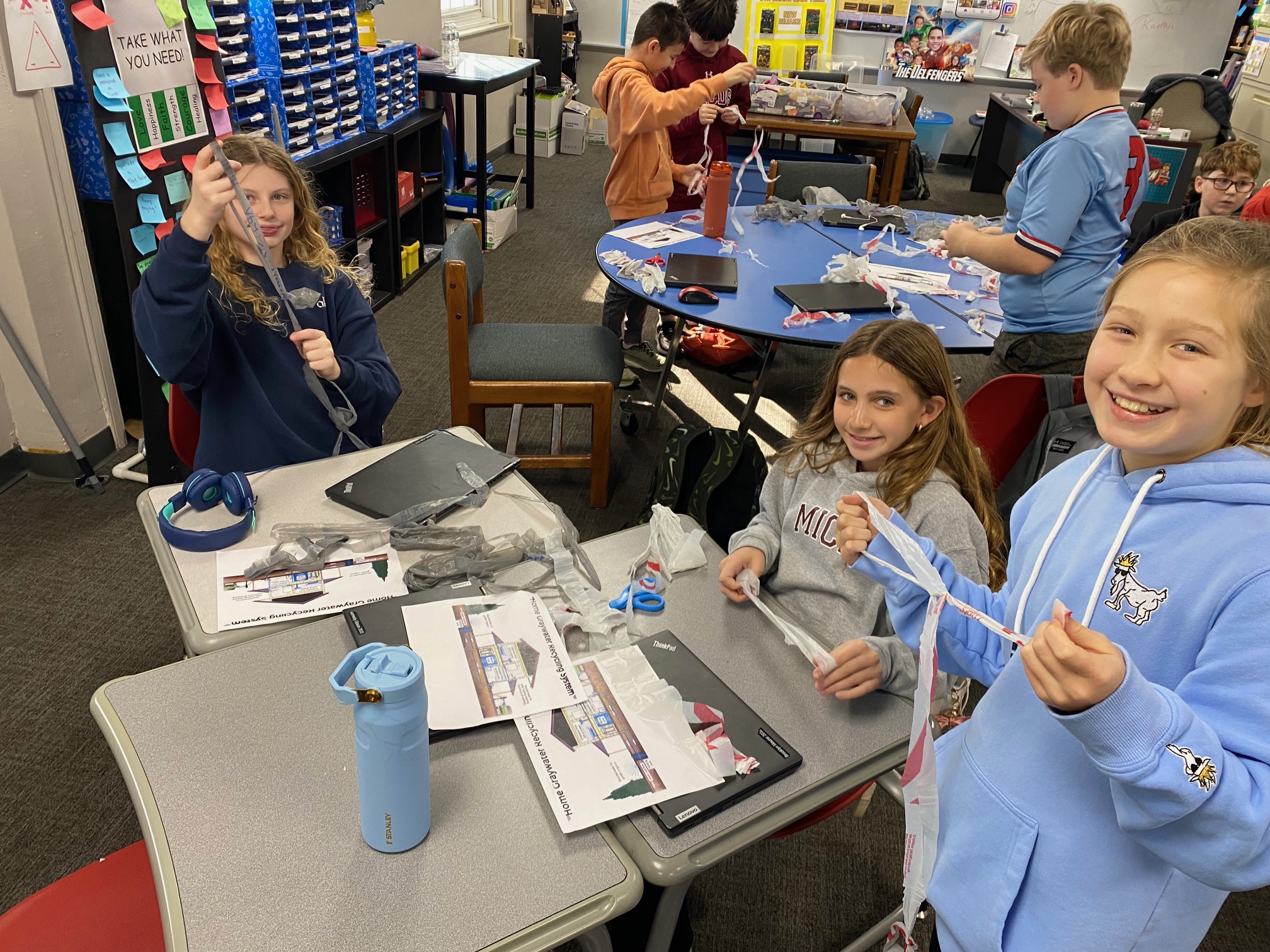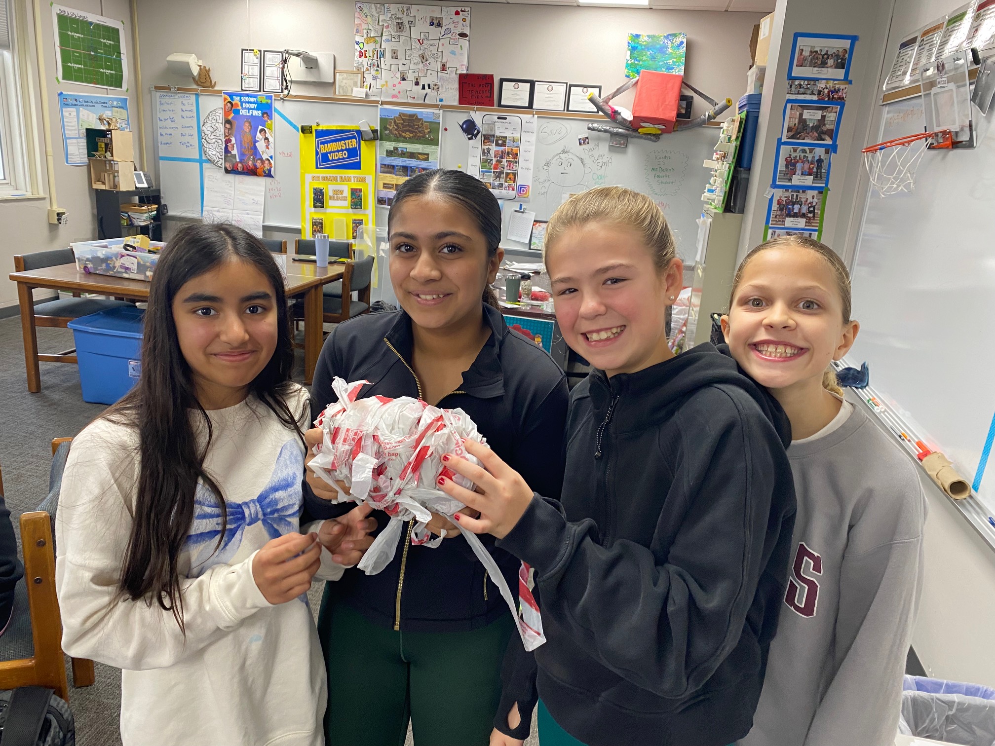 It’s important to reduce the reliance on single-use products, so the teaching team brought in a large number of plastic shopping bags. Sousa-Charleville showed students how to fold the bags into small triangles, reducing their volume and making them easier to store for reuse later. Students also cut the recycled plastic bags into strips that could be tied together to create a large ball of plastic yarn. This yarn could potentially be reused to create placemats, rugs, or reusable grocery bags. “With more time, students could have further upcycled the plastic yarn into finished products,” Delfin said. “This activity highlighted the environmental impact of plastic grocery bags, which are not biodegradable.”