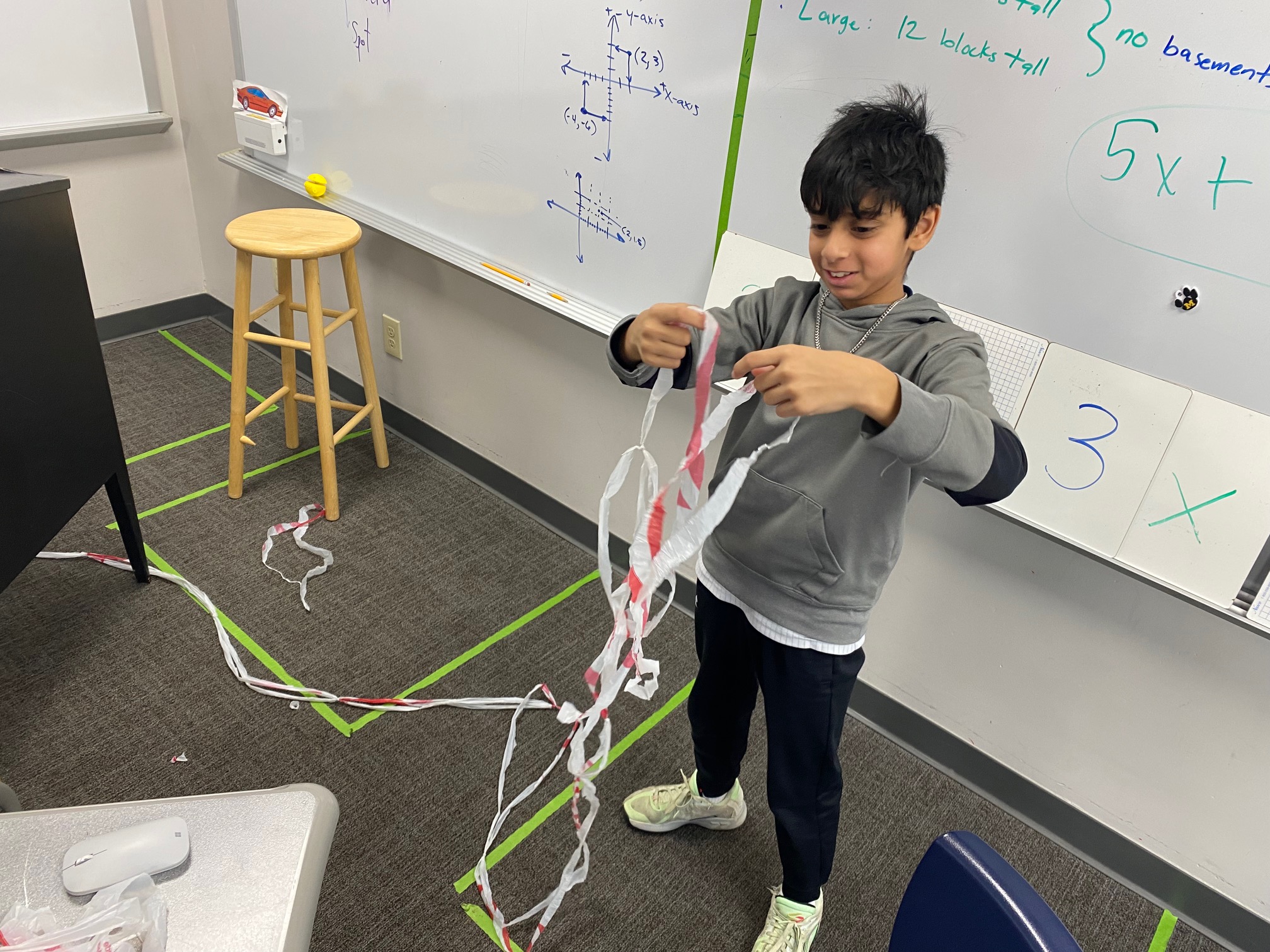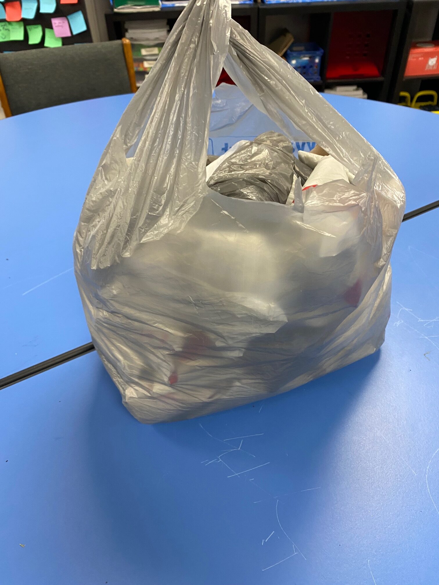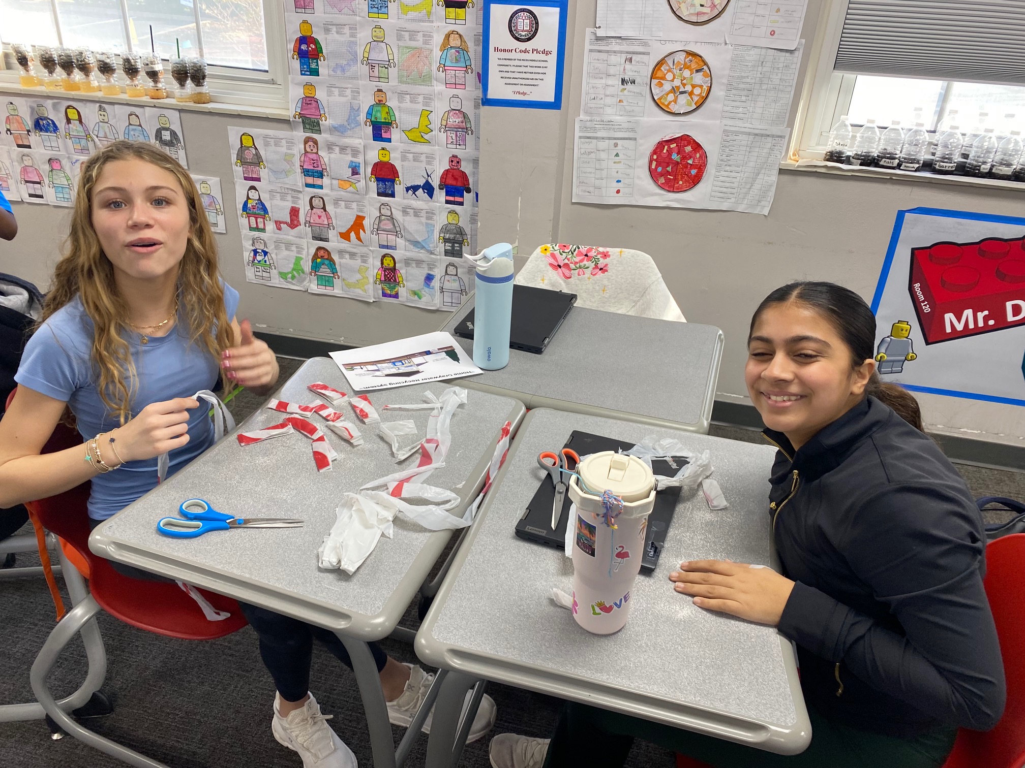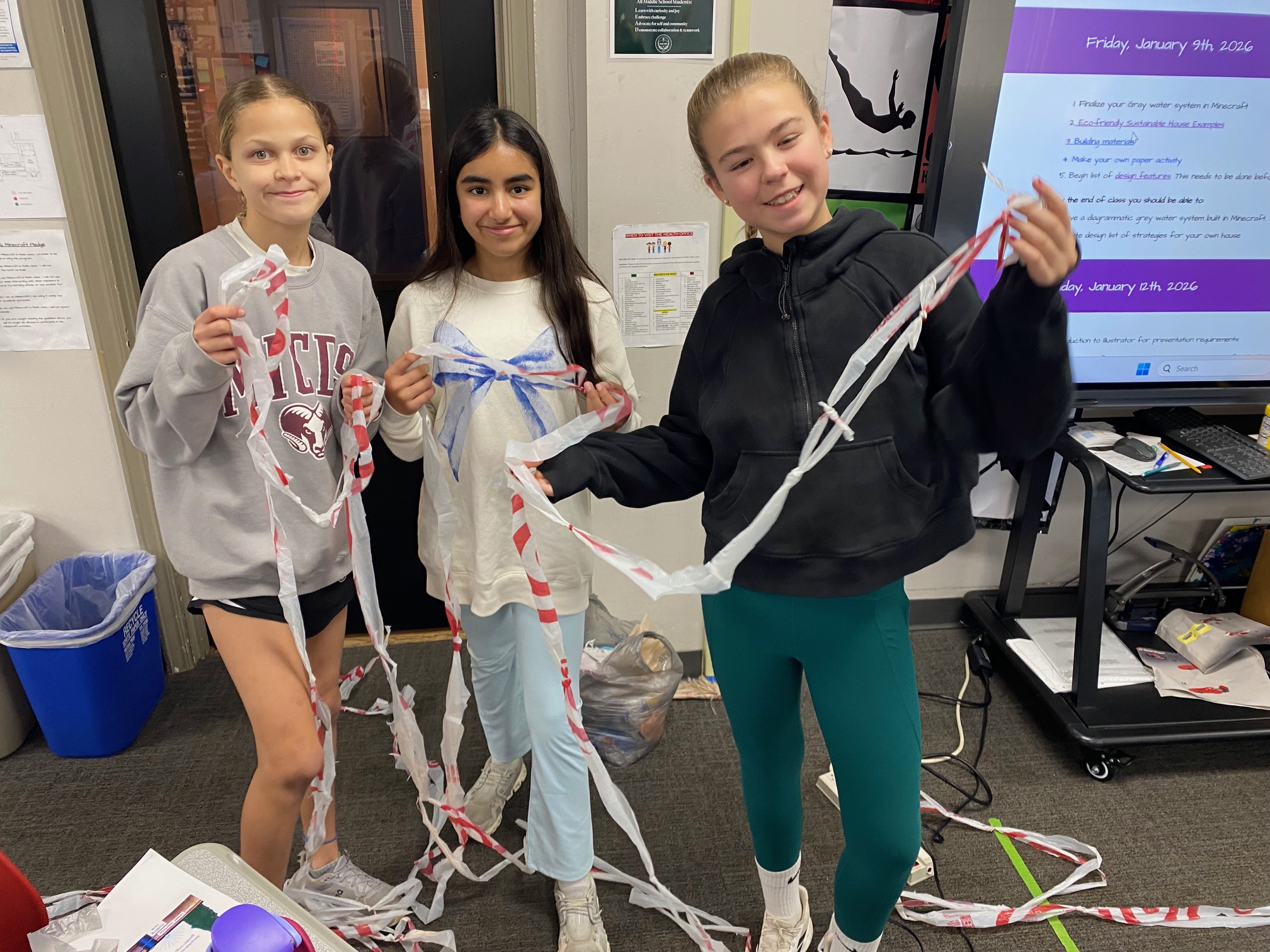 It’s important to reduce the reliance on single-use products, so the teaching team brought in a large number of plastic shopping bags. Sousa-Charleville showed students how to fold the bags into small triangles, reducing their volume and making them easier to store for reuse later. Students also cut the recycled plastic bags into strips that could be tied together to create a large ball of plastic yarn. This yarn could potentially be reused to create placemats, rugs, or reusable grocery bags. “With more time, students could have further upcycled the plastic yarn into finished products,” Delfin said. “This activity highlighted the environmental impact of plastic grocery bags, which are not biodegradable.”