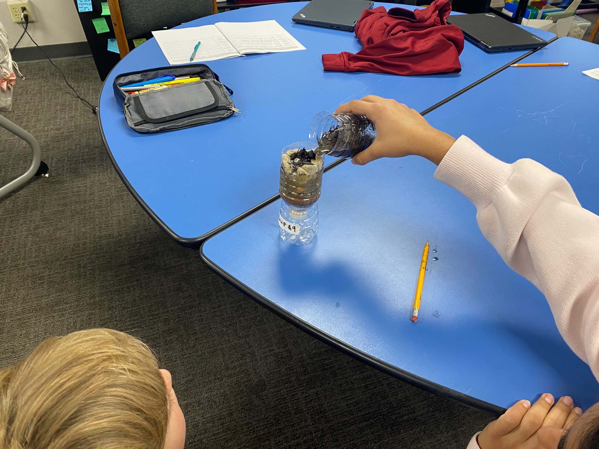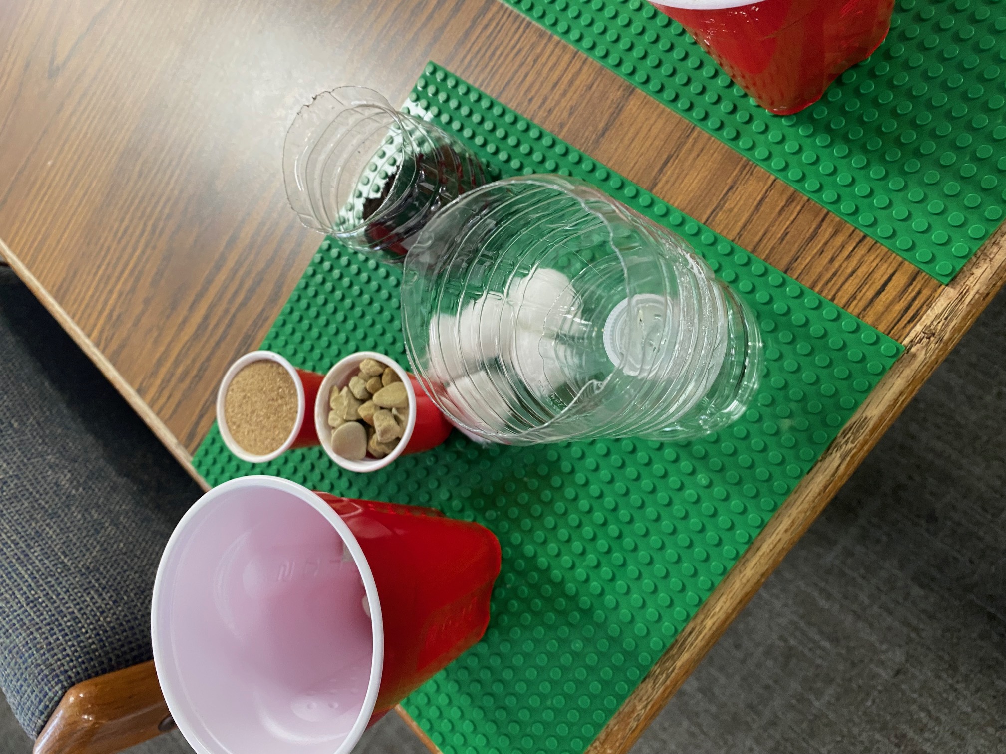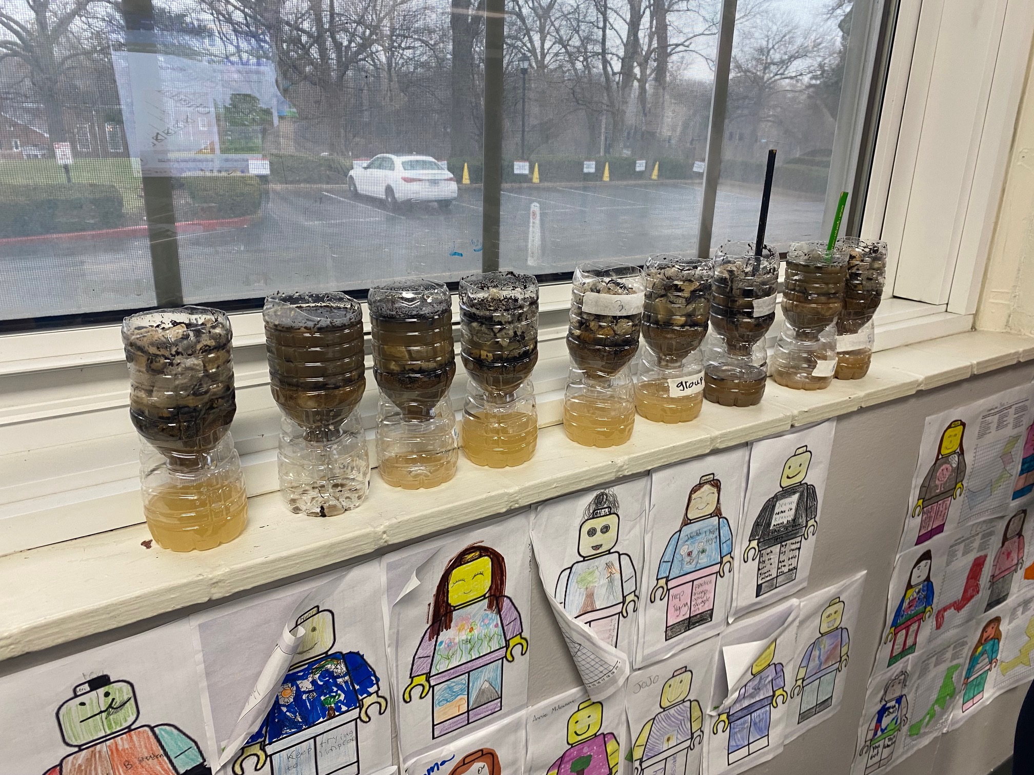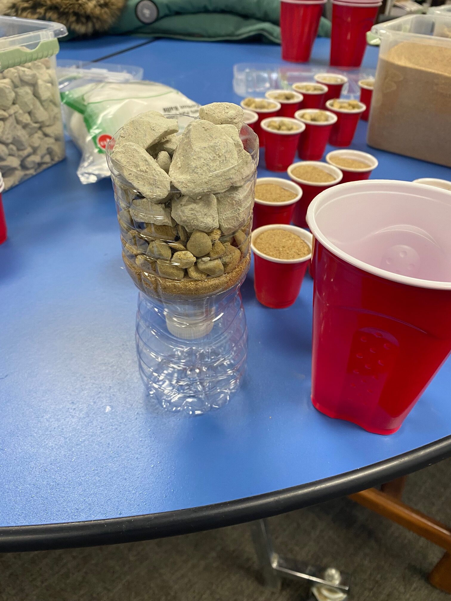 These young engineers then created their own water-filtering systems using recycled water bottles. After cutting the bottles in half, students flipped the top portion upside down and layered various materials inside. The bottom layer consisted of cotton balls, followed by sand, small pebbles, and, finally, larger rocks at the top. This activity demonstrated how filtration systems can help clean dirty water.