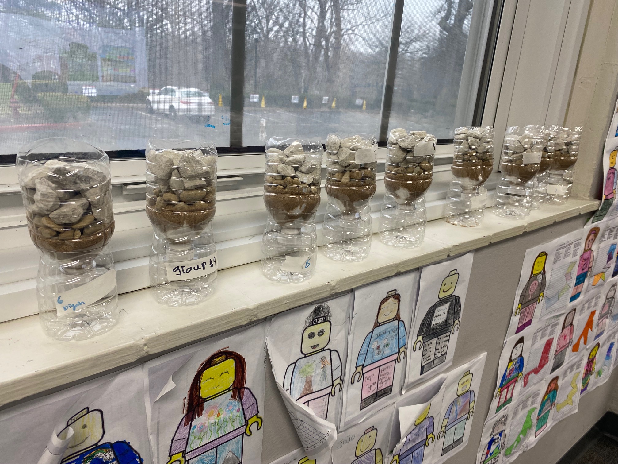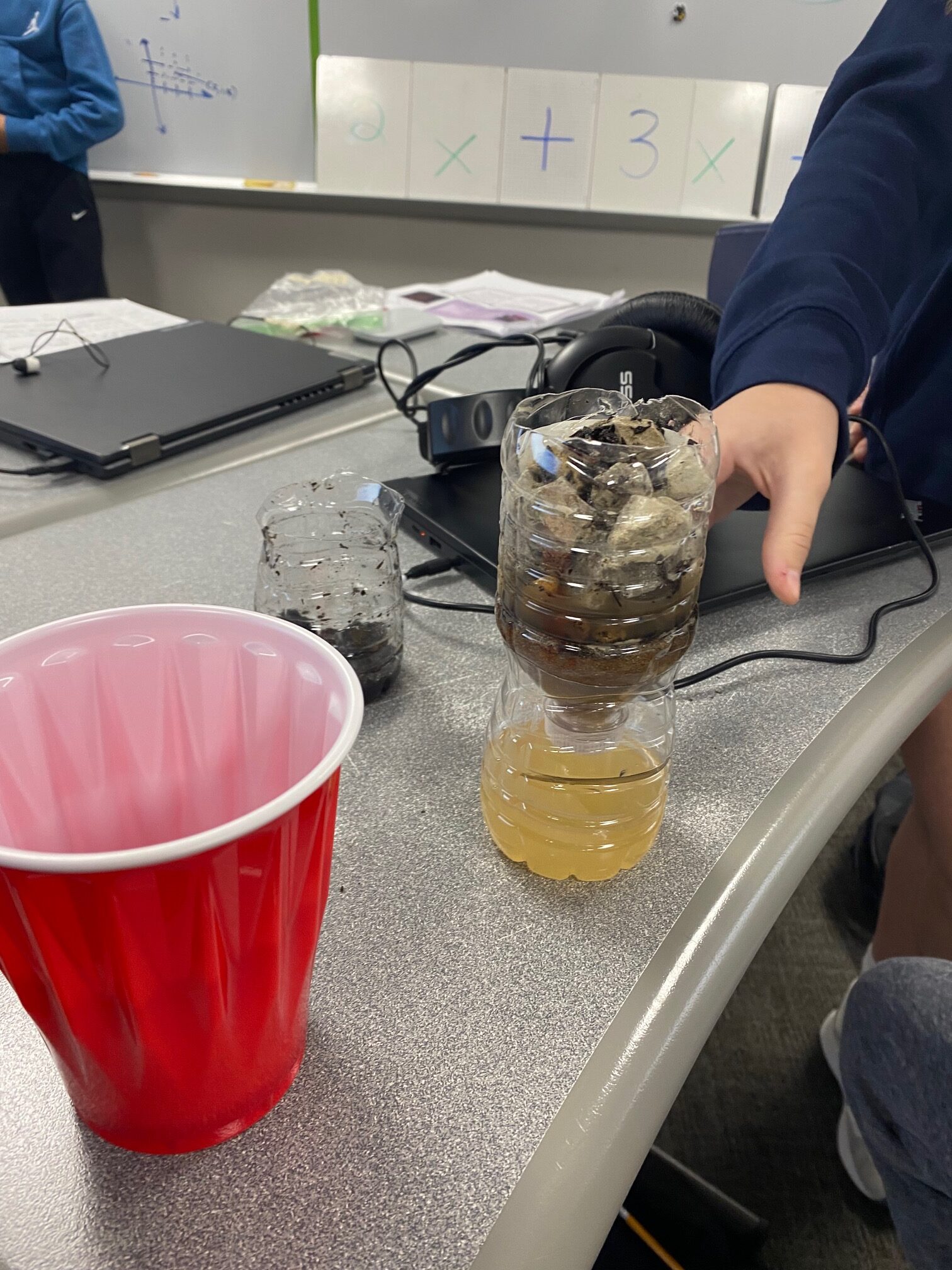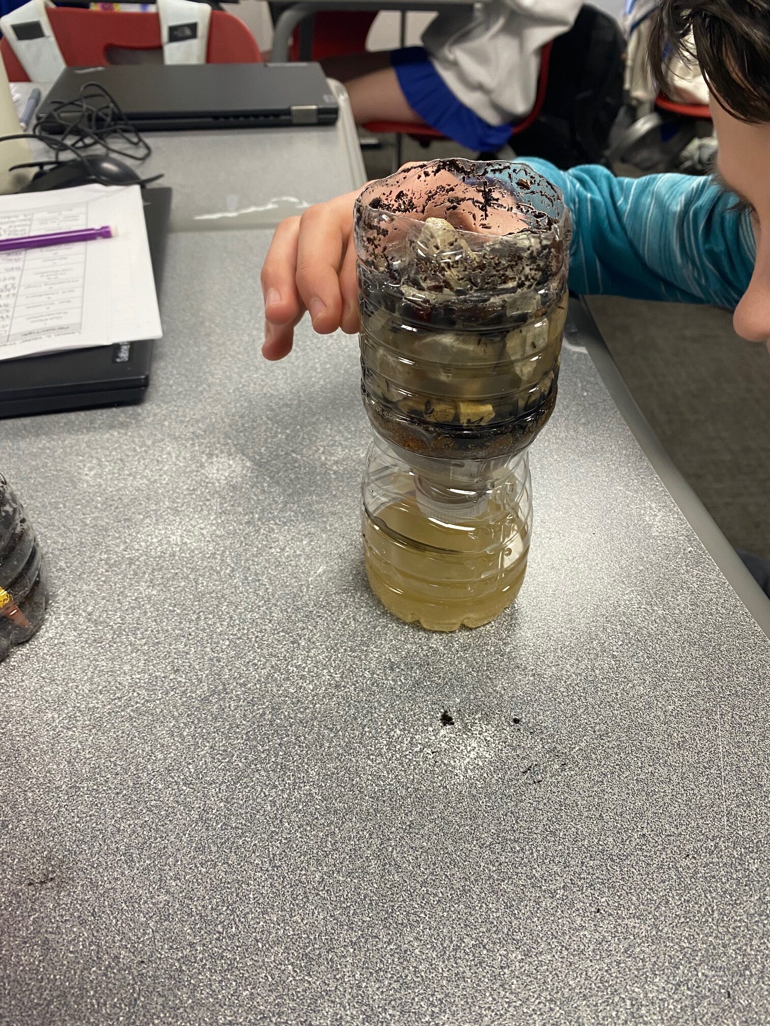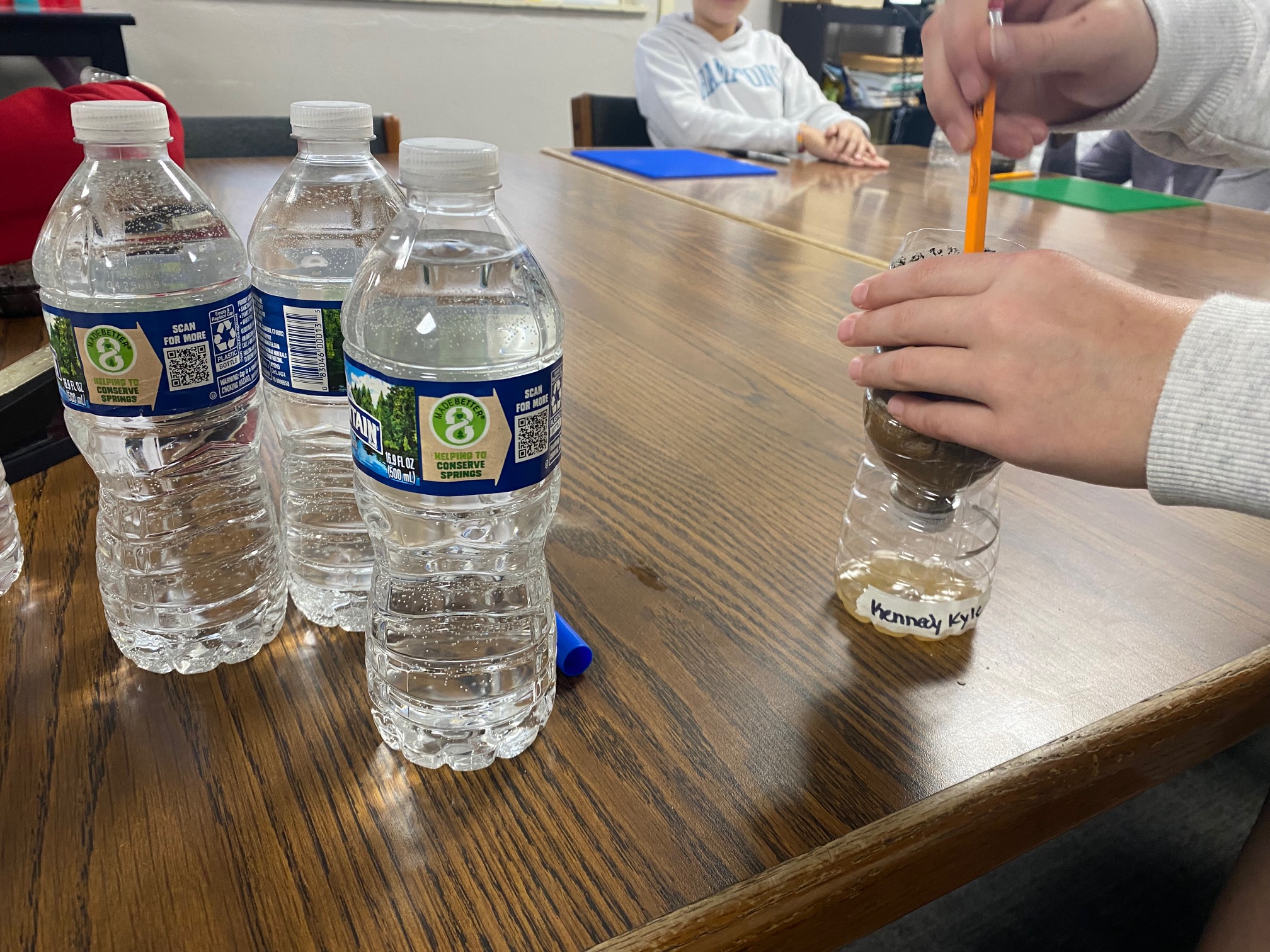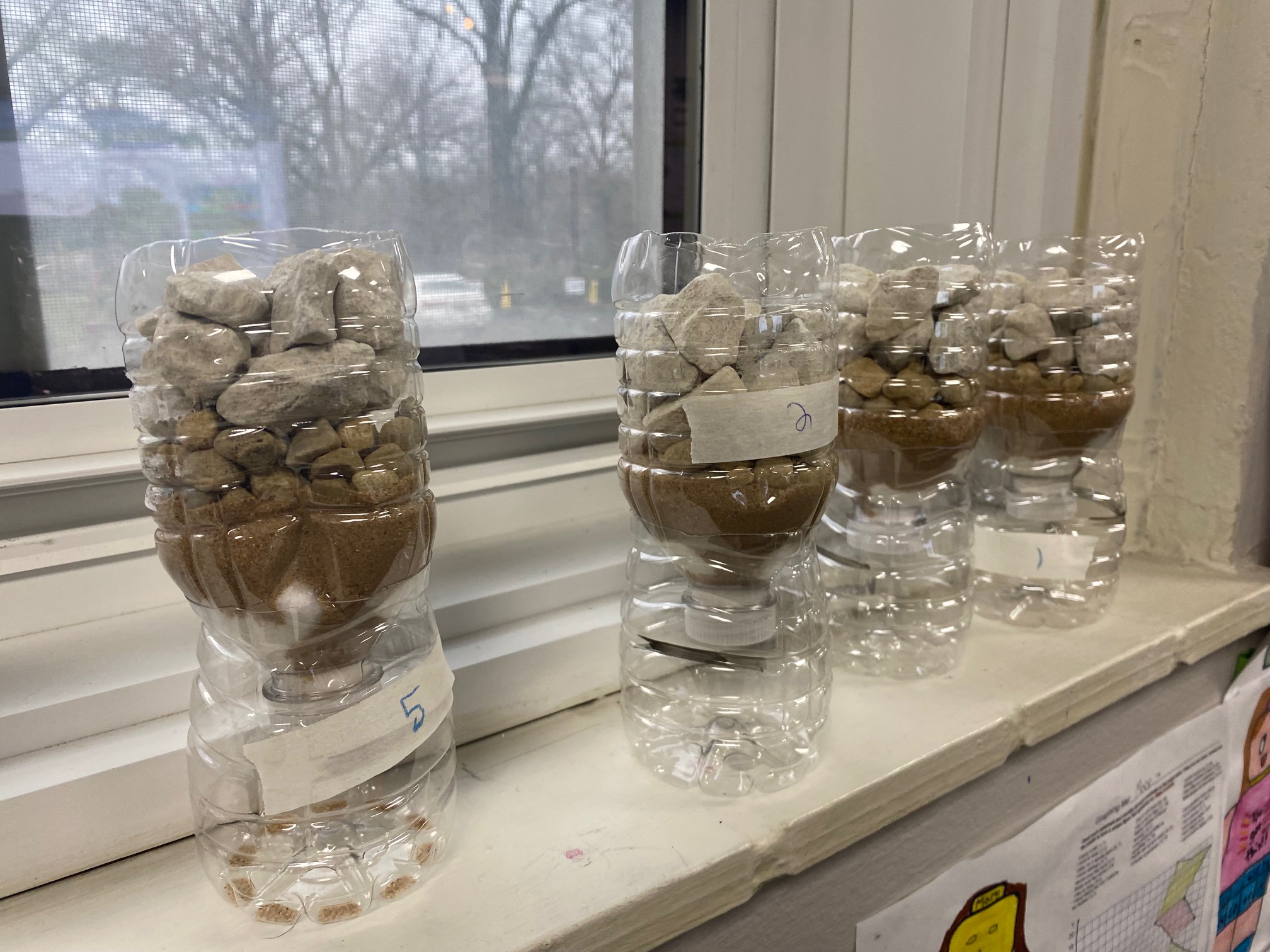 These young engineers then created their own water-filtering systems using recycled water bottles. After cutting the bottles in half, students flipped the top portion upside down and layered various materials inside. The bottom layer consisted of cotton balls, followed by sand, small pebbles, and, finally, larger rocks at the top. This activity demonstrated how filtration systems can help clean dirty water.