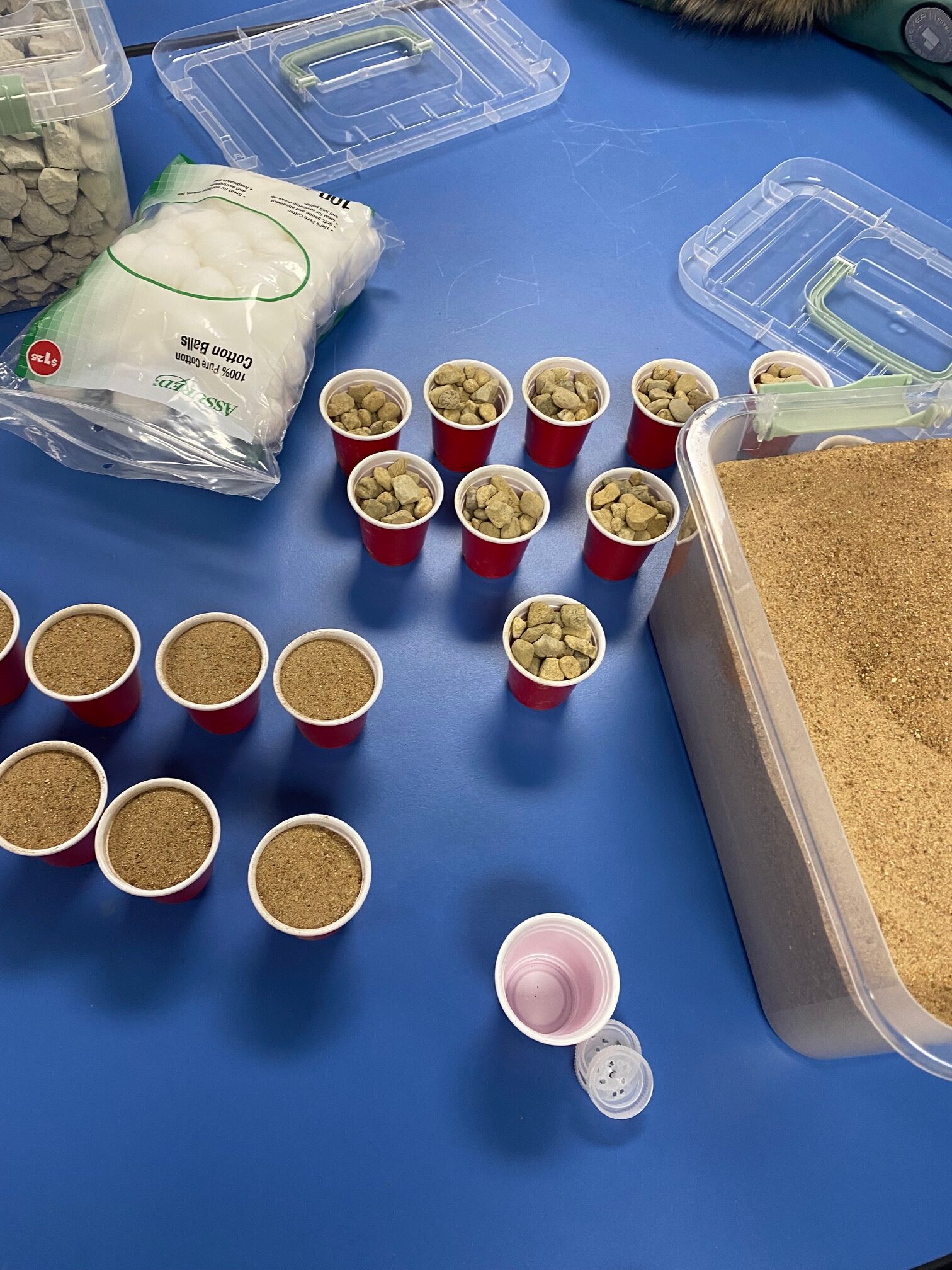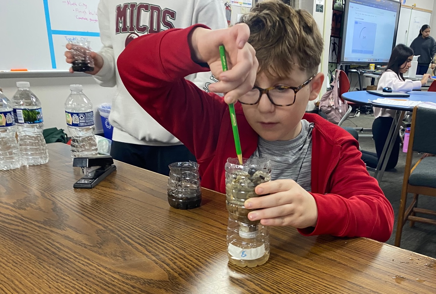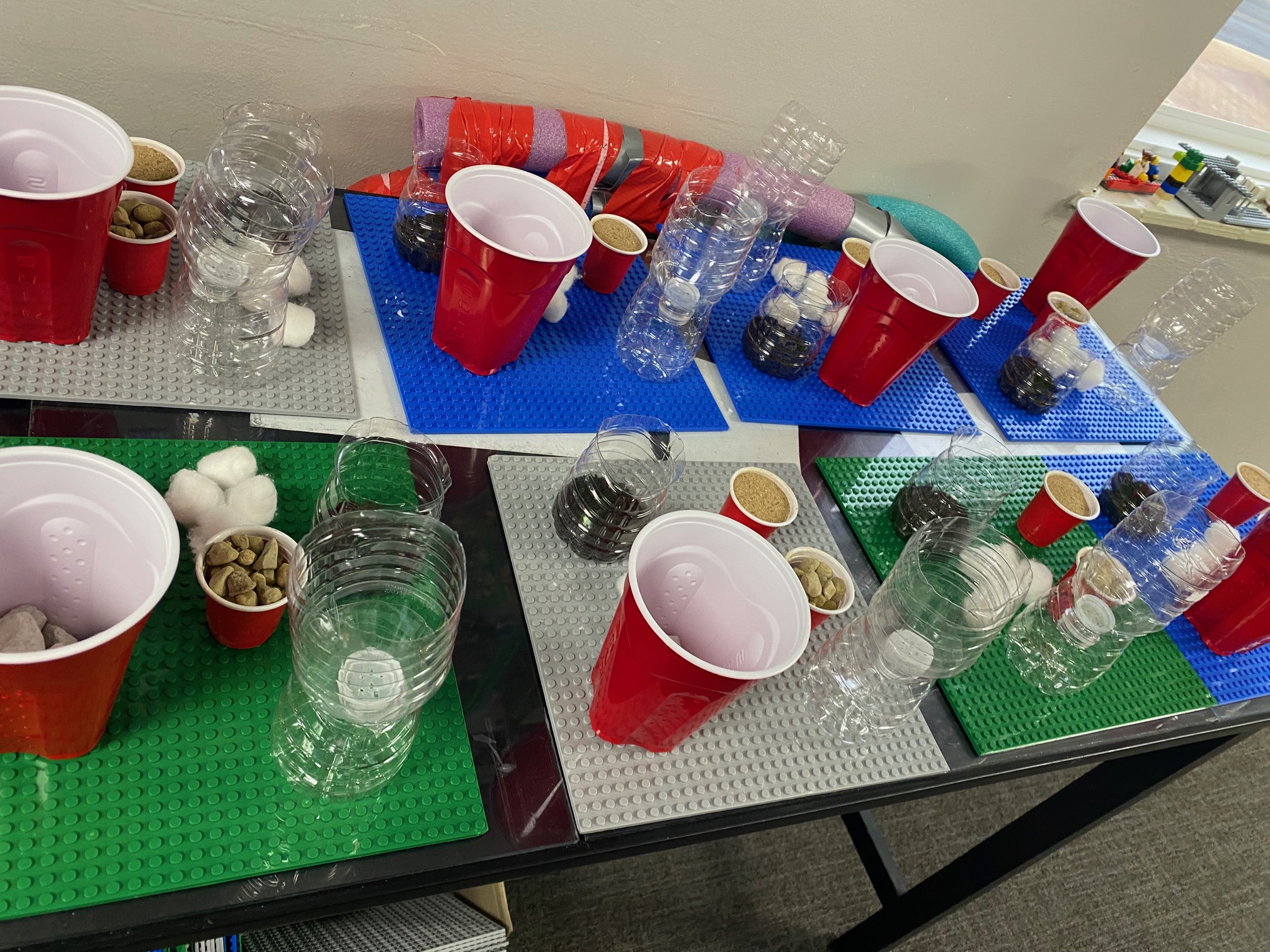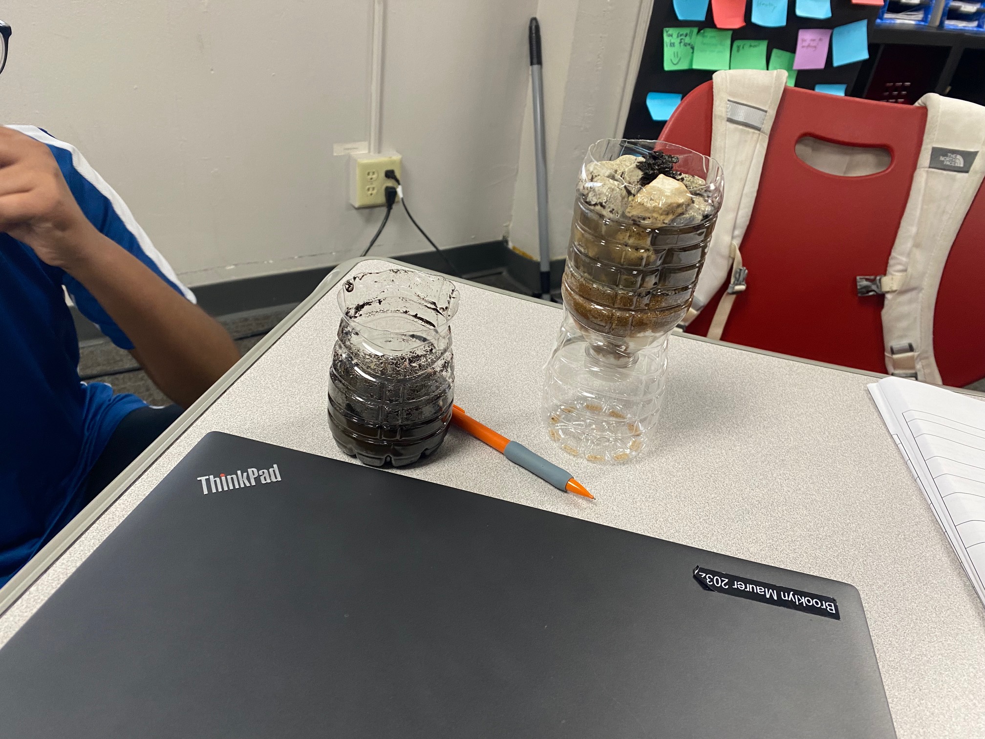 These young engineers then created their own water-filtering systems using recycled water bottles. After cutting the bottles in half, students flipped the top portion upside down and layered various materials inside. The bottom layer consisted of cotton balls, followed by sand, small pebbles, and, finally, larger rocks at the top. This activity demonstrated how filtration systems can help clean dirty water.