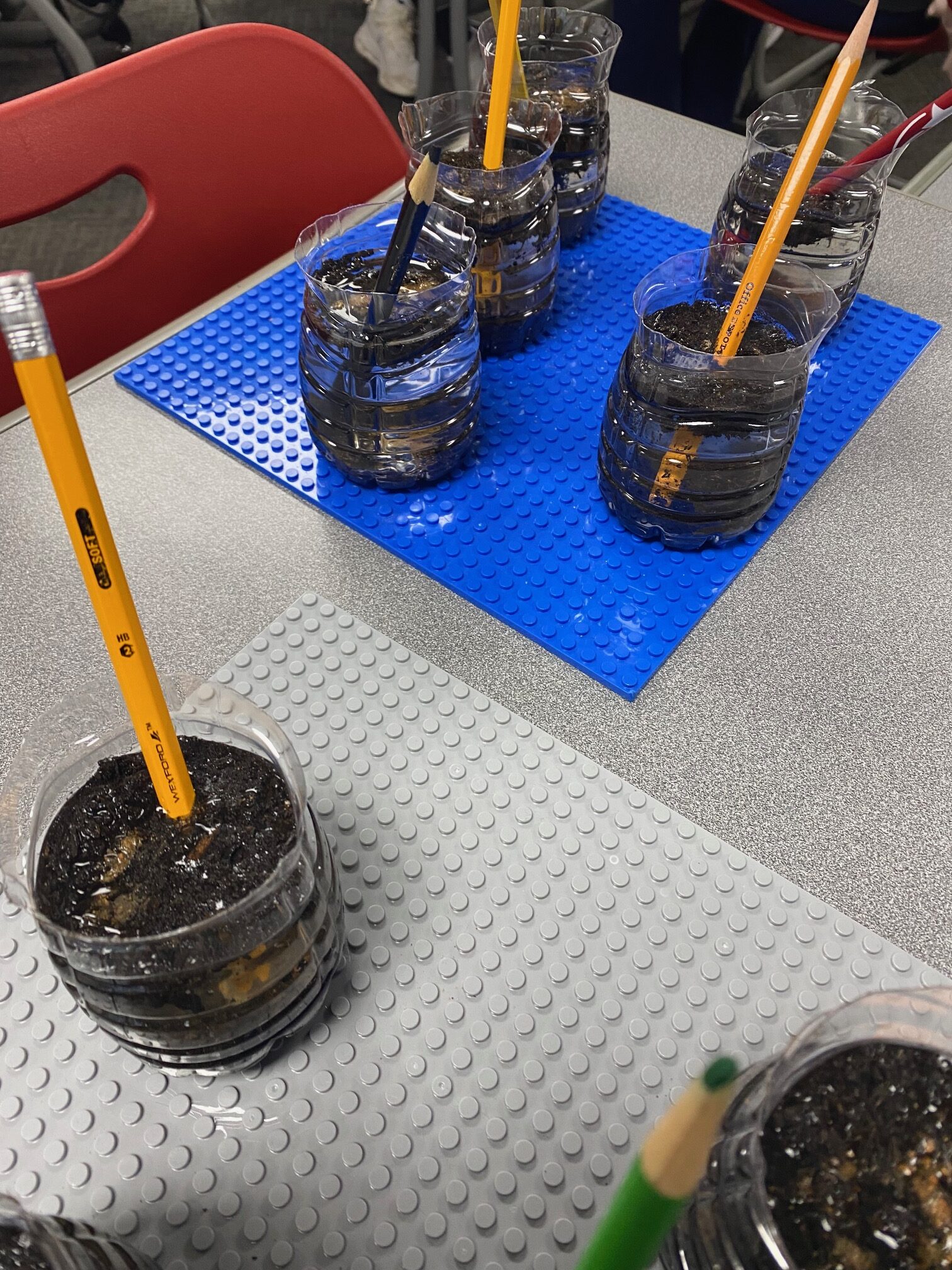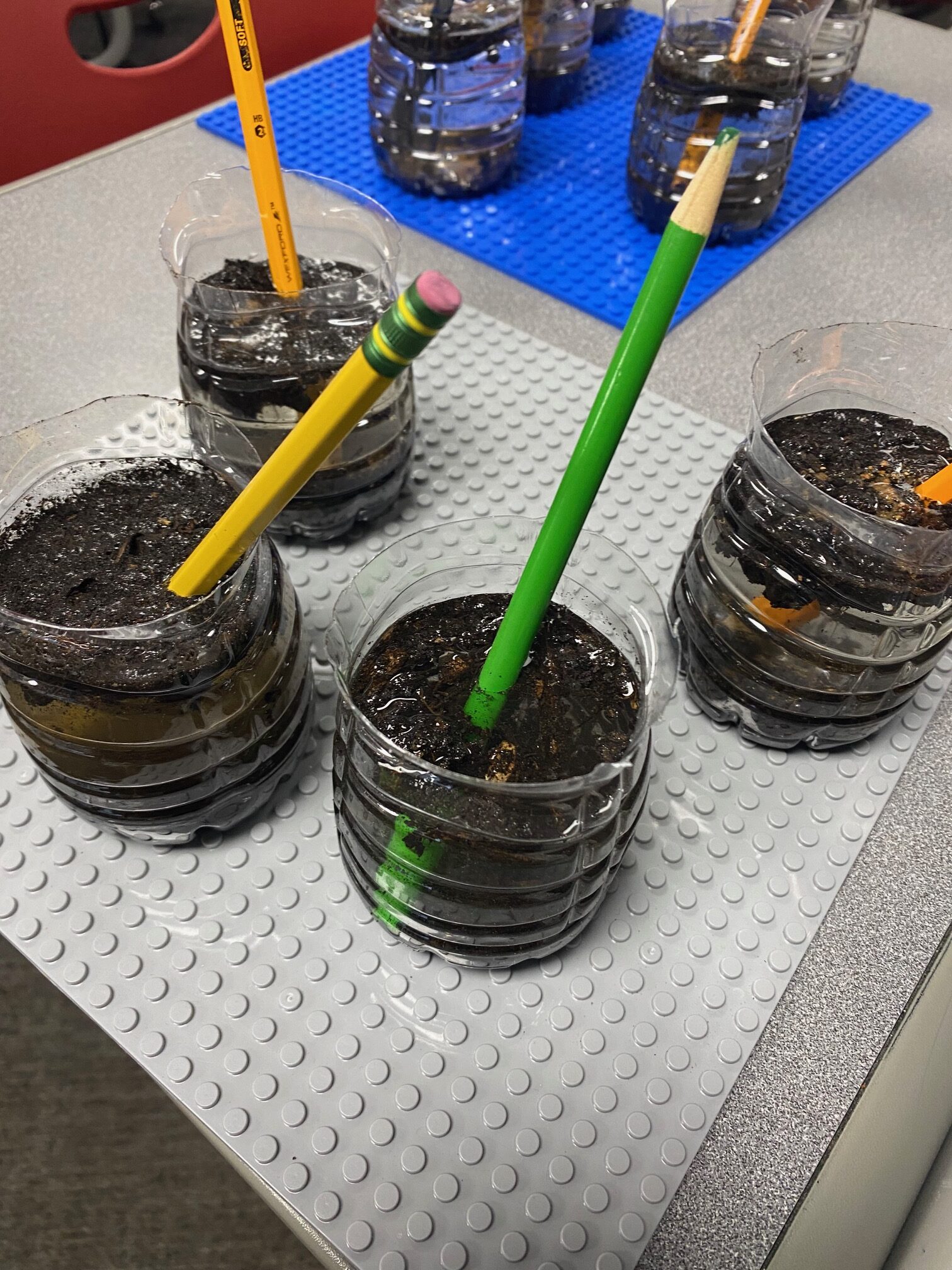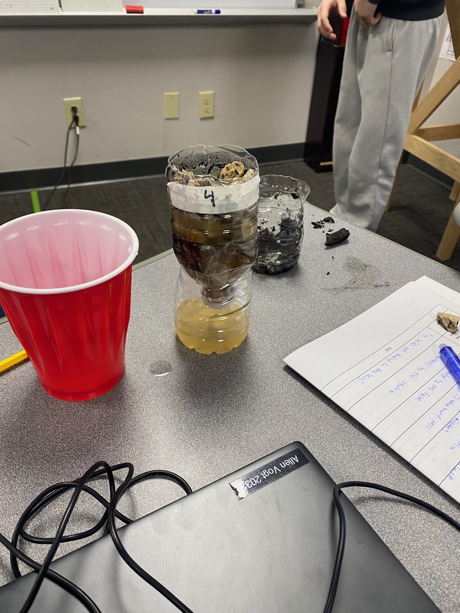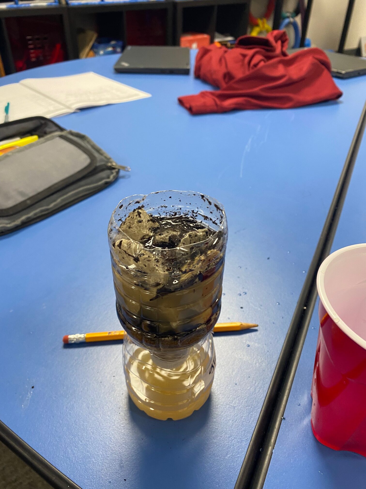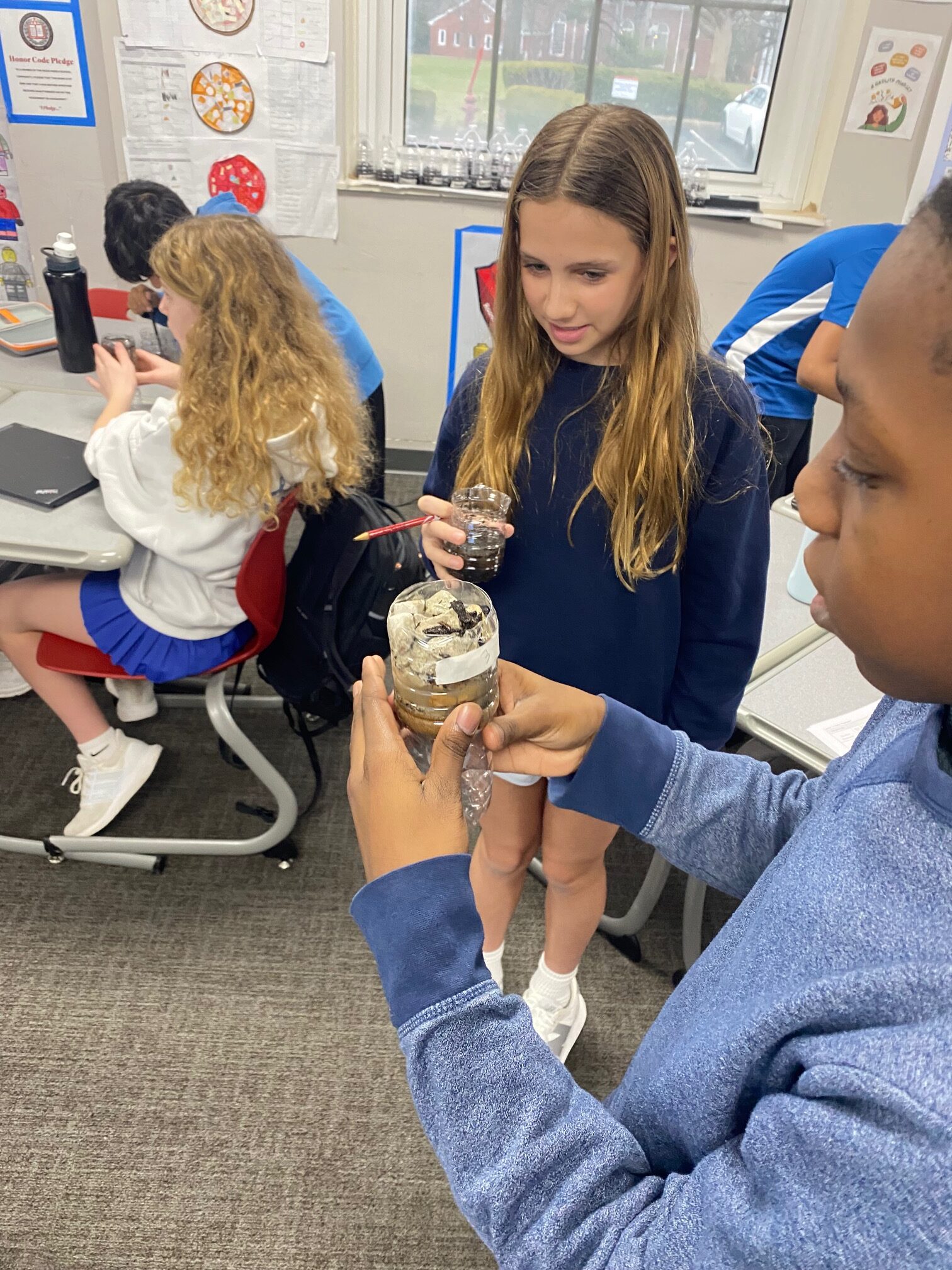 These young engineers then created their own water-filtering systems using recycled water bottles. After cutting the bottles in half, students flipped the top portion upside down and layered various materials inside. The bottom layer consisted of cotton balls, followed by sand, small pebbles, and, finally, larger rocks at the top. This activity demonstrated how filtration systems can help clean dirty water.