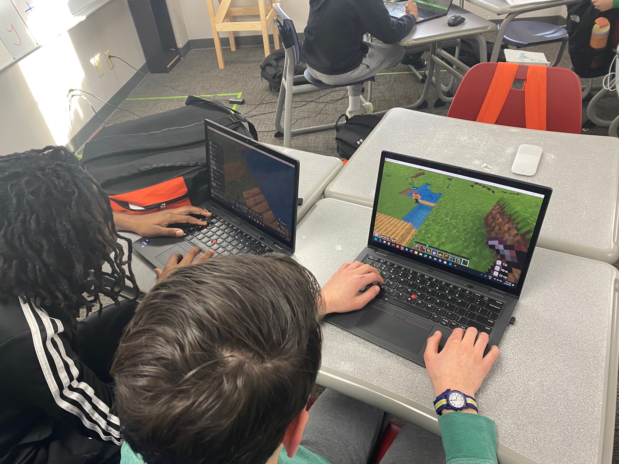 They spent the first couple of days researching various sustainable systems through Minecraft Education, which offers prebuilt worlds where students can explore and learn about different sustainability features. The Sustainable Minecraft City includes the lessons on food production, water treatment, green building, sustainable forestry, and energy-efficient housing.