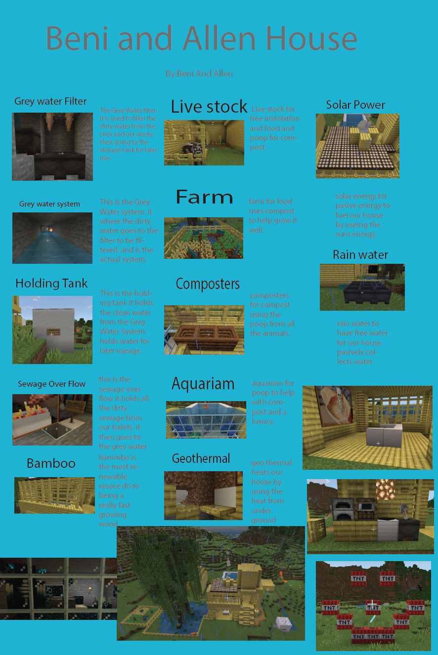 After students explored the Minecraft world focused on water treatment strategies, they learned about greywater systems. This system takes lightly used water from sinks or showers, stores it in an underground tank, runs it through pipes to a filtration system, then sends the cleaned water to a storage tank before returning it to the house for reuse in toilets, for laundry, and for watering lawns or gardens. While this is a complex system involving significant engineering, students built a diagrammatic version in Minecraft to help them better understand how the system works to conserve water.