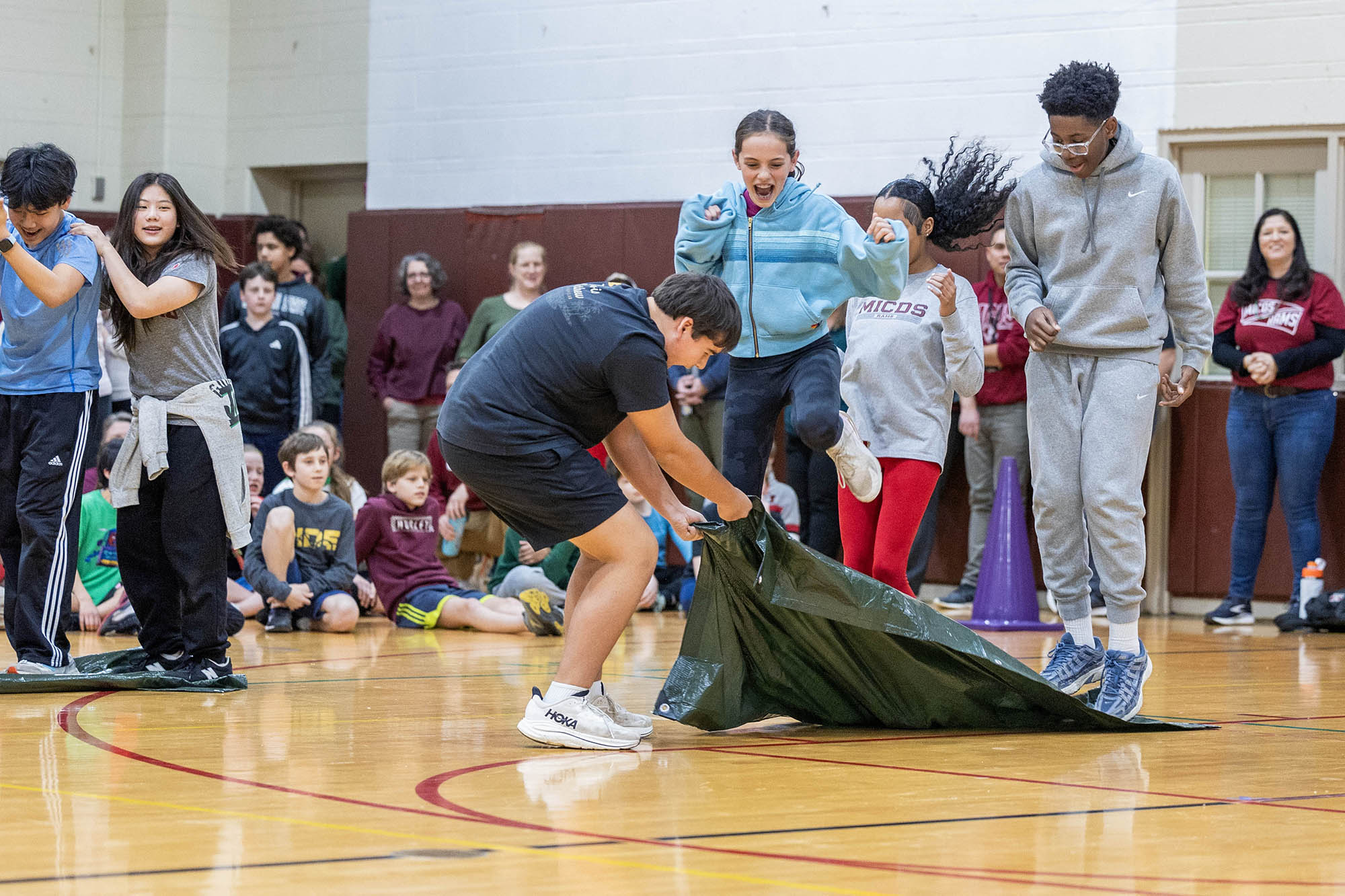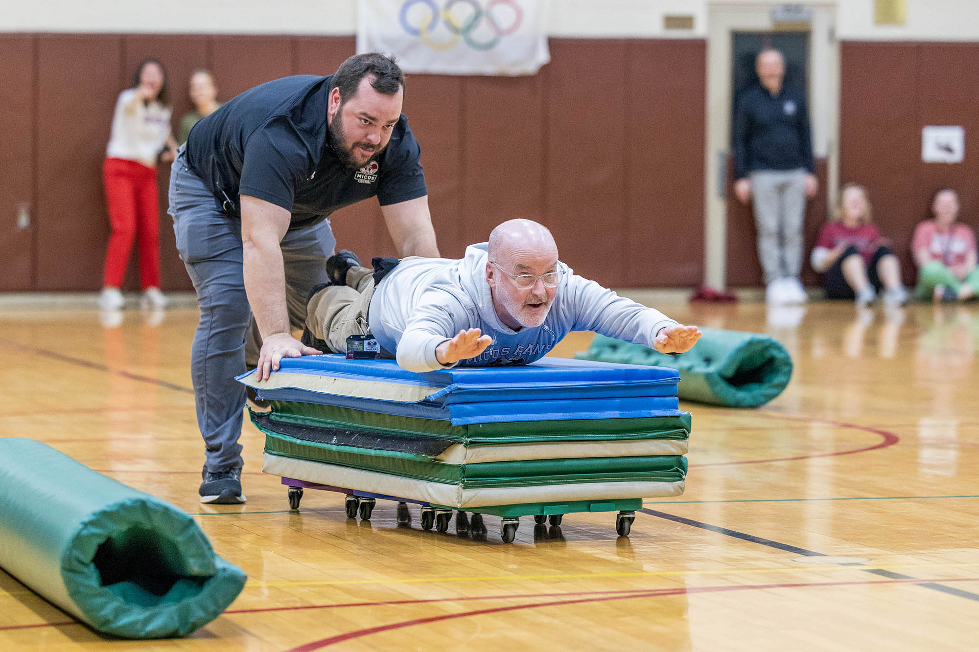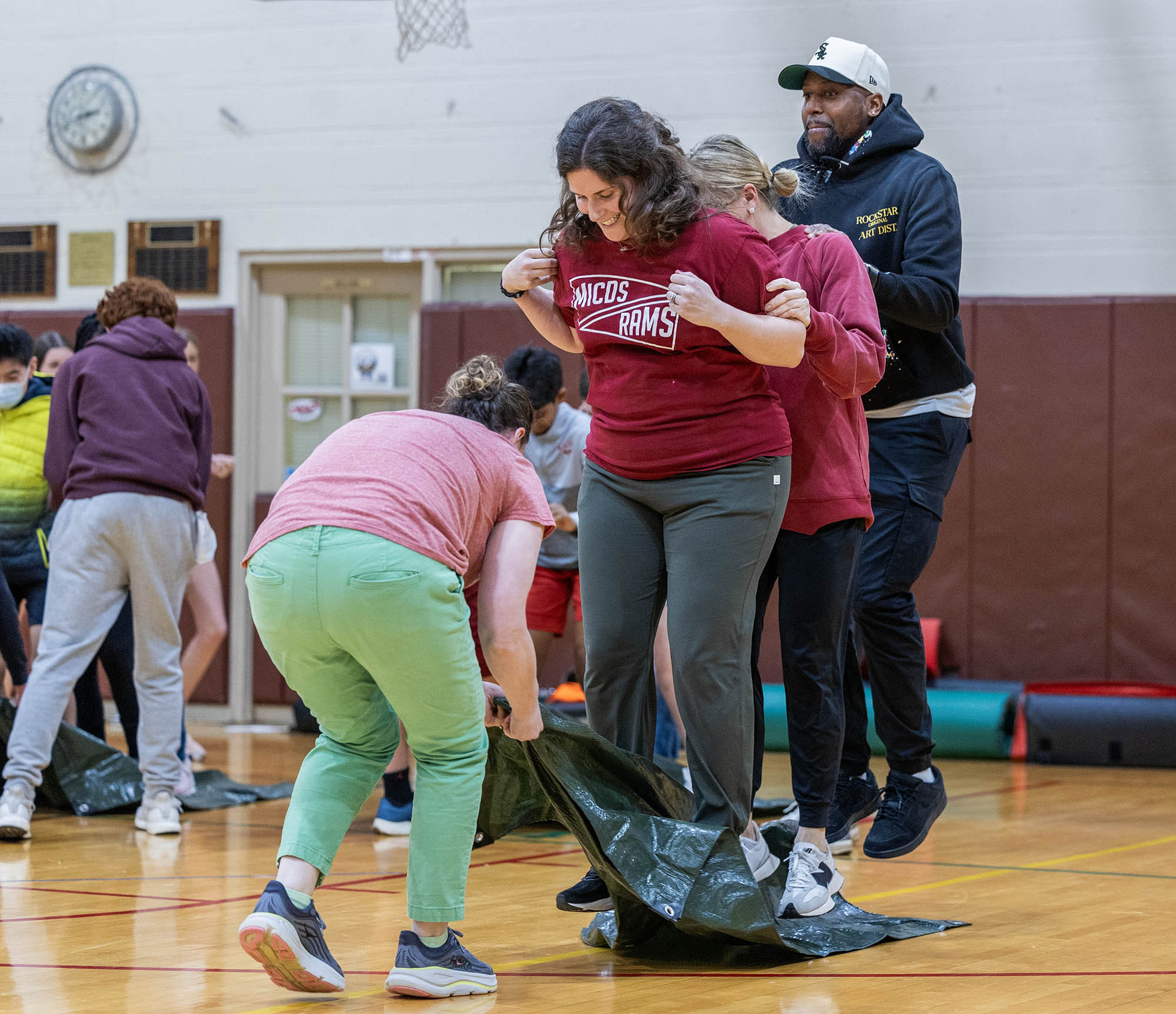 With spirits soaring, it was time for the first competition: the Tarp Pull. Students competed against faculty to pull their peers across the gym floor. They got creative, with team members coordinating jumps to try to make faster progress.