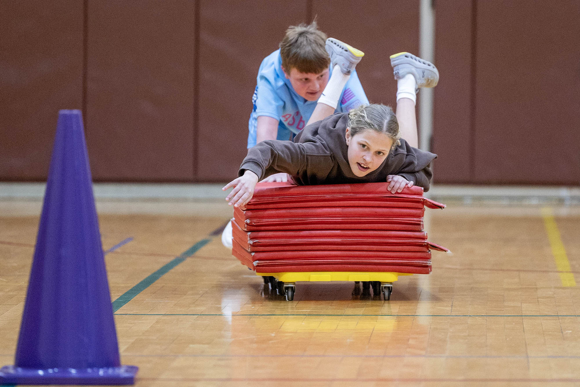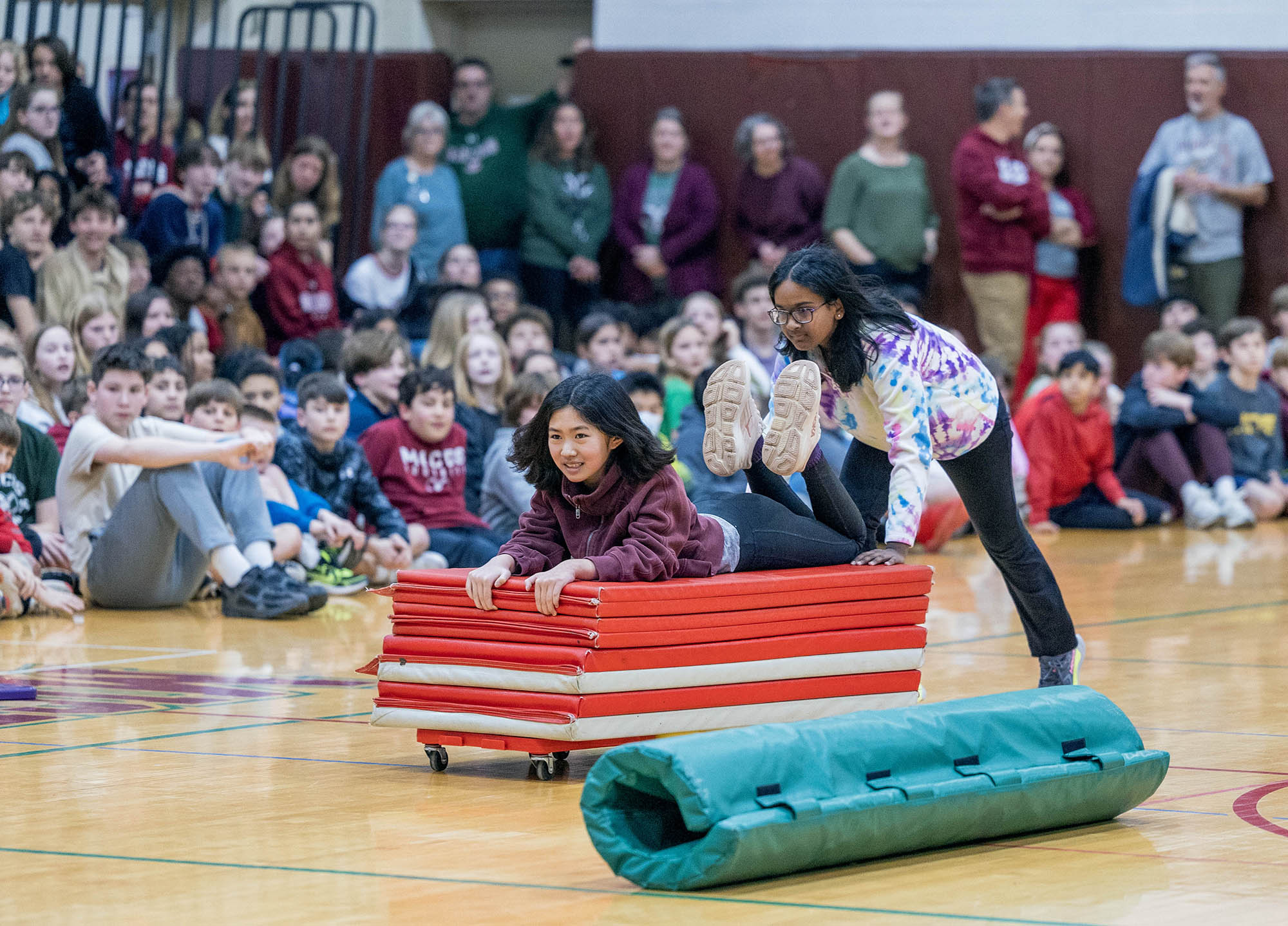 Did you know we have our own version of the Olympic sport of Bobsledding? It’s a bit safer, perhaps, but the participants compete with zeal. Mats piled on flat scooters and propelled by peers sent students and teachers zooming around the gym, to the delight of the audience.