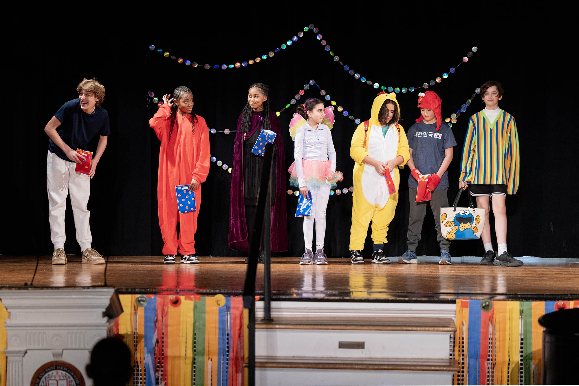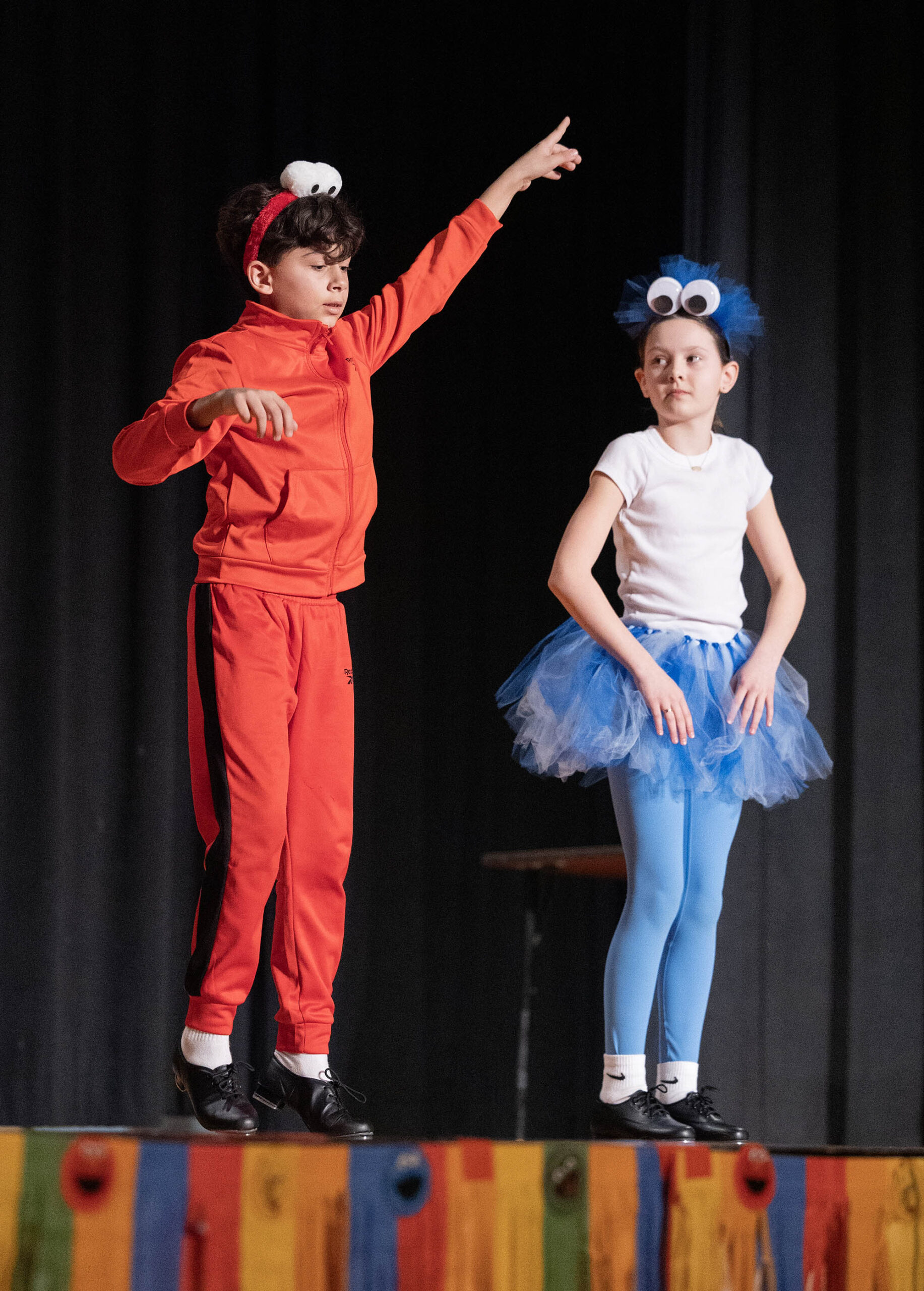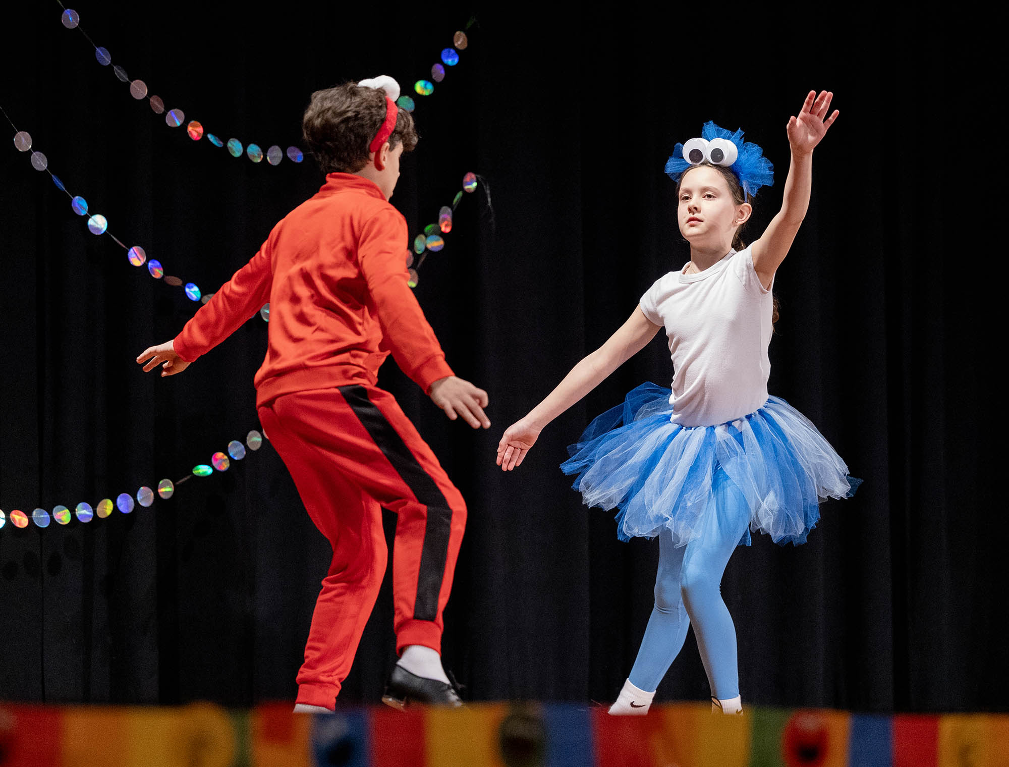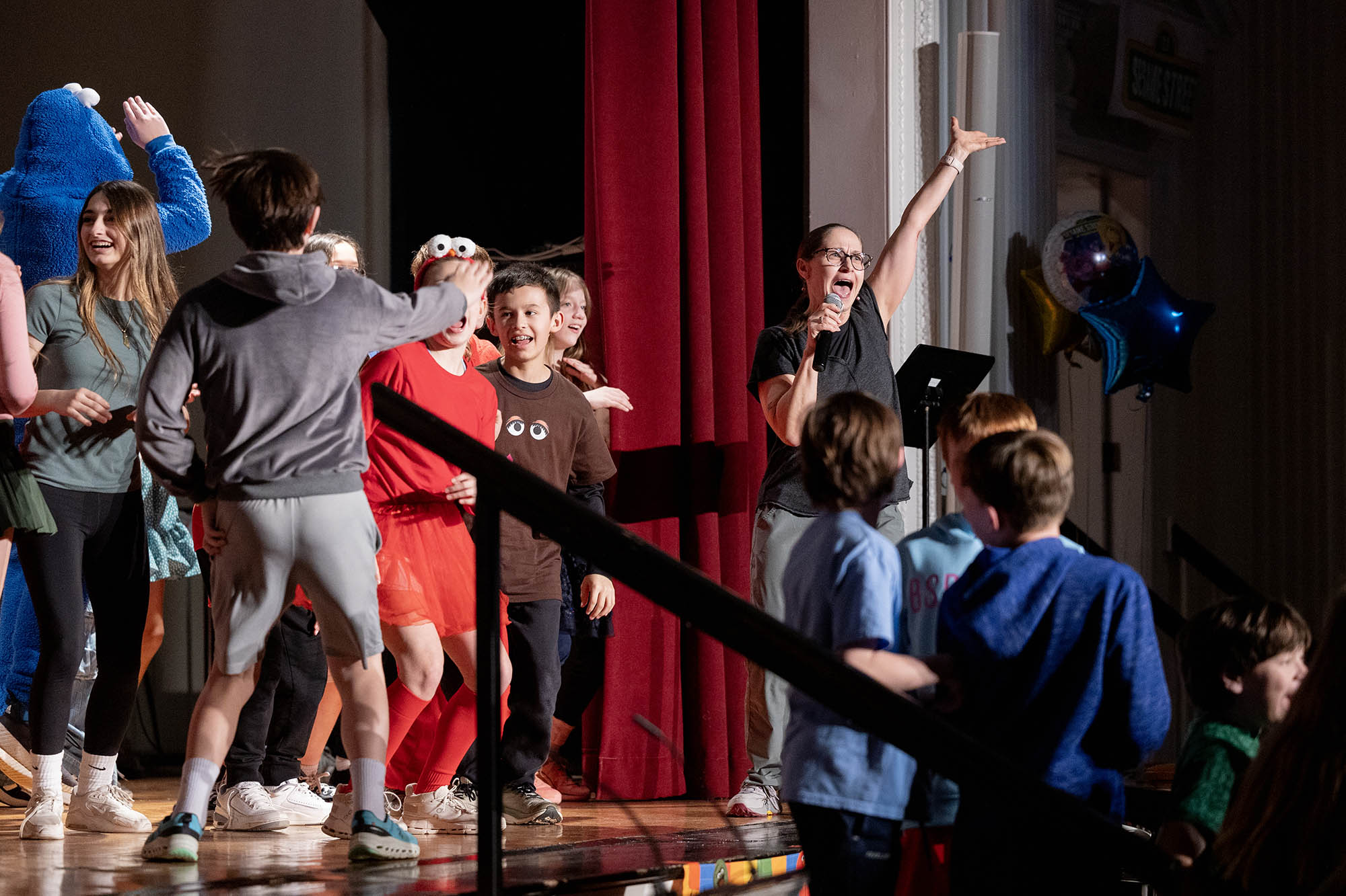 This year’s Middle School Talent Show theme of Sesame Street set the bright and colorful tone for a fun, upbeat showcase. Students and teachers alike were seen decked out in the bright primary colors of Big Bird, Cookie Monster, Elmo, and the rest of the Sesame Street characters. The decorations were just as colorful—the Community Leadership Committee (CLC) framed the entrance to the Middle School Dining Hall with colorful balloons, they decorated the chapel stage and audience area, and the entire day overflowed in a rainbow of talented possibilities.