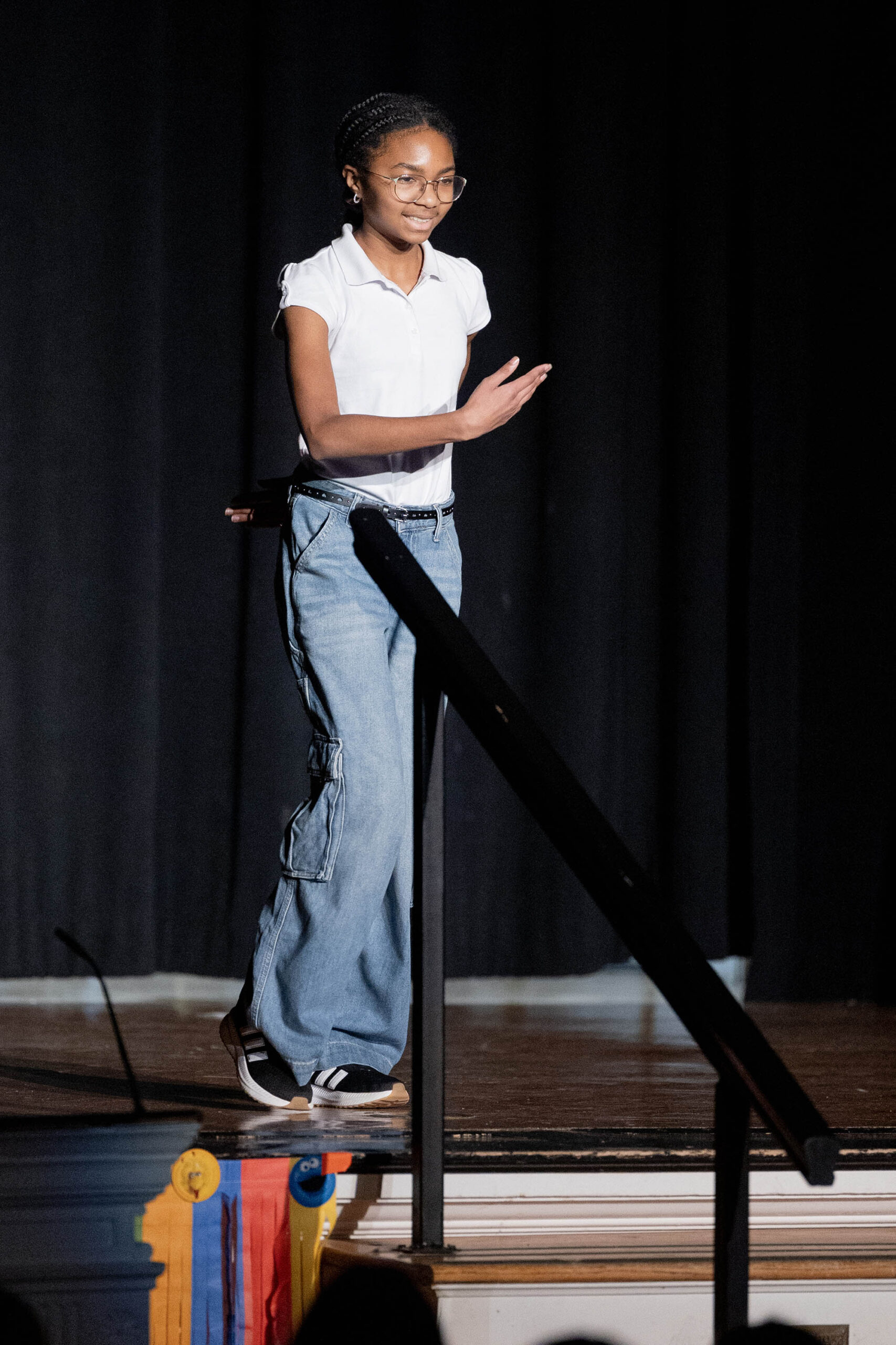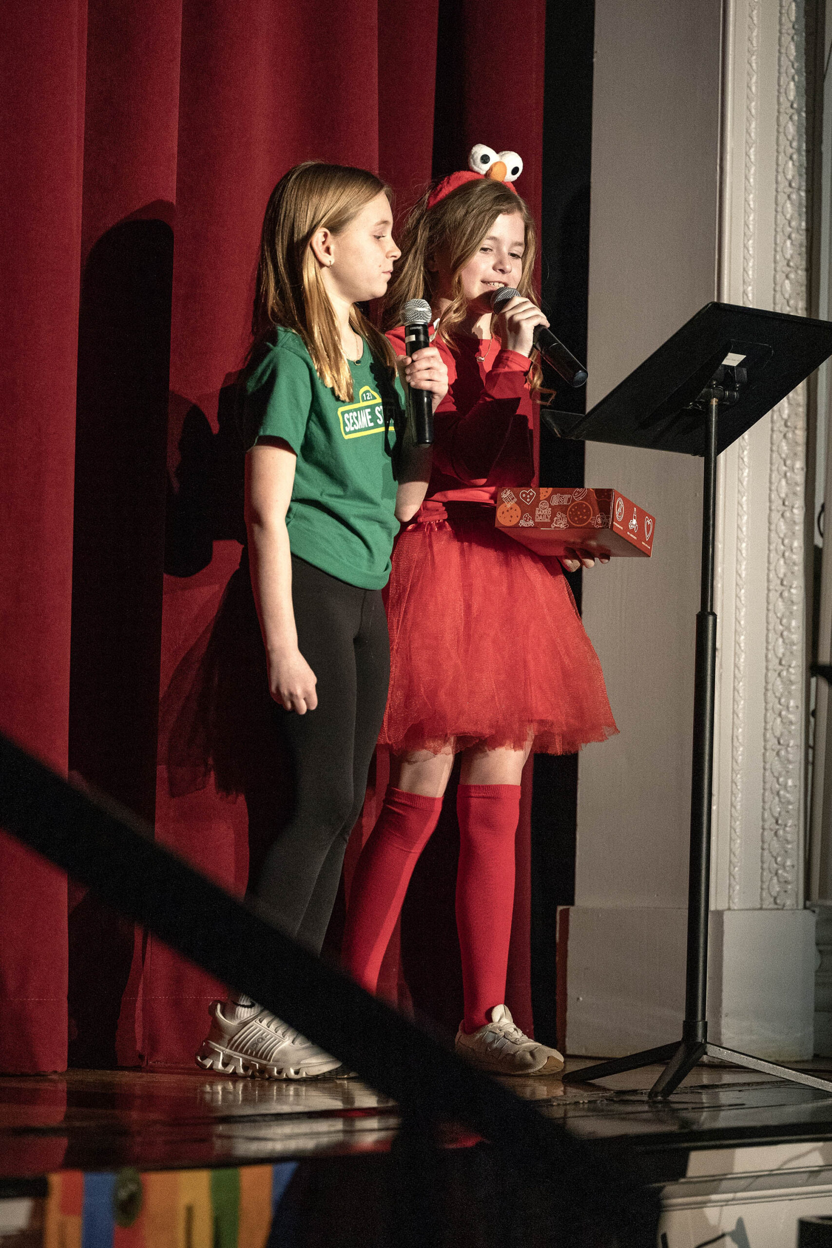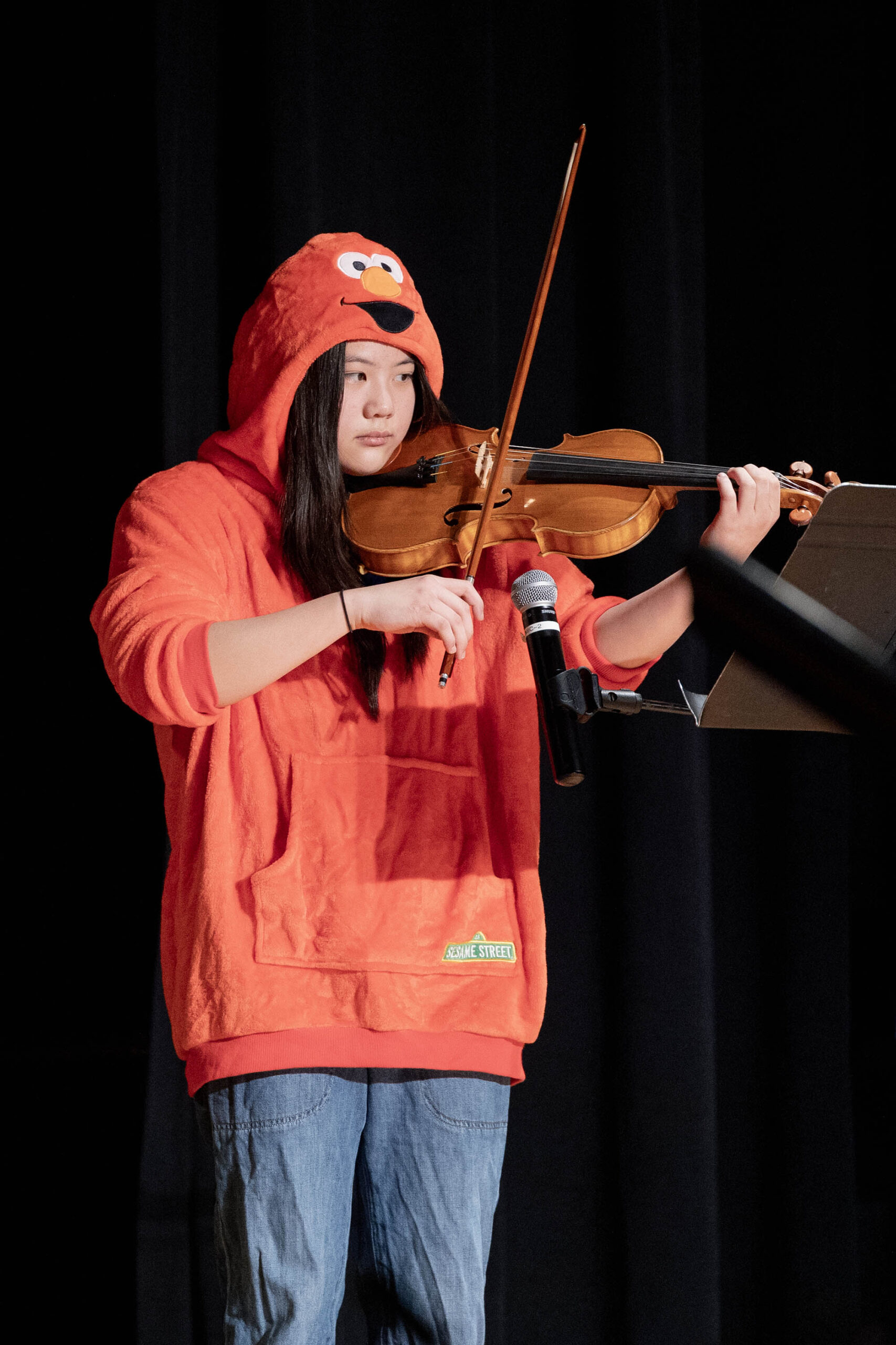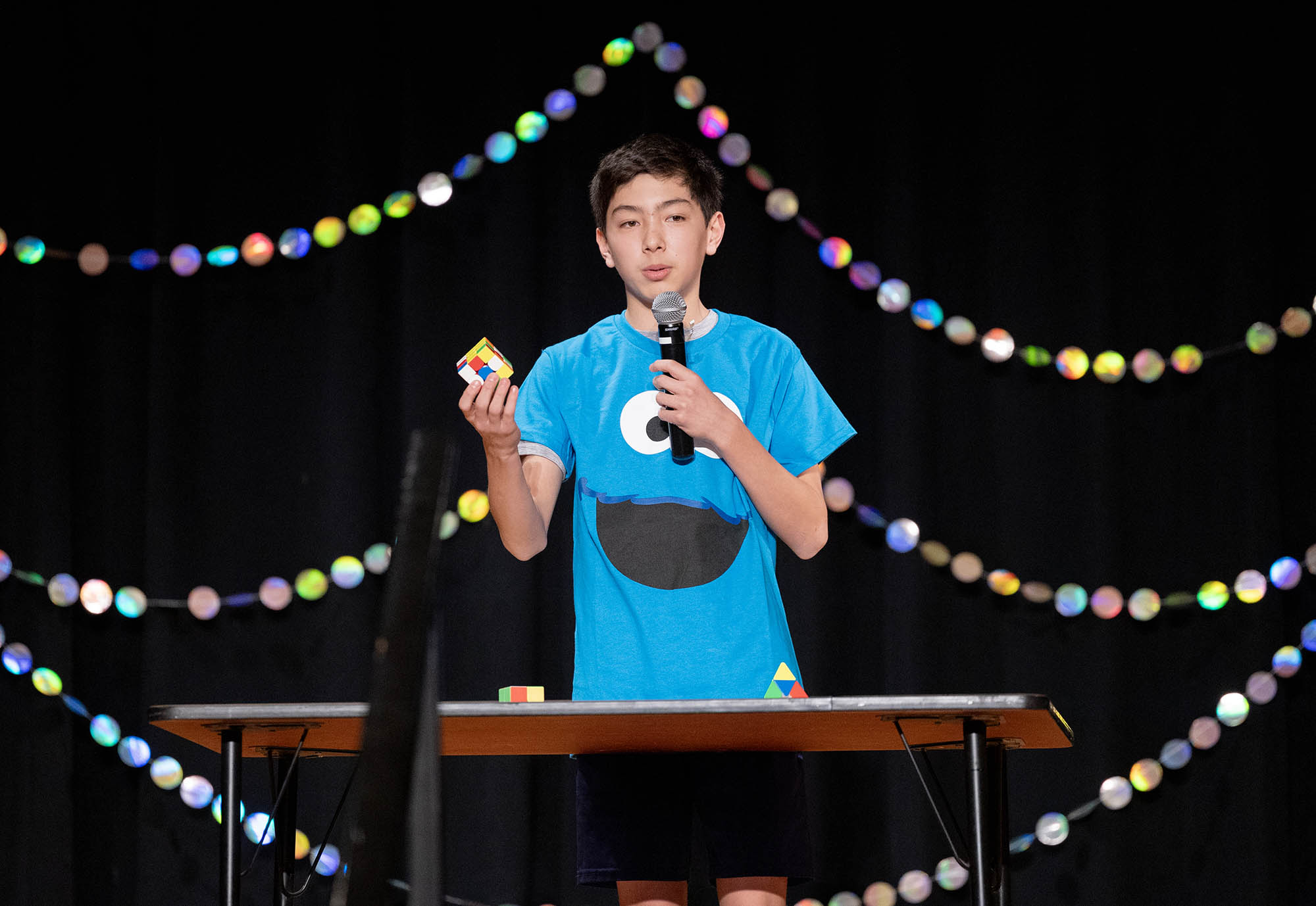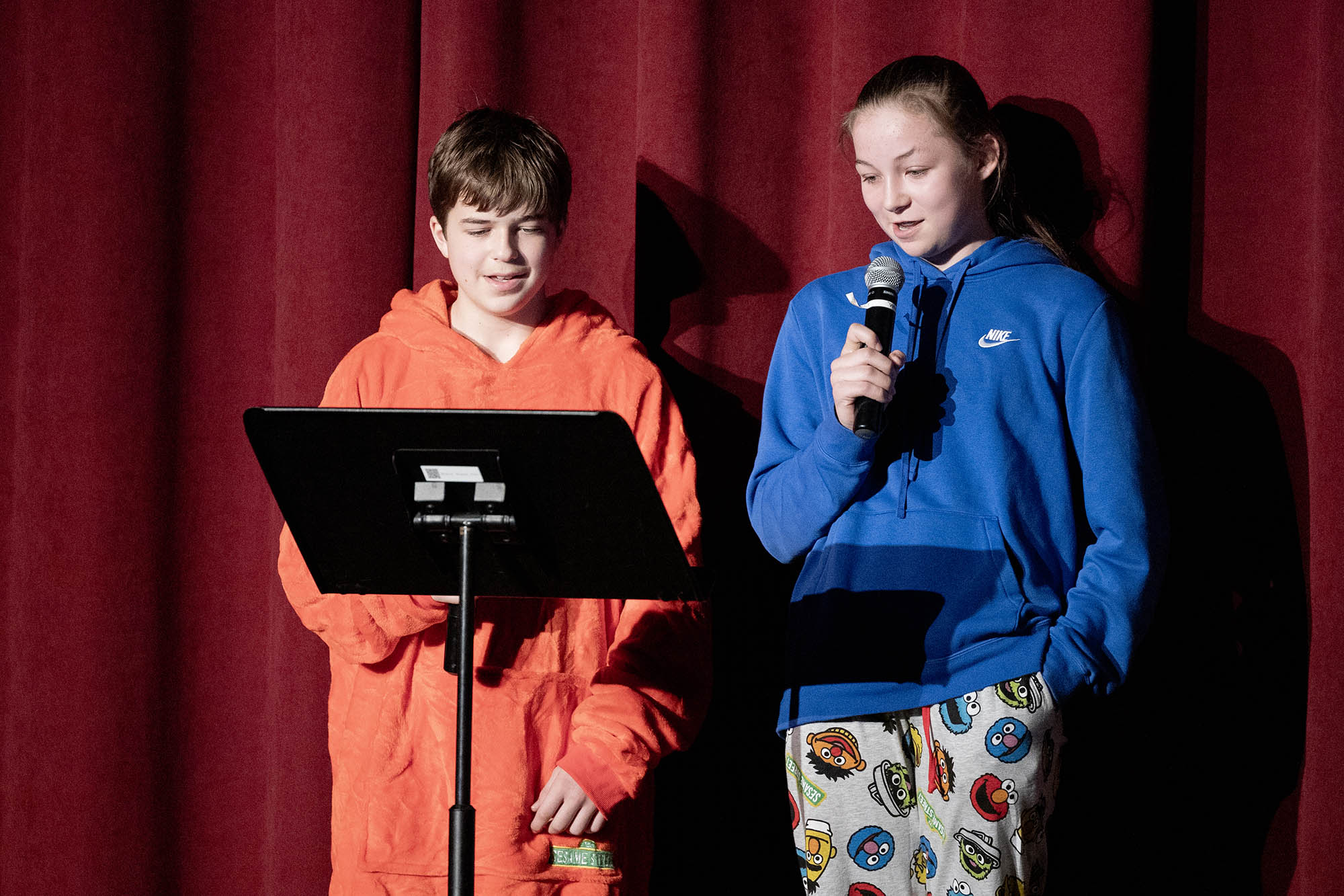 This year’s Middle School Talent Show theme of Sesame Street set the bright and colorful tone for a fun, upbeat showcase. Students and teachers alike were seen decked out in the bright primary colors of Big Bird, Cookie Monster, Elmo, and the rest of the Sesame Street characters. The decorations were just as colorful—the Community Leadership Committee (CLC) framed the entrance to the Middle School Dining Hall with colorful balloons, they decorated the chapel stage and audience area, and the entire day overflowed in a rainbow of talented possibilities.