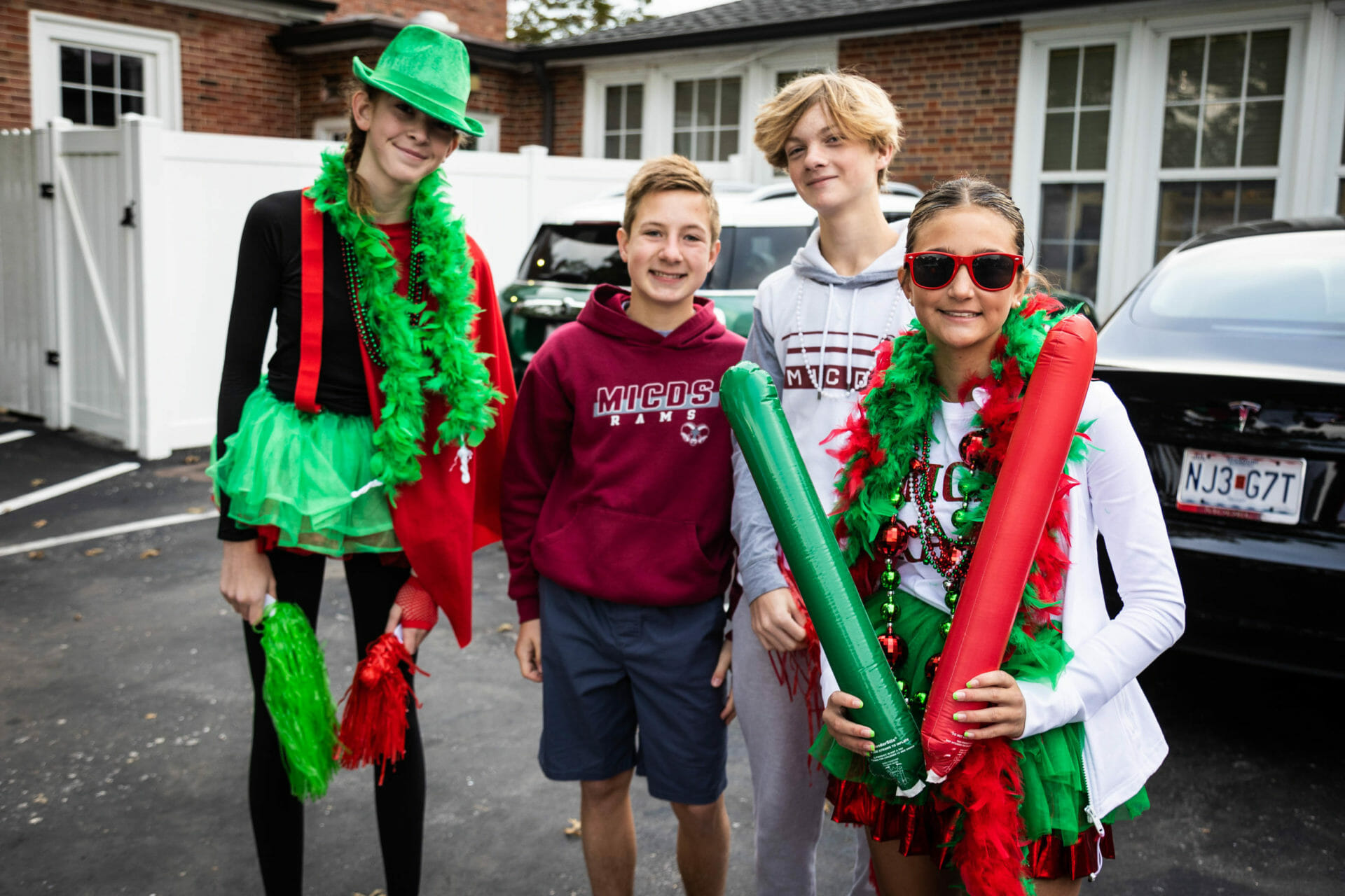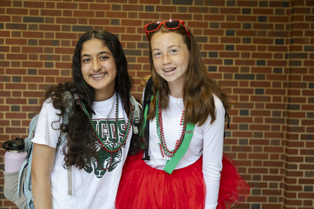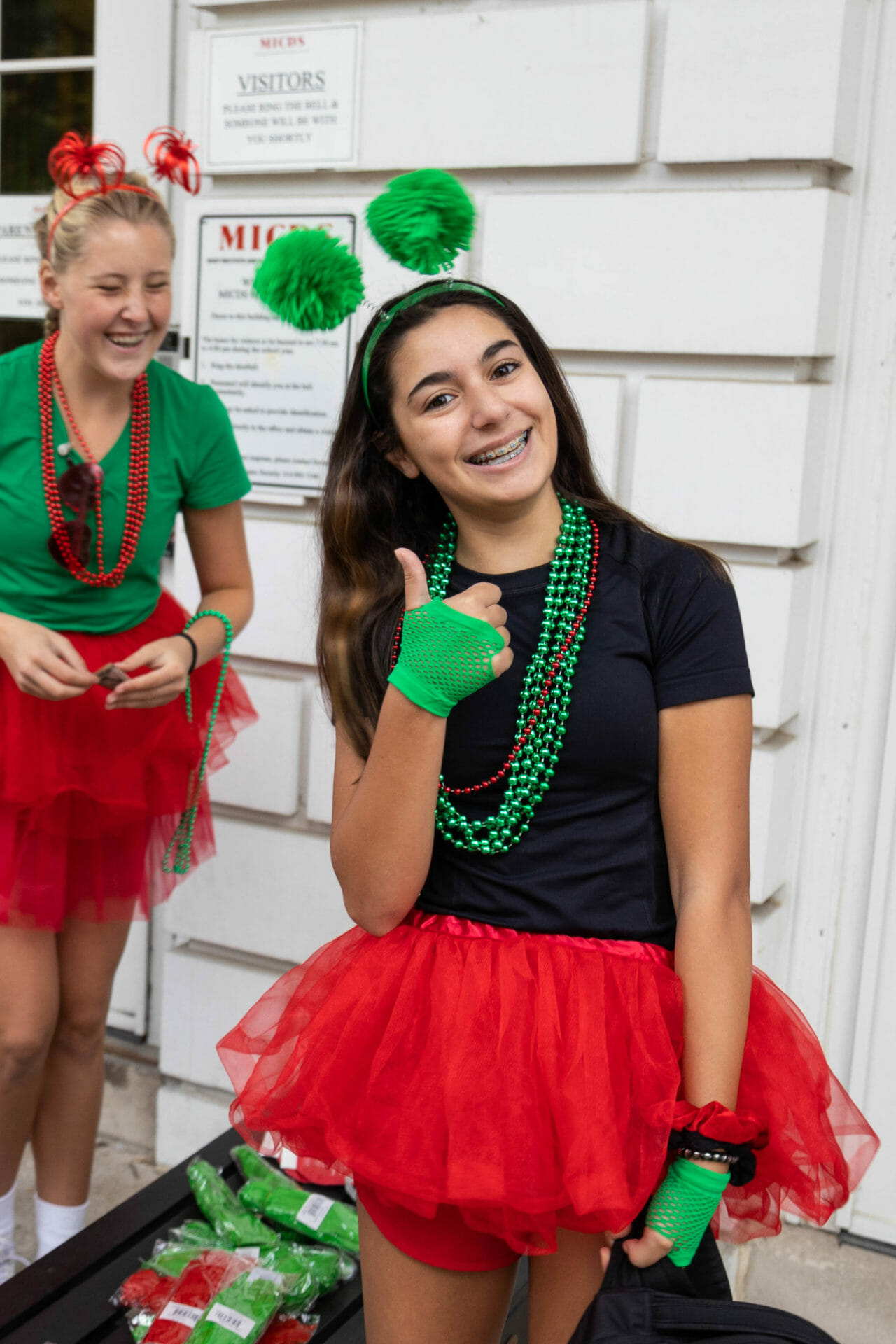 Deck the campus in red and green! Spirit Day means busting out your favorite MICDS tshirts or your sports uniforms, your red and green tutus, facepaint, and beads. The eighth grade helped promote the day by selling beads, blinkies, and thunder sticks at morning drop-off. It’s all about showing off your school spirit and your pride in MICDS, and our students did not disappoint!