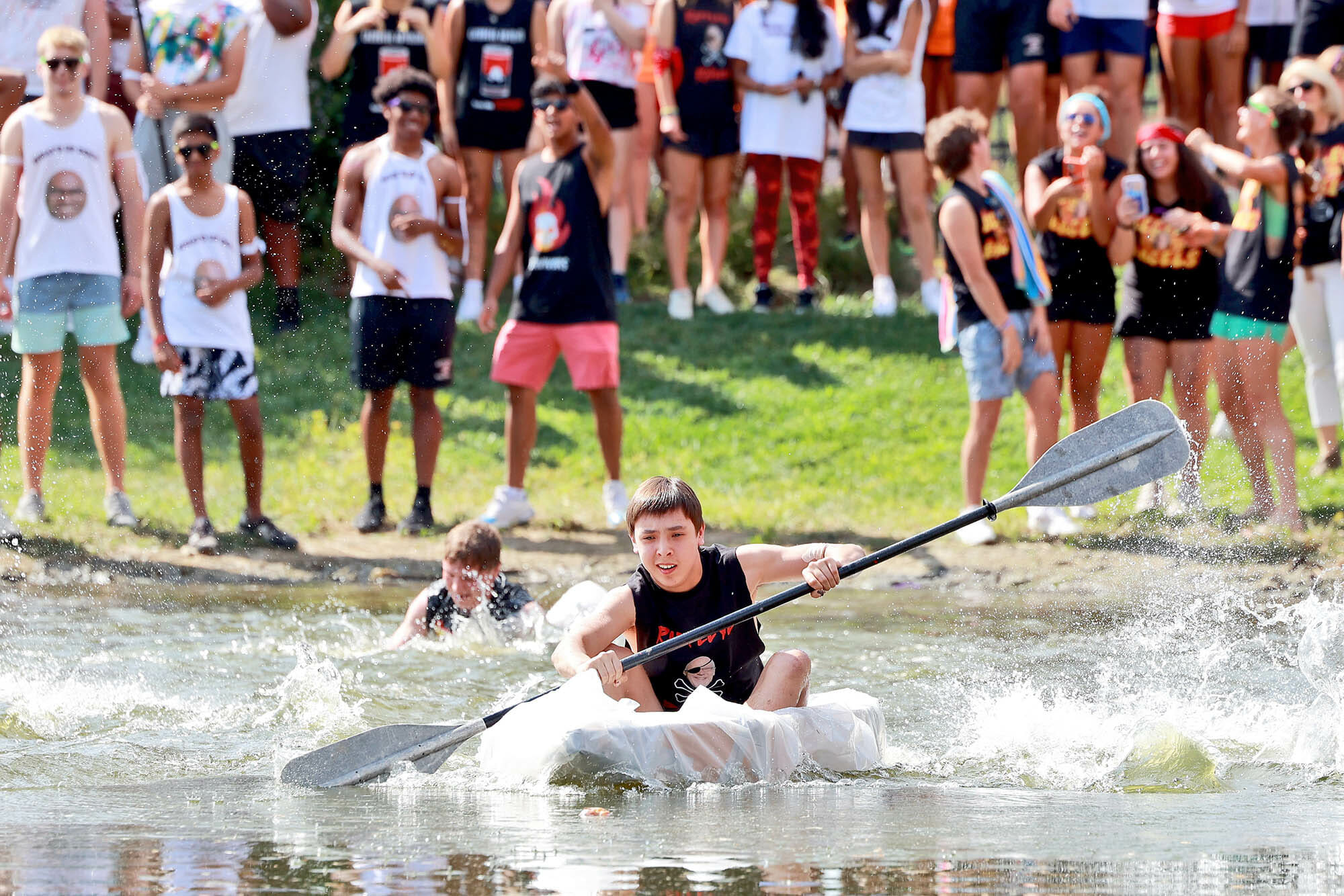 The competition included races in four preliminary heats, where each ship tested its seaworthiness and speed before the final round. Boats tipped, took on water, and turned flotsam and jetsam in the murky water, with only a select few making it to the opposite bank. With the wind in their sails, the Coco-Begrowicz advisory took home the coveted trophy with Max Garcia ’24 paddling at the helm.