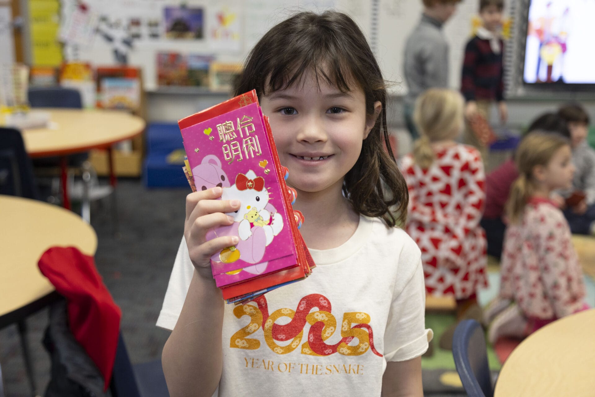 In Beasley Lower School, students honored Lunar New Year with an assembly on February 7. During the assembly, the Upper School Lion Dancers performed for the first time for the Beasley students, and Amy Scheer, Head of Lower School, received a red envelope from one of the lions. The assembly also had a theme word which was cooperation. The Upper School Lion Dancers spoke about the cooperation and coordination it takes to be a part of the lion. “One of the students mentioned how her role changed from being the back of the lion to being in the front, and how she had to work together with her partner each time to bring the lion to life,” shares Dr. Katy Nichols, Lower School Music Teacher.