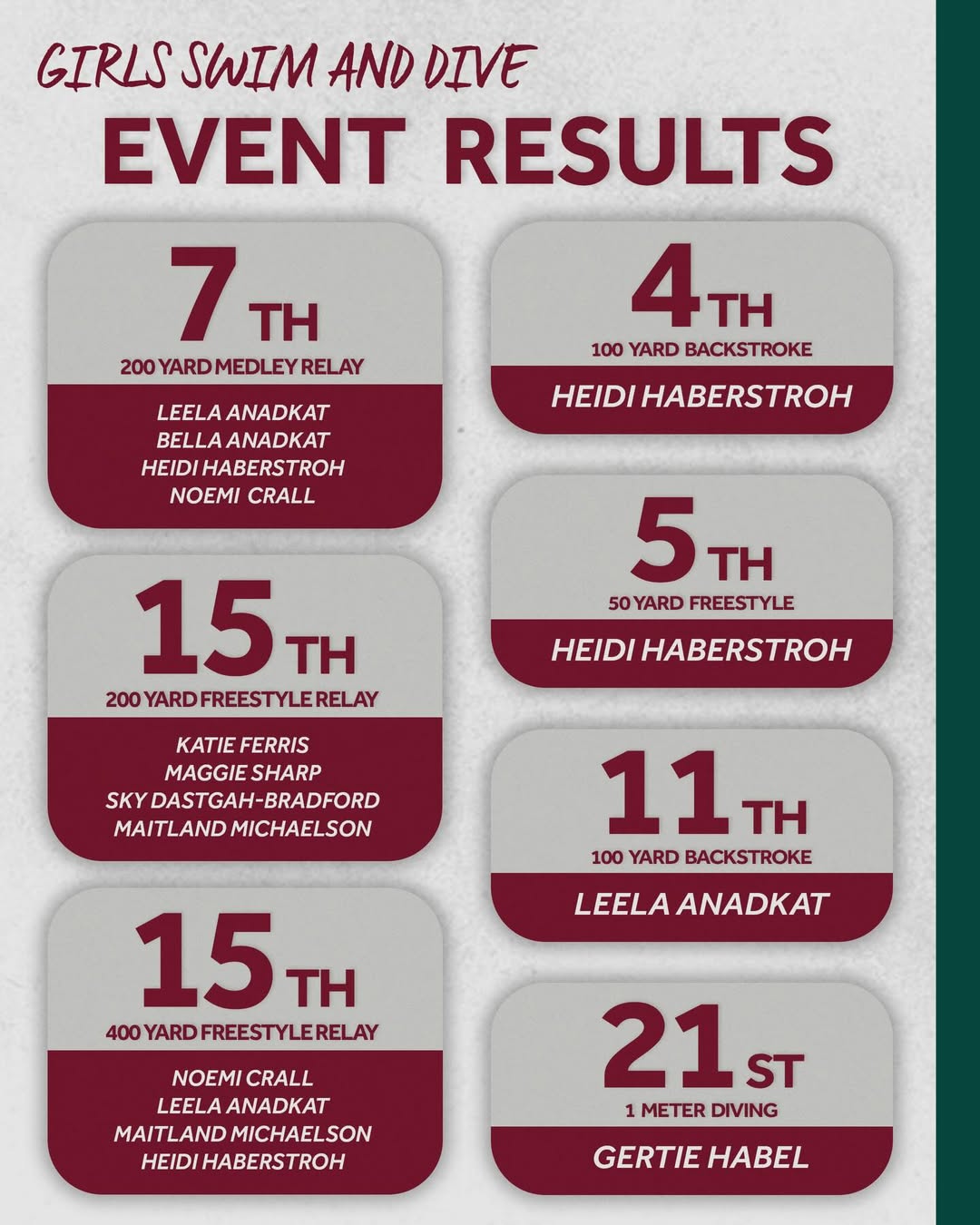 - 200 Medley Relay (7th): Leela Anadkat ’29, Bella Anadkat ’26, Heidi Haberstroh ’29, Noemi Crall ’26