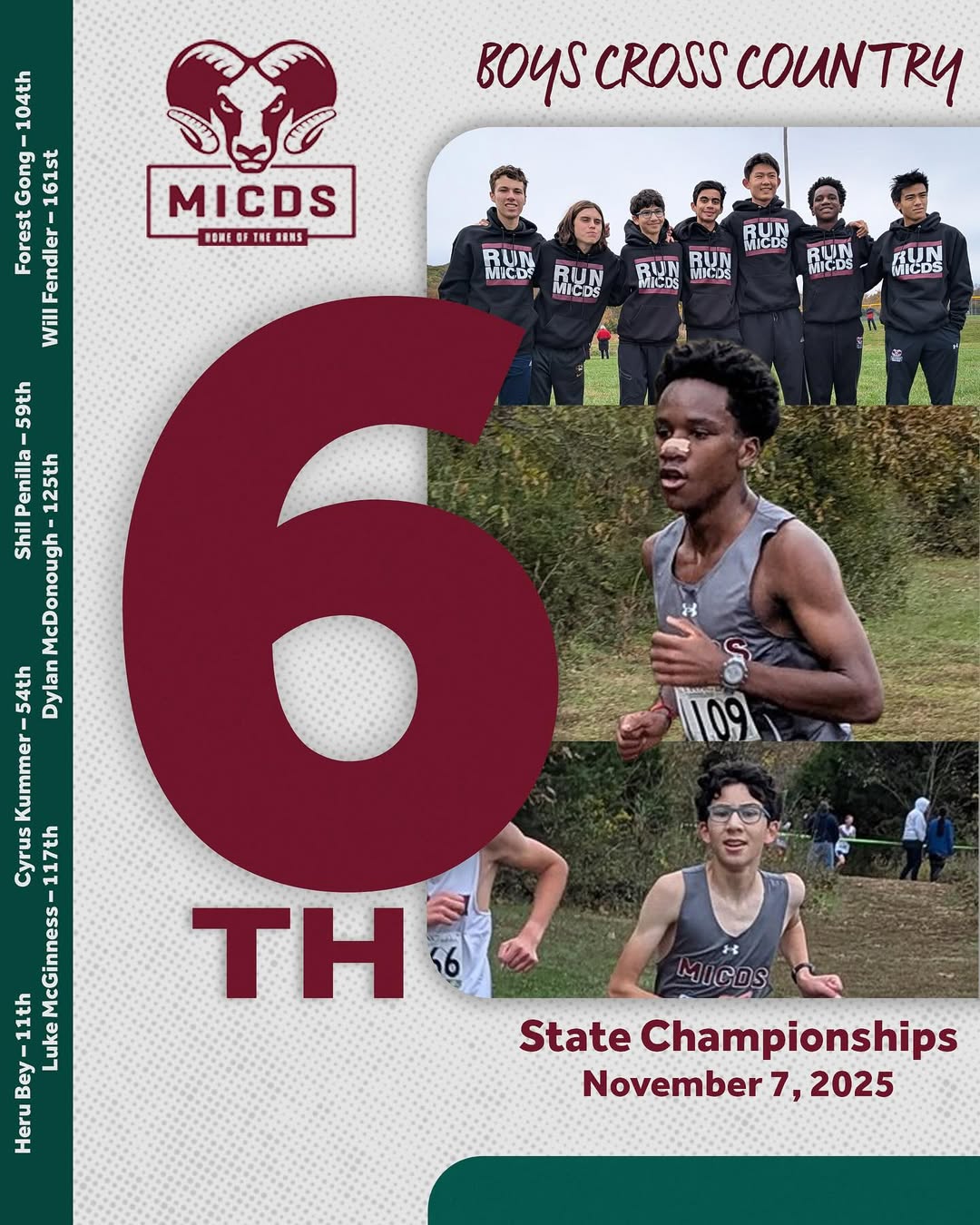 Congratulations to the MICDS Varsity Boys Cross Country team, who placed 6th at the State competition! A special shoutout to Heru Bey ’27 for finishing in 11th in his race.