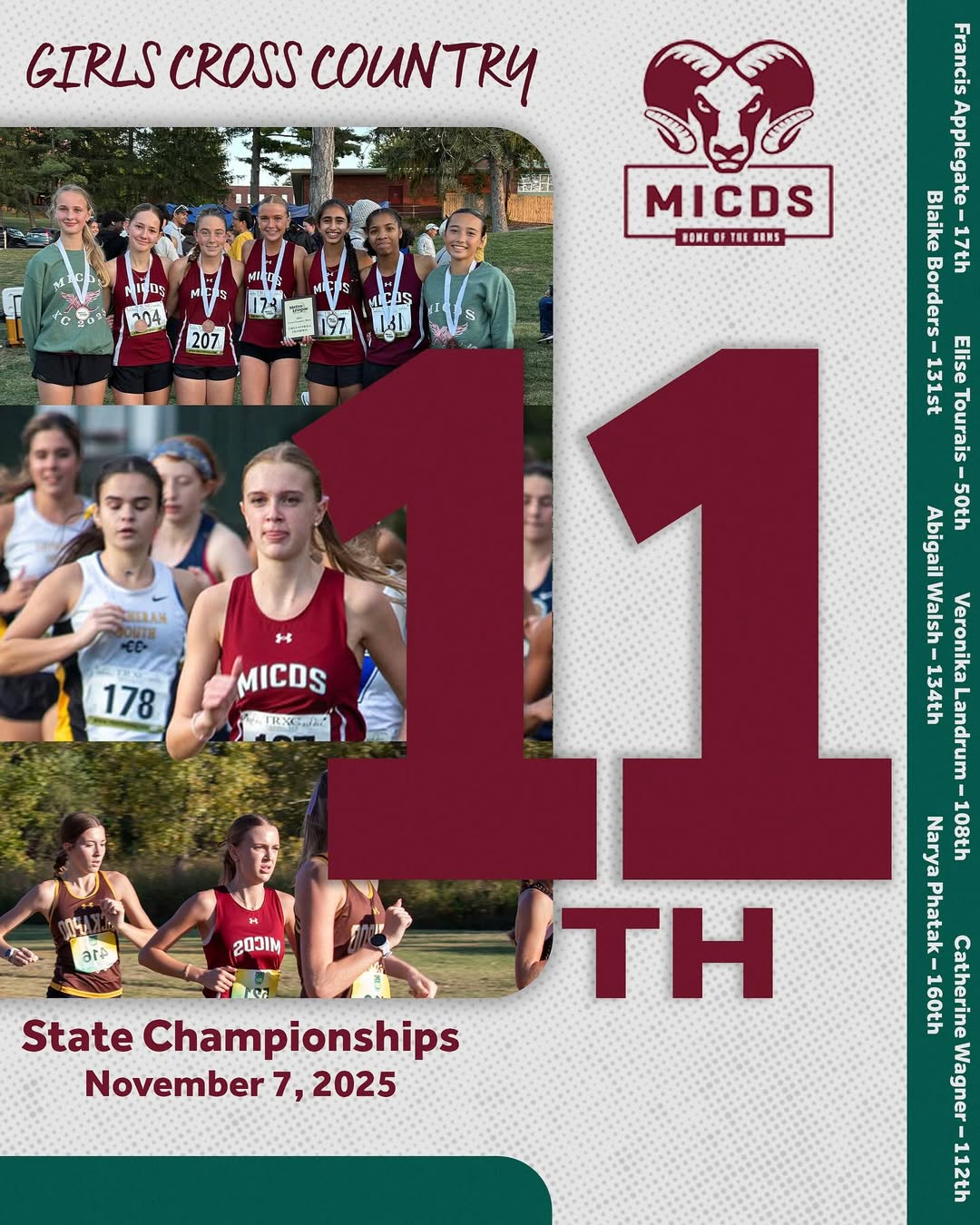Our Varsity Girls Cross Country team placed in 11th at State! Congratulations to Frances Applegate ’27 for running to 17th place in her race. Way to go Rams!
