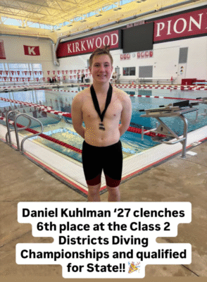Junior Daniel Kuhlman ’27 clenched 6th place at the Class 2 District Diving Championships last weekend and qualified for State. Go Daniel!