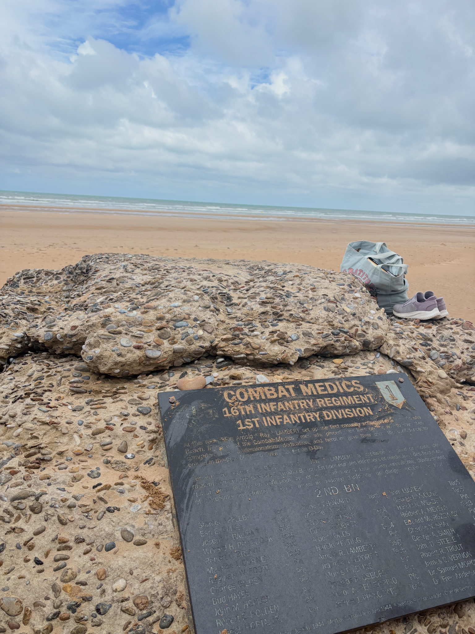Nuzum reflected, “One of the most memorable parts of the trip for me was on Omaha Beach, when our tour guide, Tomas, showed us how to place sand in the memorial sign for combat medics to make the fading lettering legible. He told us that he always finds someone has placed sand in the sign—a metaphor for the enduring gratitude for veterans of the war, even decades later.”