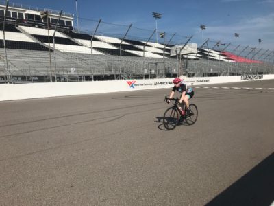On August 22, MICDS Cycling Captain Fiona Richards ’21 won the Missouri Women’s Category 4 state championship and also successfully defended her Missouri Juniors title for girls under 19 at the Missouri State Criterium Championships! The races were held at the Gateway Motor Speedway and, with precautions taken to prevent the spread of the coronavirus, drew adult and junior racers from around the state and region. Criterium racing involves competitors racing around a closed-loop road for approximately 40 minutes at a time at speeds of over 20 miles per hour. It is one of the most popular forms of road bike racing and the one in which the MICDS Cycling Team usually competes. Fiona won her Juniors race first in the morning and then stayed at the racetrack to take the Category 4 title in the women’s race.