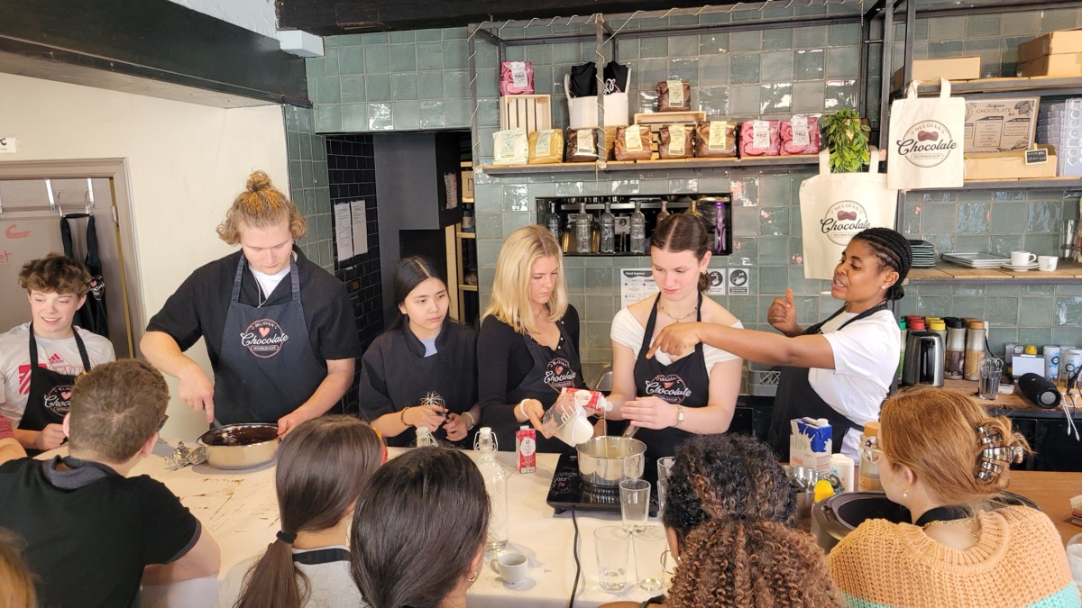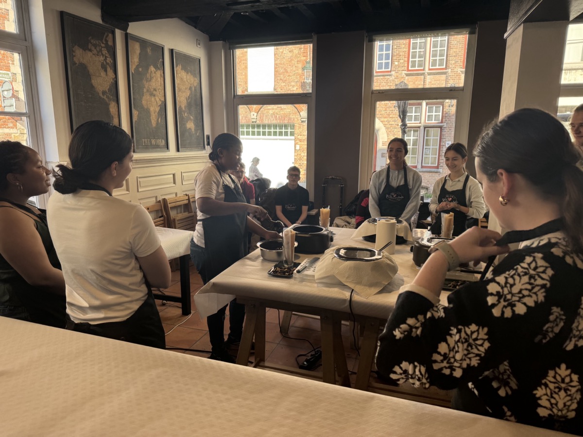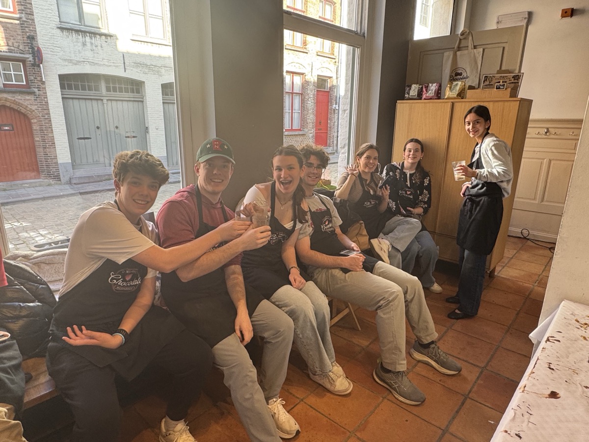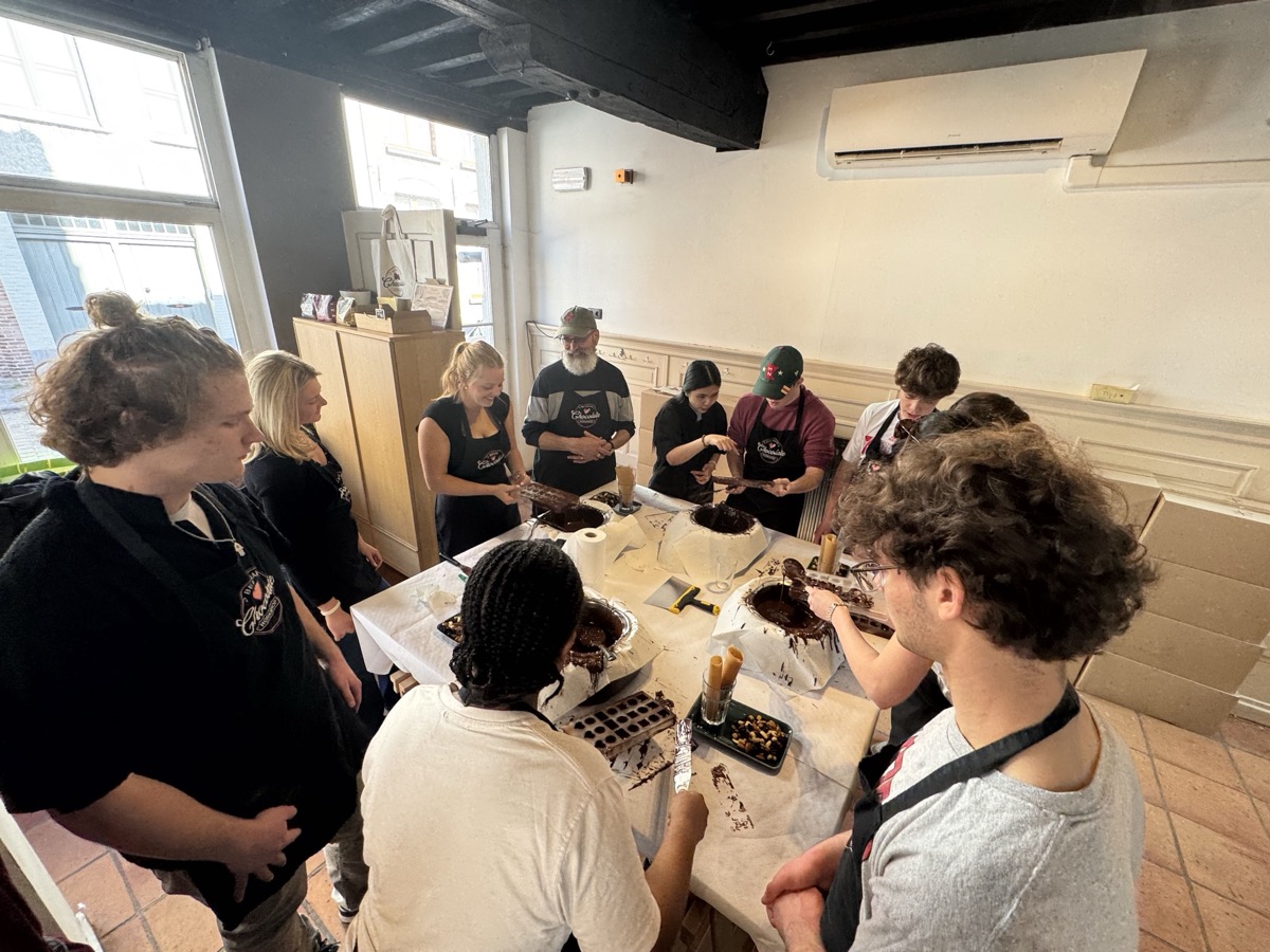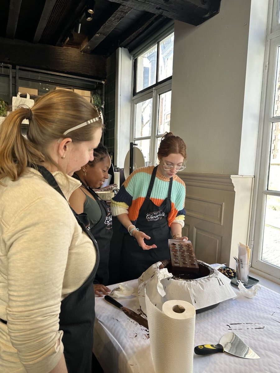 In Ghent, they met with locals to see how this city takes contemporary issues to heart and embraces sustainable development goals. Then they hopped a train from Ghent to Bruges for the day to explore the picturesque streets and canals of the city. Once back in Ghent, they connected with a professor from the College of Europe and ended the day with a praline chocolate workshop and tasting before turning their sights to traveling to the Netherlands the next day.