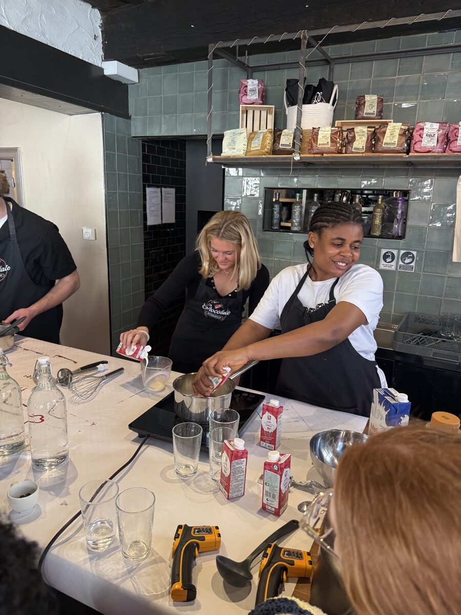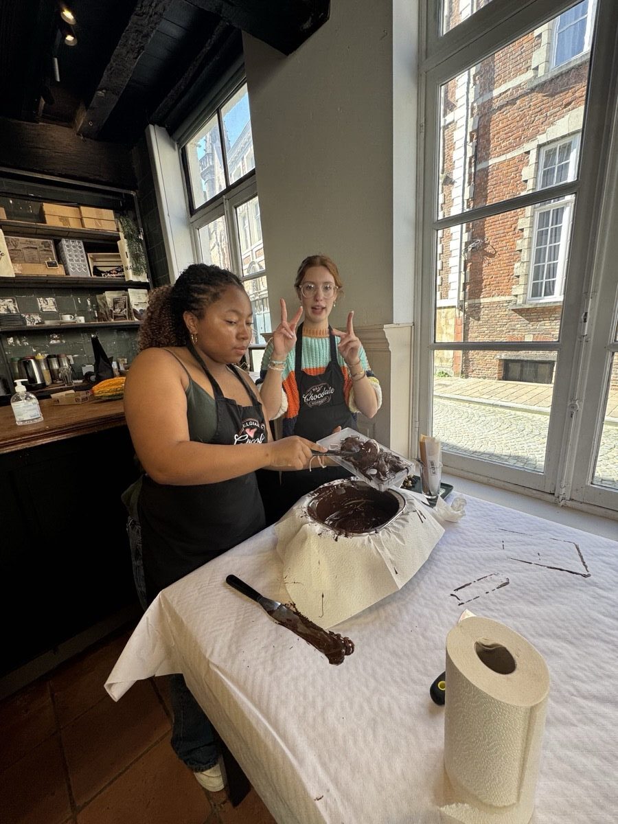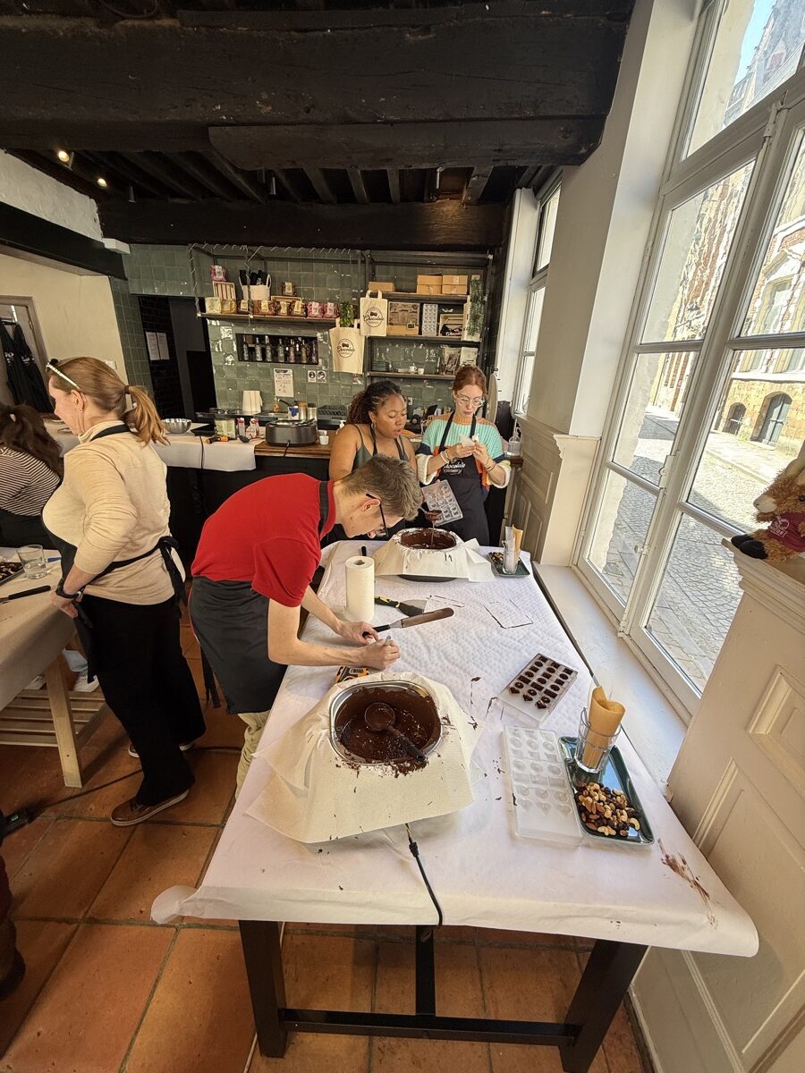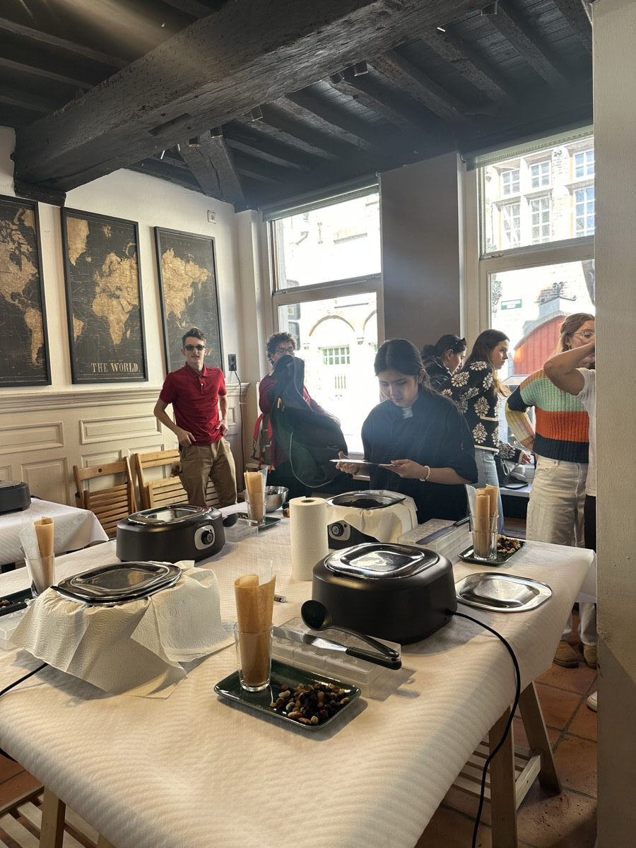 In Ghent, they met with locals to see how this city takes contemporary issues to heart and embraces sustainable development goals. Then they hopped a train from Ghent to Bruges for the day to explore the picturesque streets and canals of the city. Once back in Ghent, they connected with a professor from the College of Europe and ended the day with a praline chocolate workshop and tasting before turning their sights to traveling to the Netherlands the next day.