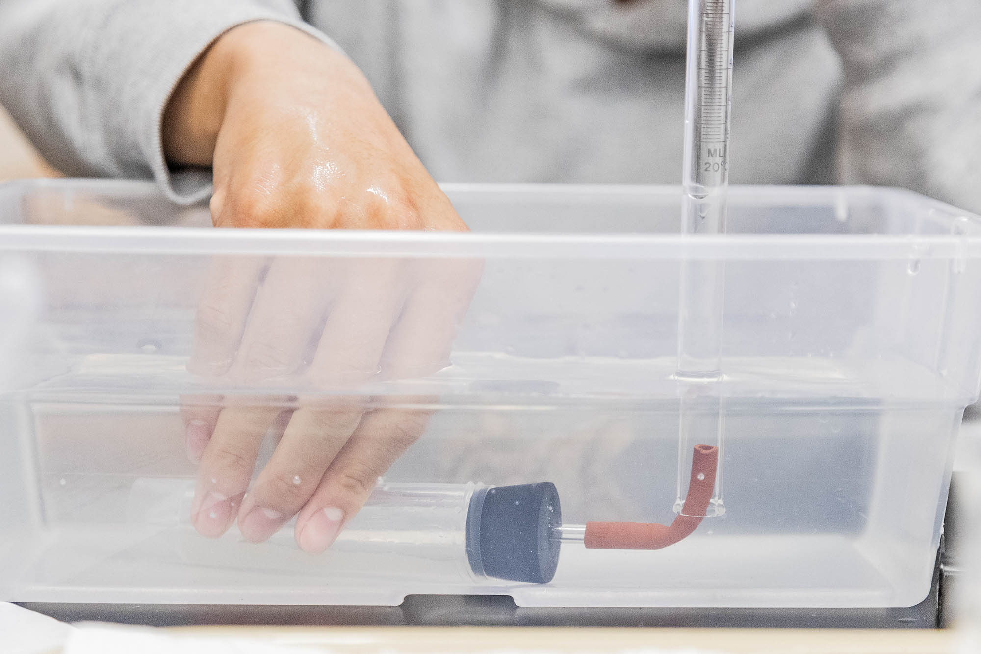 The juniors and seniors in the Cellular Energetics class measured the amount of oxygen gas produced through a reaction where catalase enzyme from yeast was added to hydrogen peroxide to form oxygen gas. In five different scenarios, the students watched as oxygen gas was produced from the reactions. They then measured the resulting gas. Students observed how the enzyme reactions were affected by temperature (including ice and boiled catalase), enzyme concentration, substrate concentration, pH levels, and ionic concentration (added salt).