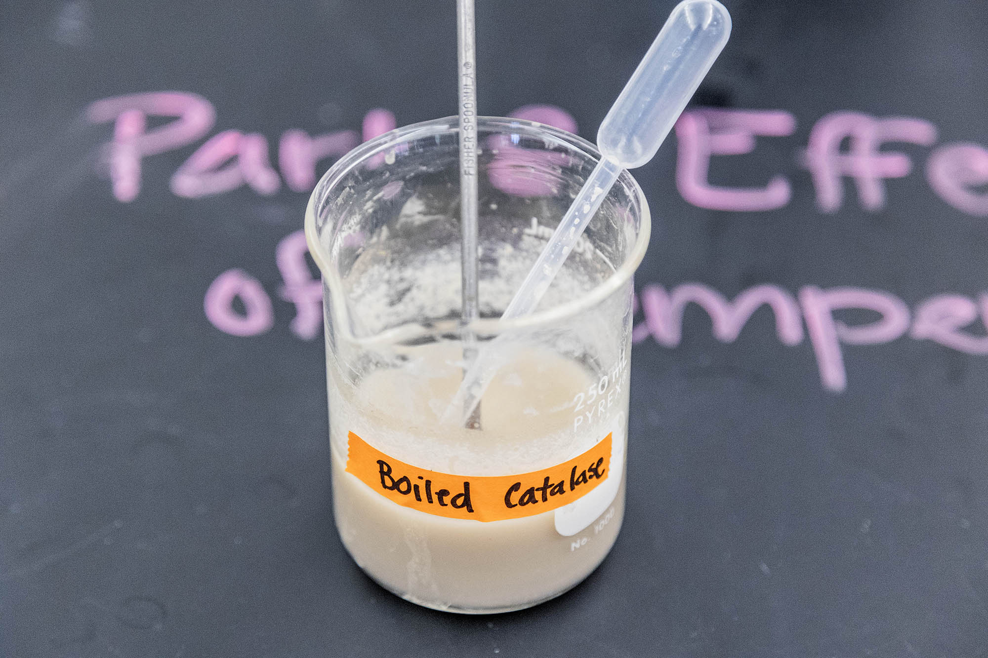 As the temperature rose, so did oxygen production—to a point. When the temperature rose to boiling, little to no oxygen was produced. Introducing differences in pH had similar results. Students saw a decrease in oxygen production as vinegar (acid) and baking soda (base) materials were incorporated, and an increase in oxygen production with the scenario at a neutral pH level. When students concentrated the catalase they observed an increased in oxygen production, just as they did when they concentrated the substrate. But increasing the salt levels followed a similar path to the increase in temperature, with oxygen production climbing with the introduction of salt, but falling as the salt level continued to rise.