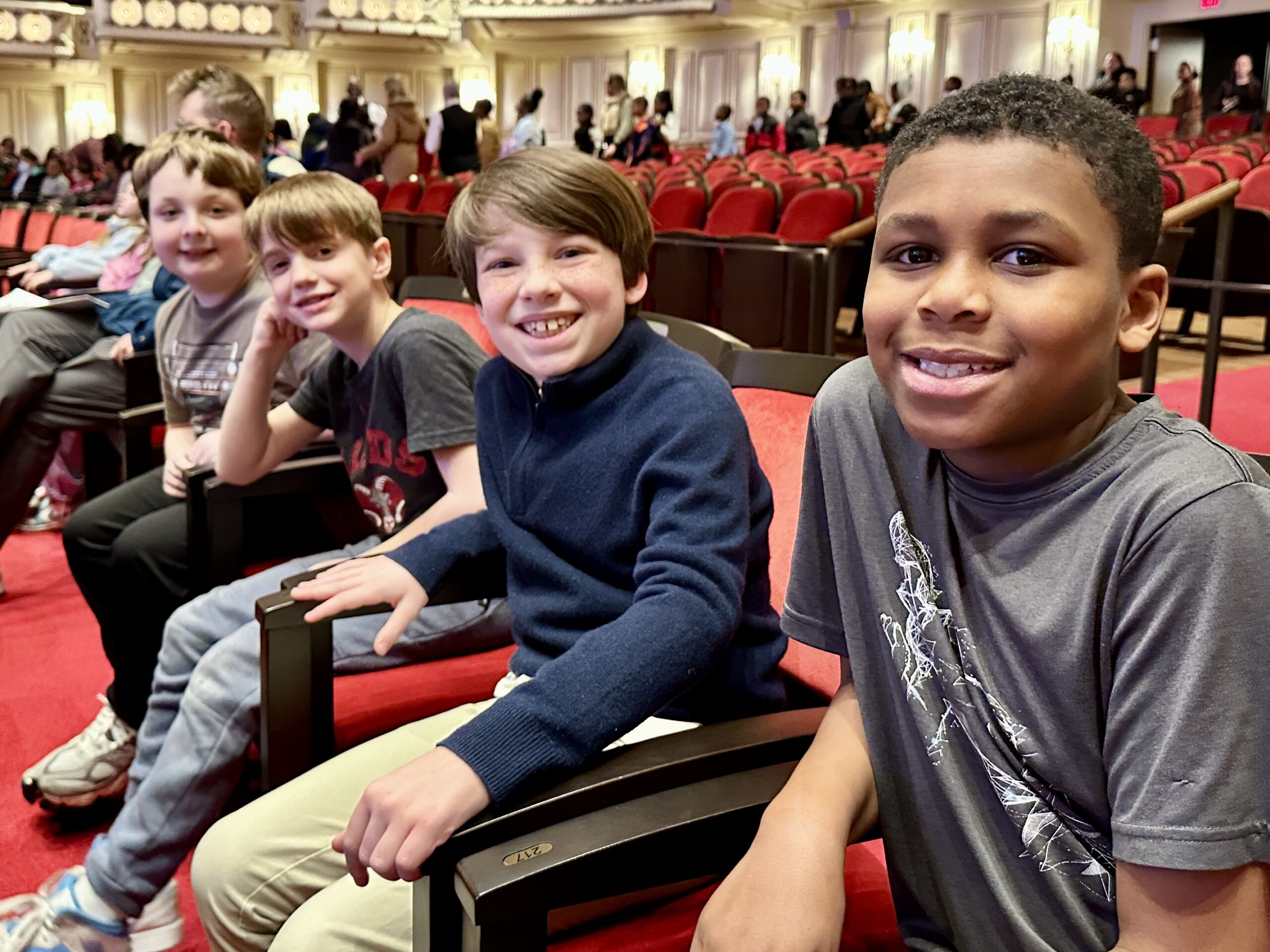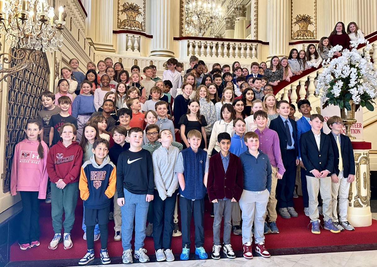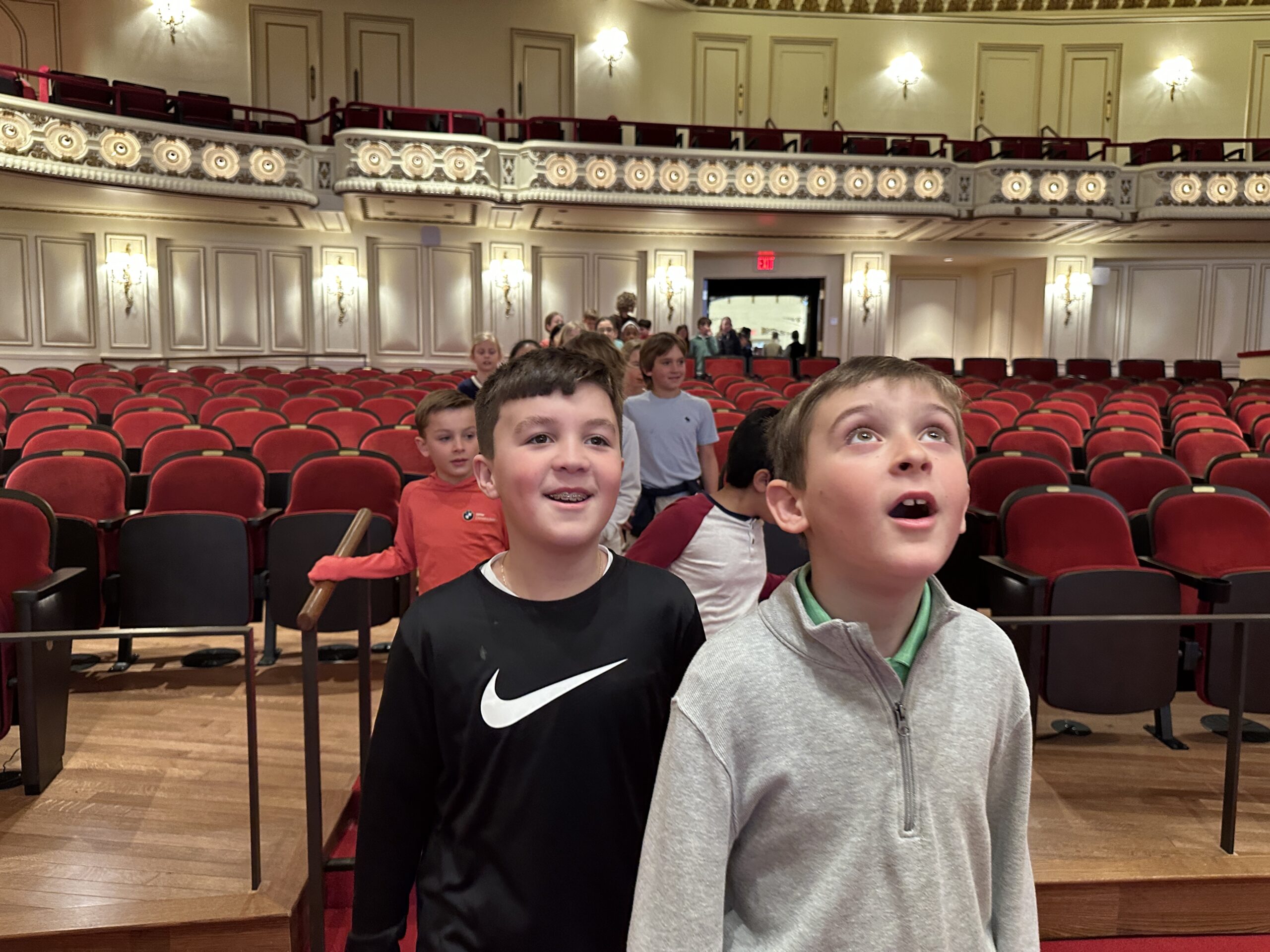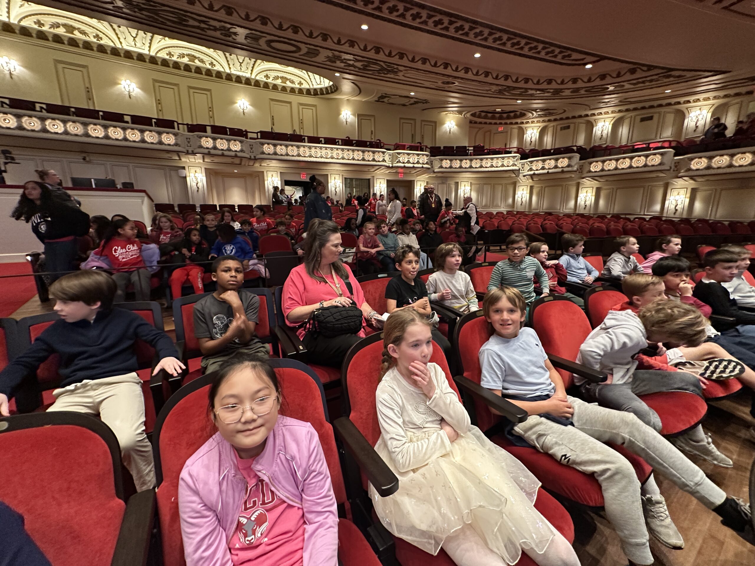 The musical immersion began even before the buses left campus. As part of a “Frosty Fun” day focused on the arts, fifth graders enjoyed an instrument show-and-tell with members of the Middle School orchestras. The older students demonstrated string, woodwind, brass, and percussion instruments, performing the pieces they are currently learning to give the fifth graders a front-row look at the world of performance.