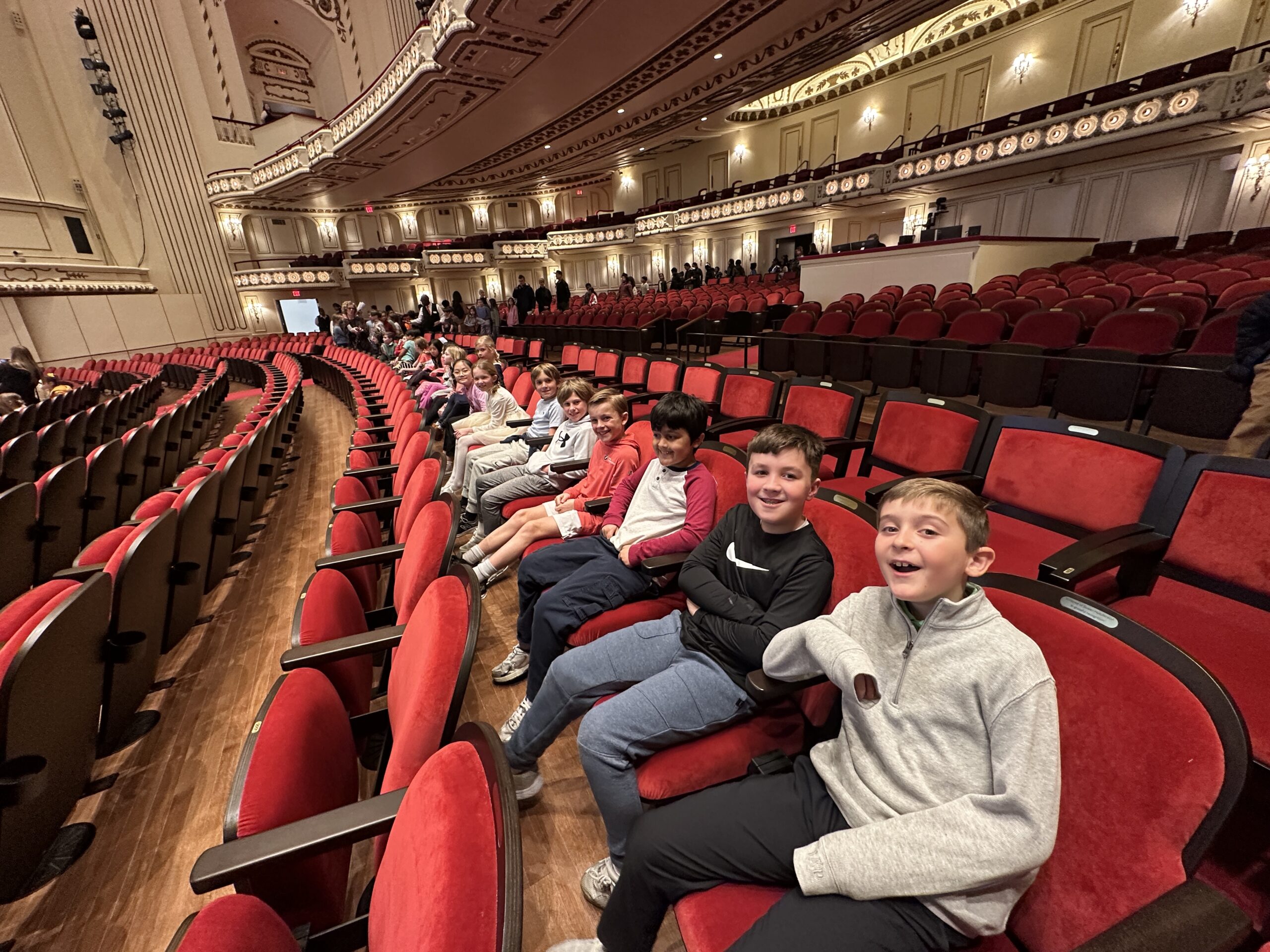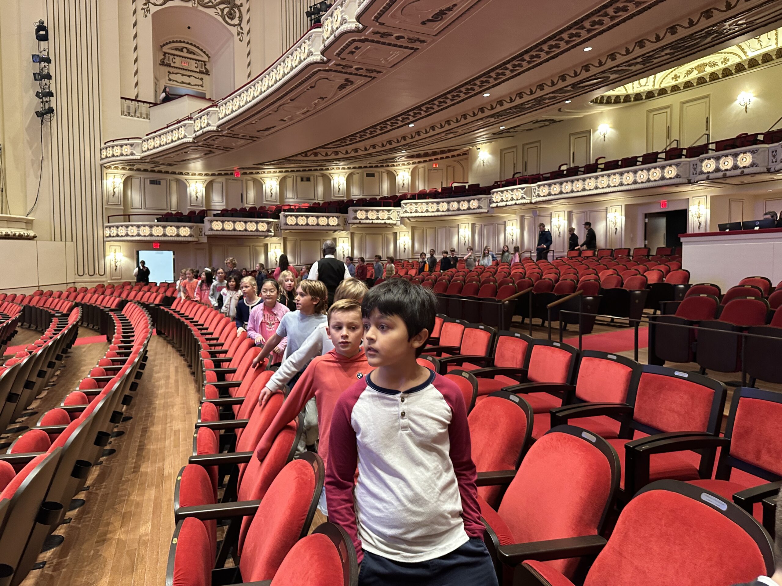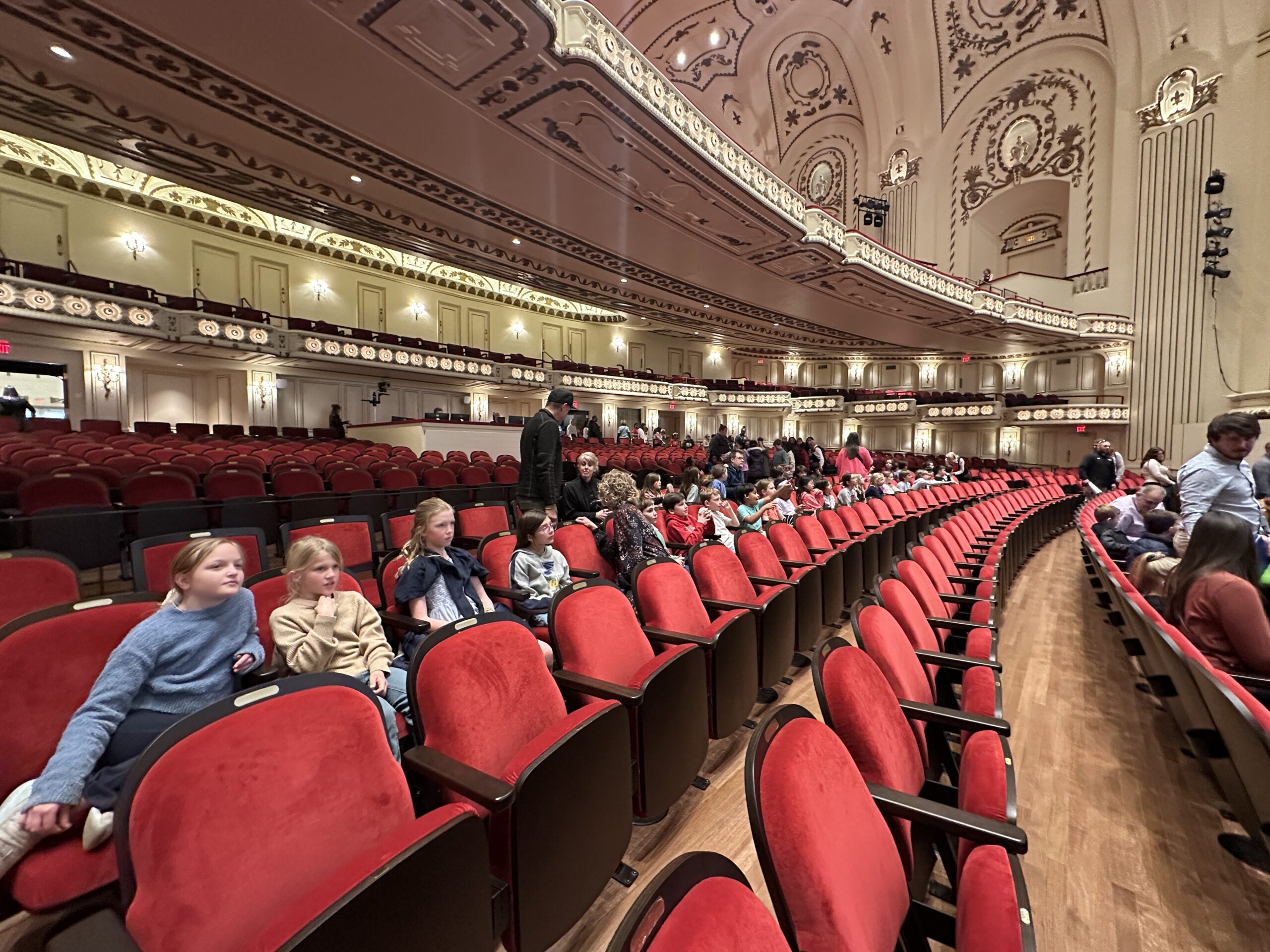 The musical immersion began even before the buses left campus. As part of a “Frosty Fun” day focused on the arts, fifth graders enjoyed an instrument show-and-tell with members of the Middle School orchestras. The older students demonstrated string, woodwind, brass, and percussion instruments, performing the pieces they are currently learning to give the fifth graders a front-row look at the world of performance.