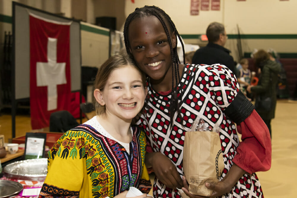 The night was just getting started! After the cultural performances, guests streamed over to the North Gym, where our parent and student ambassadors had displays and food representing 25 countries and St. Louis, Missouri. From Argentina to Zambia, visitors were able to travel around the world in a few hours. Did you know that pato is Spanish for “duck” because in Argentina’s national sport, Pato, which is similar to polo, a live duck was originally used instead of a ball? Or that Bulgaria is the oldest country in Europe that hasn’t changed its name since it was first established? Or that in France, Époisses de Bourgogne, often called “the world’s smelliest cheese,” is so stinky that it is banned on public transportation? The “fortune cookie” was first made by a Japanese person and is not even found in China. Ireland is the only country where the windmills turn clockwise. Morocco’s city of Fez is the location of the world’s first university, University of al-Qarawiyyin, founded in 859.