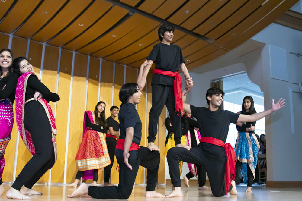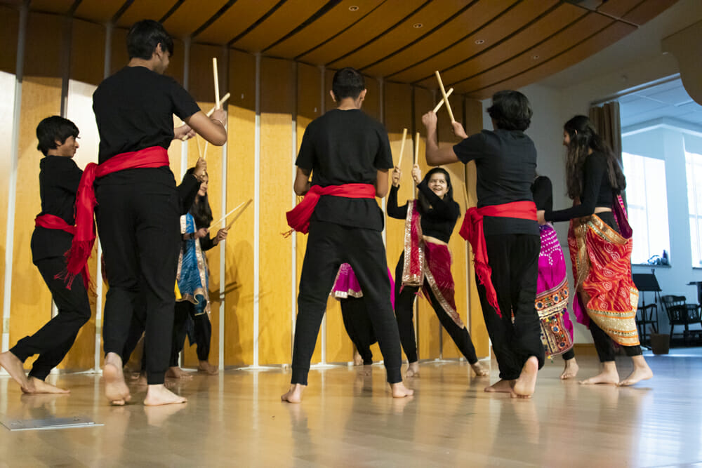 A stage at one end of the gym showcased interactive cultural performances by Upper School students and professional dancers and musicians, including a Bollywood dance lesson, Salsa dance demonstration and lesson, the St. Louis Okinawa Eisa Group, and a Senegalese Mbalax dance lesson by Coumba Gueye.