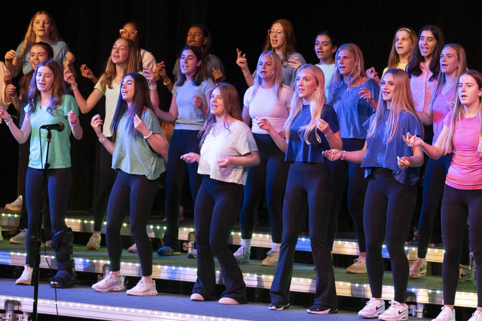 Last week, the MICDS Upper School Choirs presented two performances of their annual Spring Pops Concert in Orthwein Theatre. The beloved concert is a student-driven choral production with original choreography created by the talented singers themselves. This high-energy concert is accompanied by a live stage band, and the show always incorporates a few surprises throughout the evening. Nearly 20 different songs were performed by the Tenor-Bass Choir, the Treble Choir, the Chamber Choir, and the featured soloists.