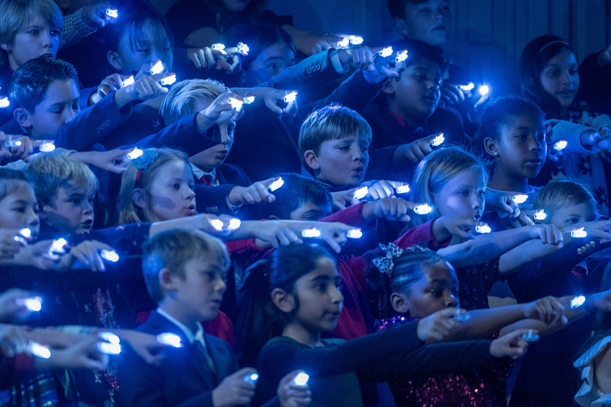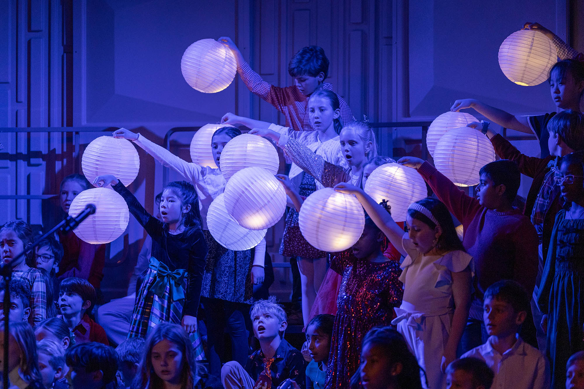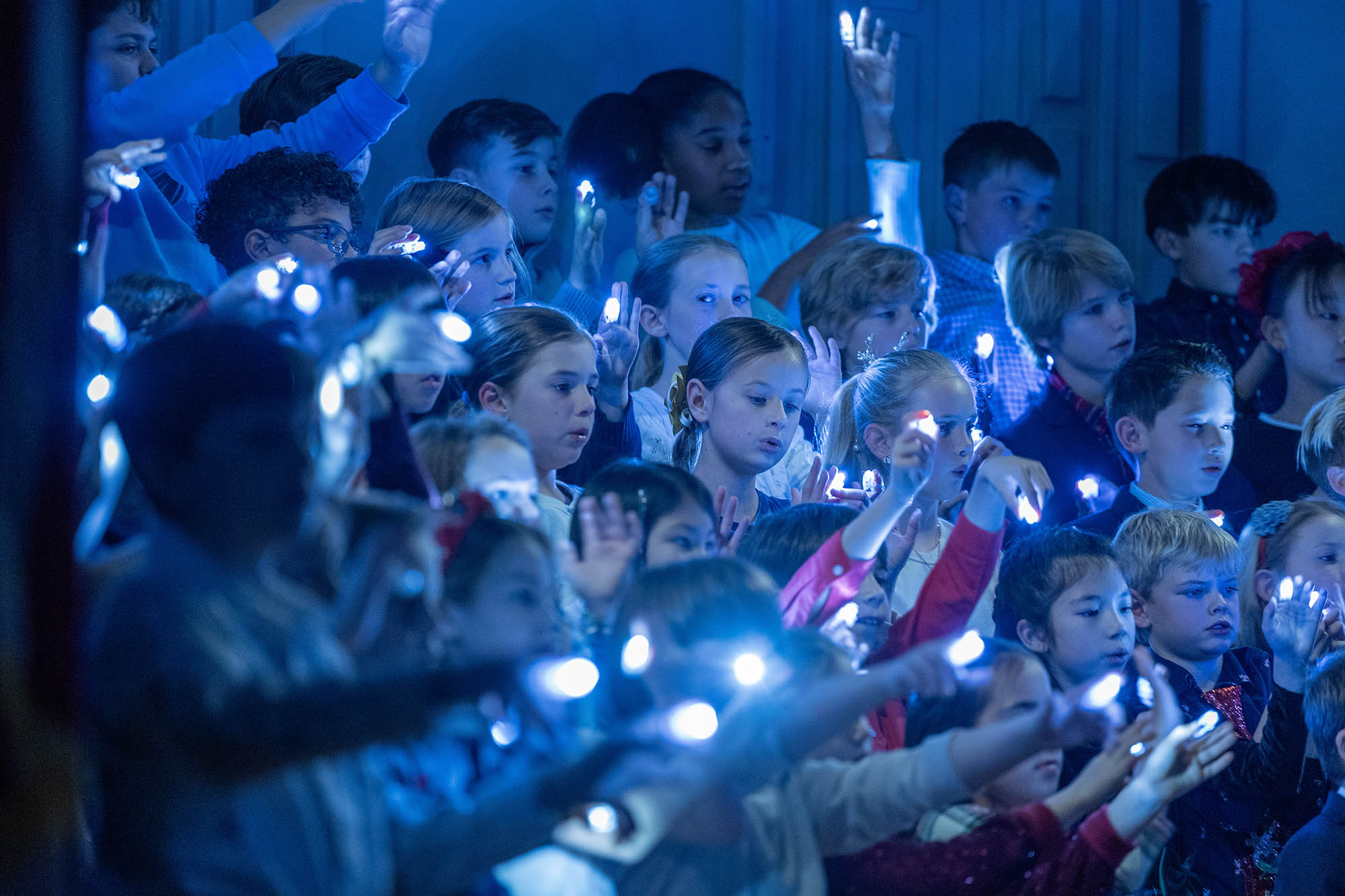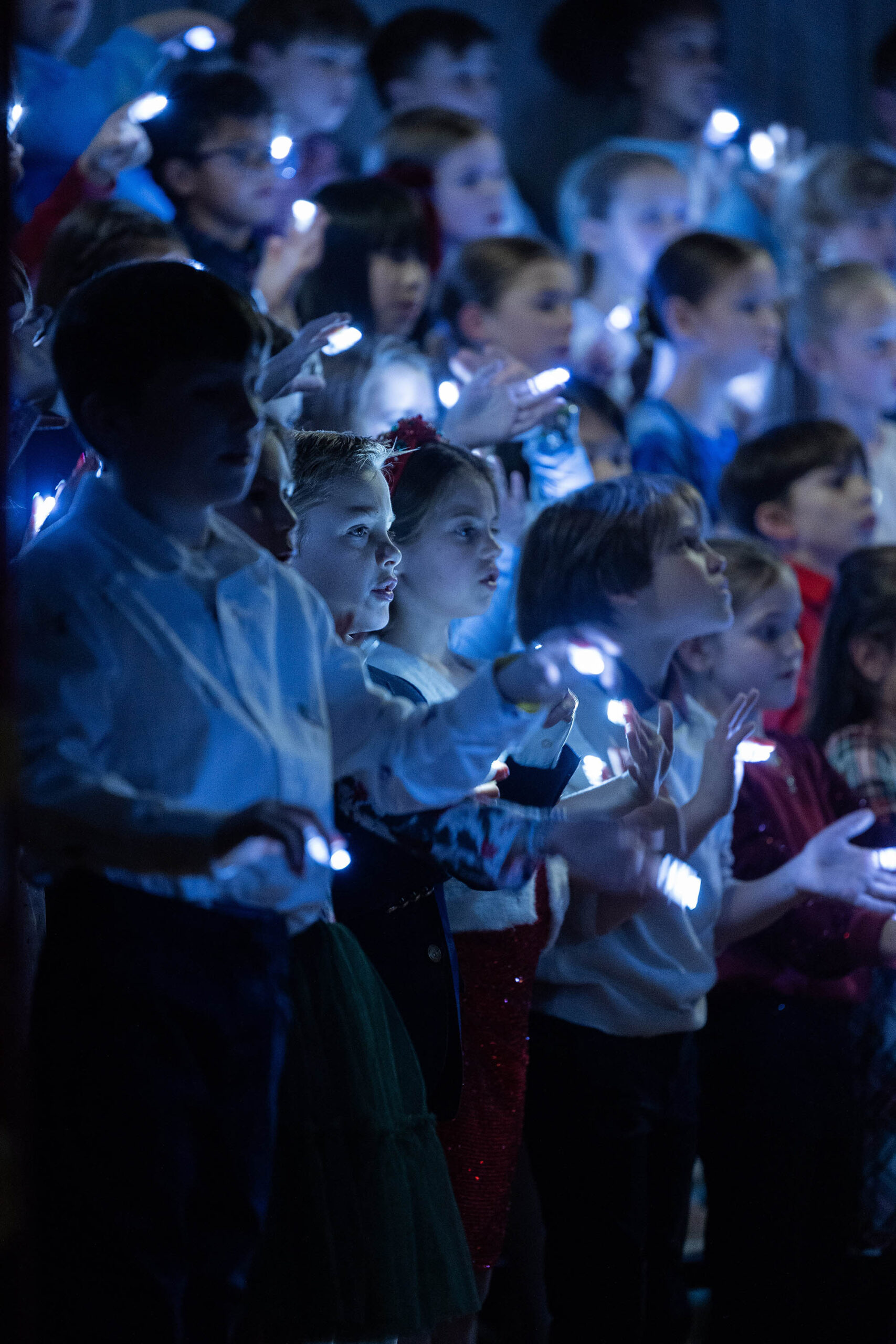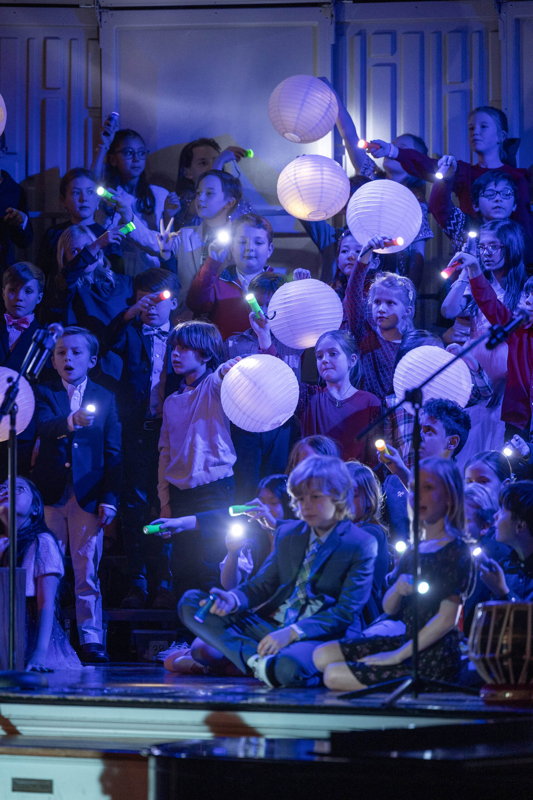 The oldest Lower School students stayed on stage for a gorgeous rendition of a mashup of A Sky Full of Stars/Golden Hour (Coldplay/JVKE, Arr. Brad Stephenson). Students sang in two parts while doing choreography with small, extremely bright finger lights, which looked like shooting stars in the darkened auditorium. The effect was moving and many in the audience teared up with the beauty of the children’s voices with the lighting effects.