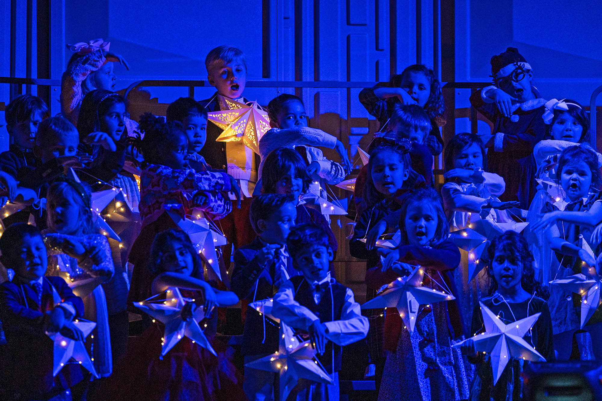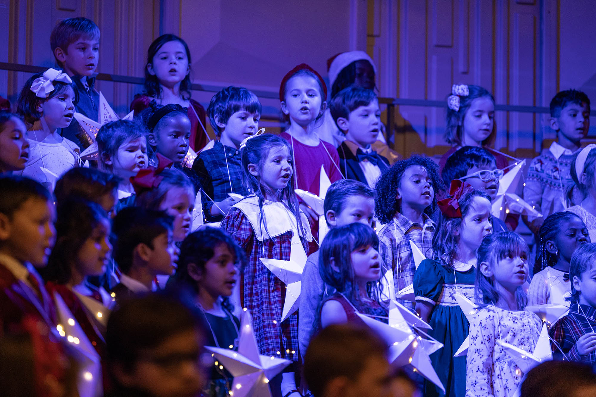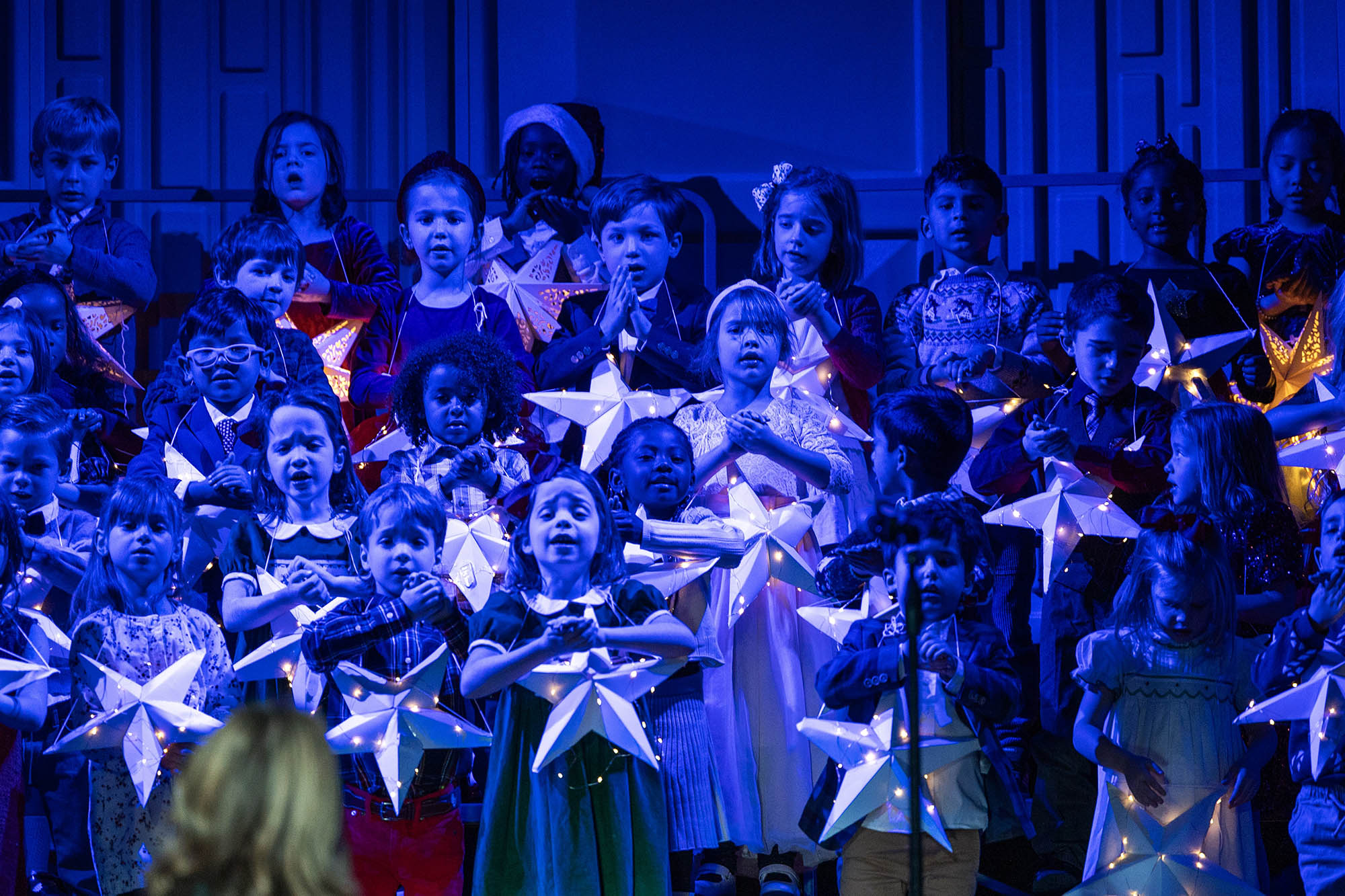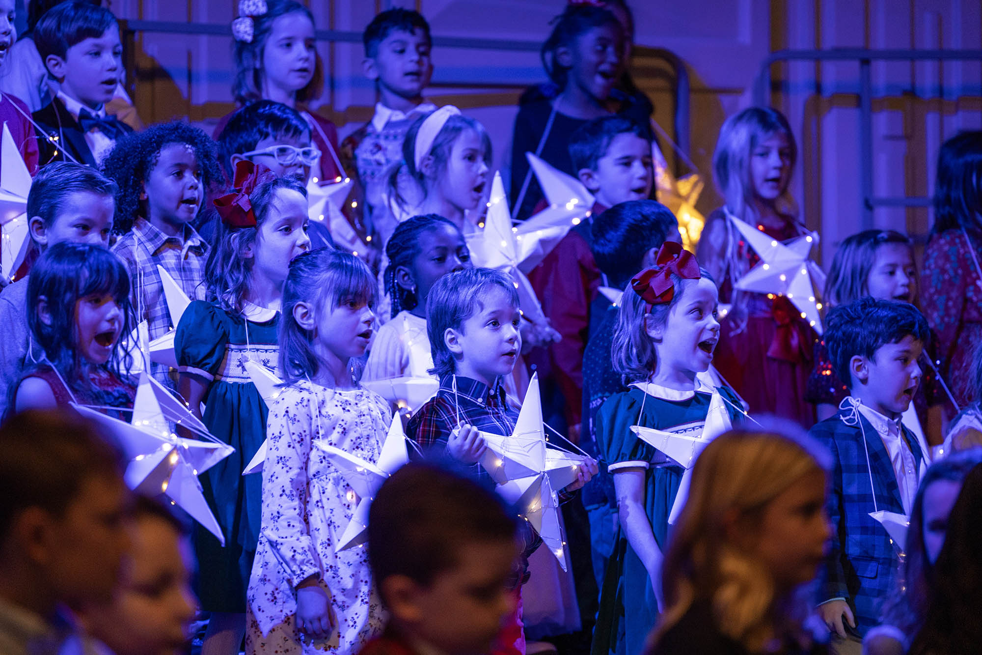 Then, Junior and Senior Kindergarten students came onto the stage sporting wearable art stars that lit up, created under the direction of Lower School Art Teacher Sarah Garner. The children sang Stars Are Shining Bright Tonight, accompanied by the third graders on the barred instruments, followed by Silent Night which they performed vocally and with sign language.