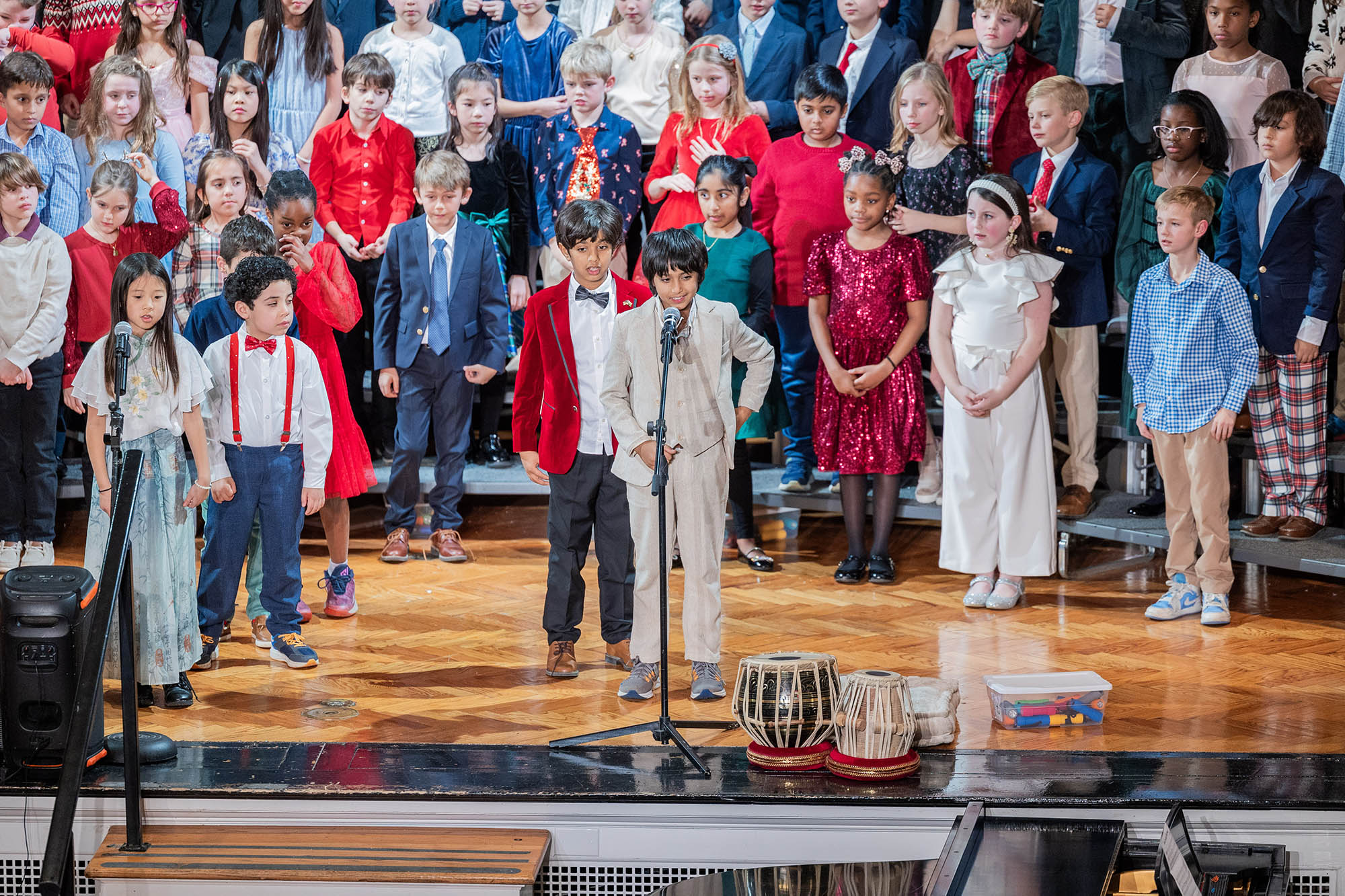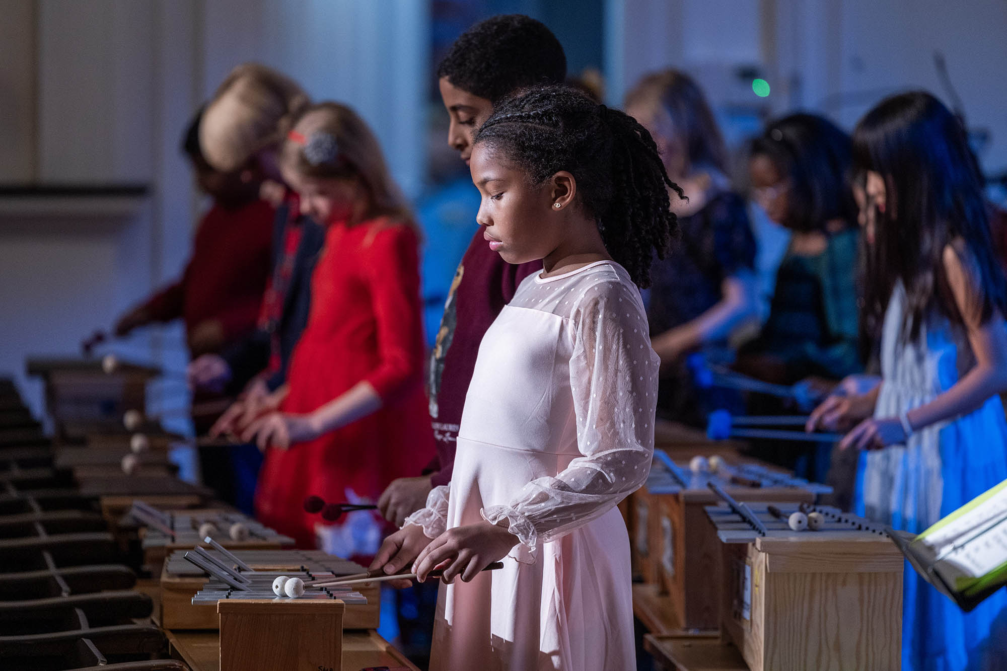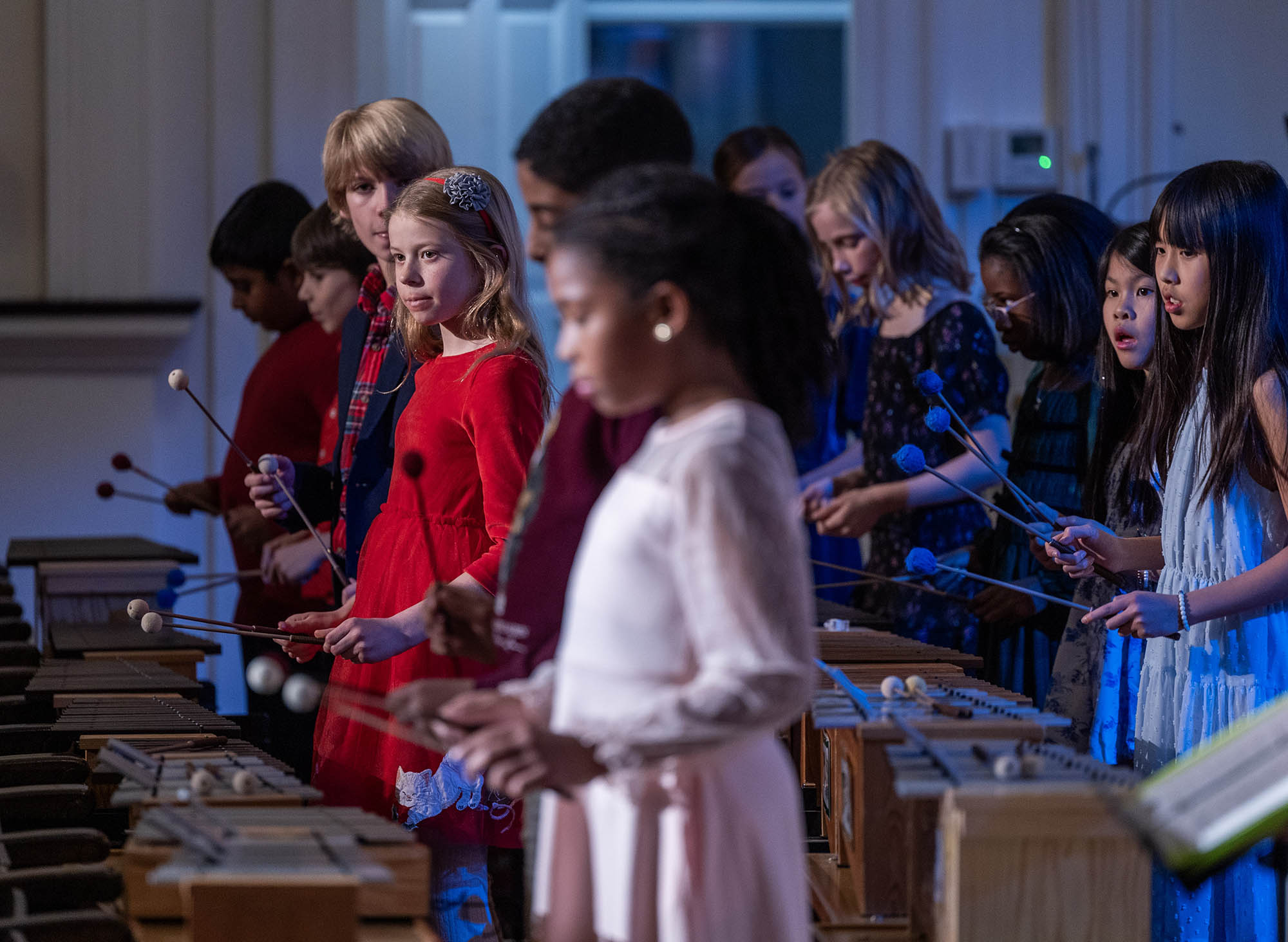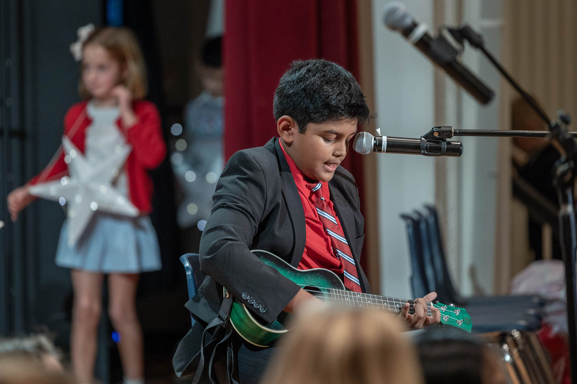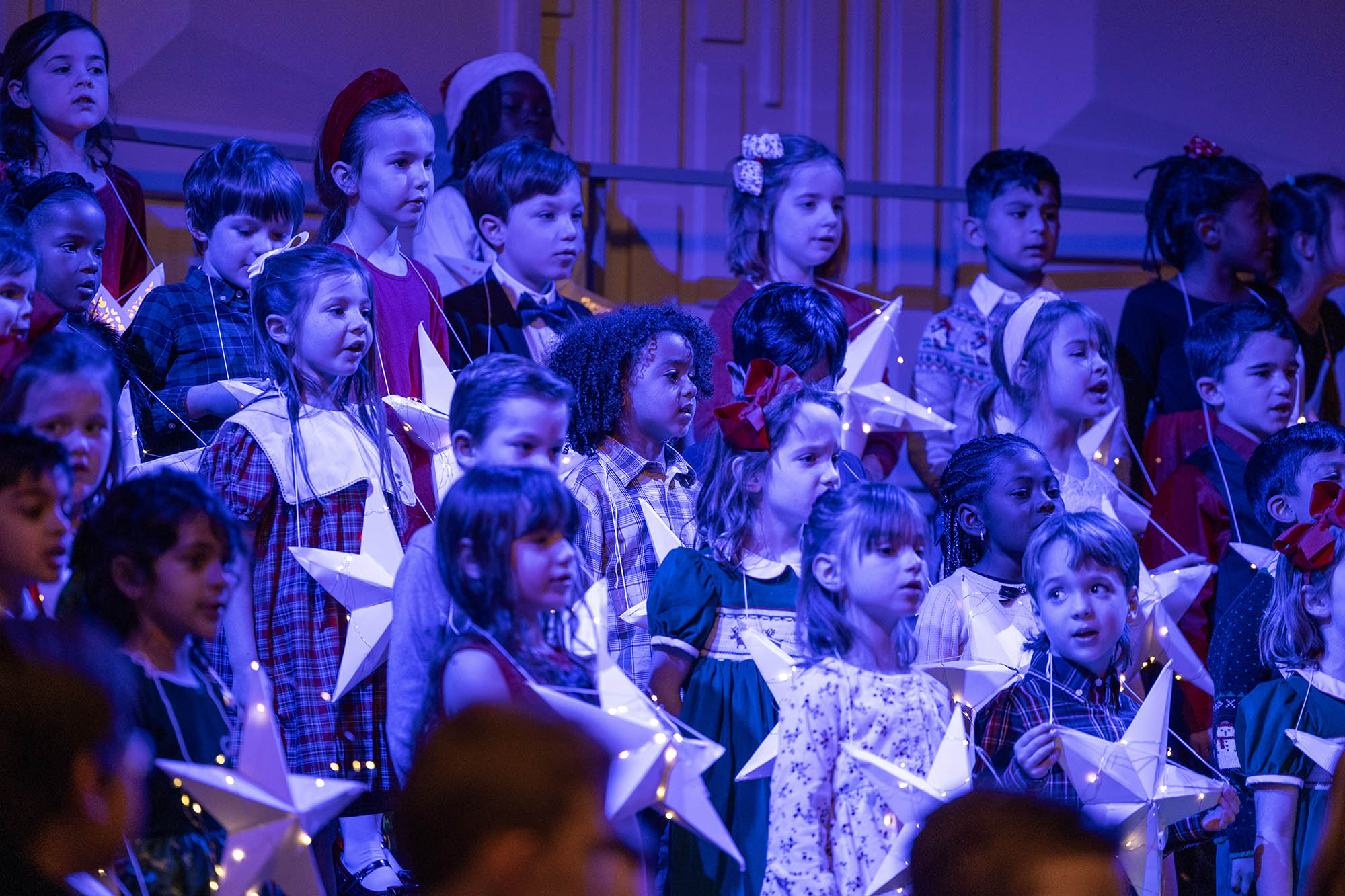 Then, Junior and Senior Kindergarten students came onto the stage sporting wearable art stars that lit up, created under the direction of Lower School Art Teacher Sarah Garner. The children sang Stars Are Shining Bright Tonight, accompanied by the third graders on the barred instruments, followed by Silent Night which they performed vocally and with sign language.