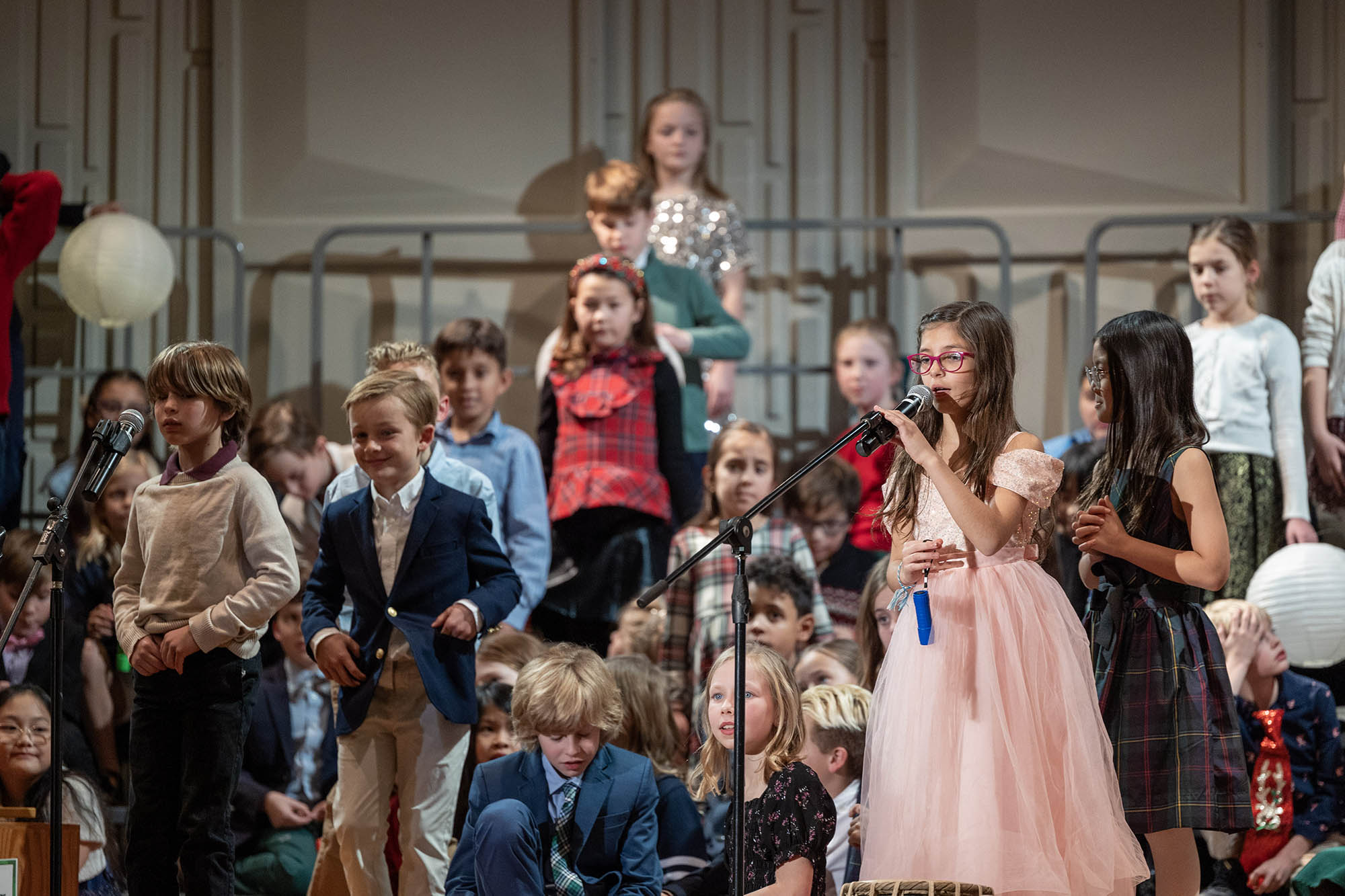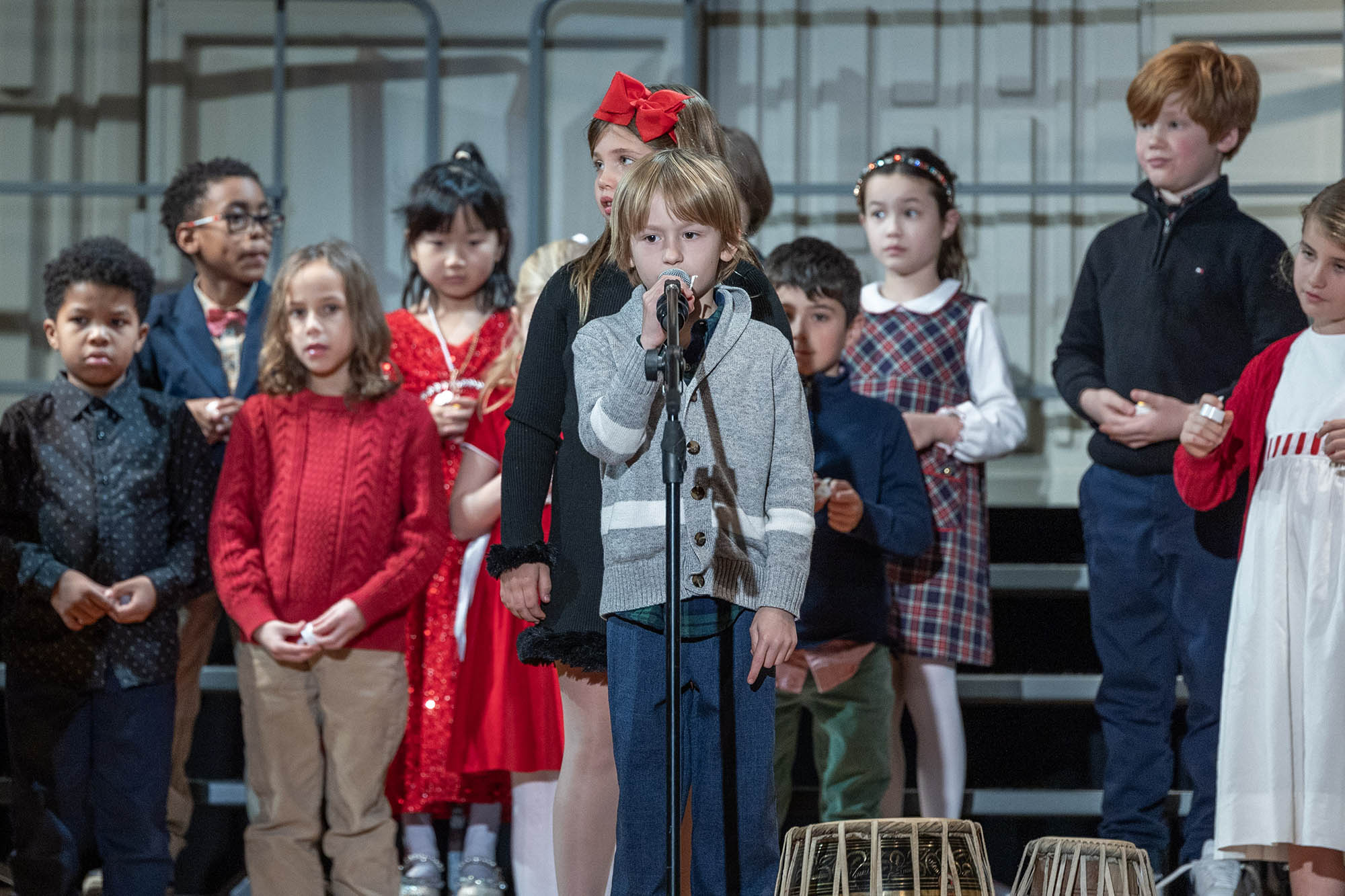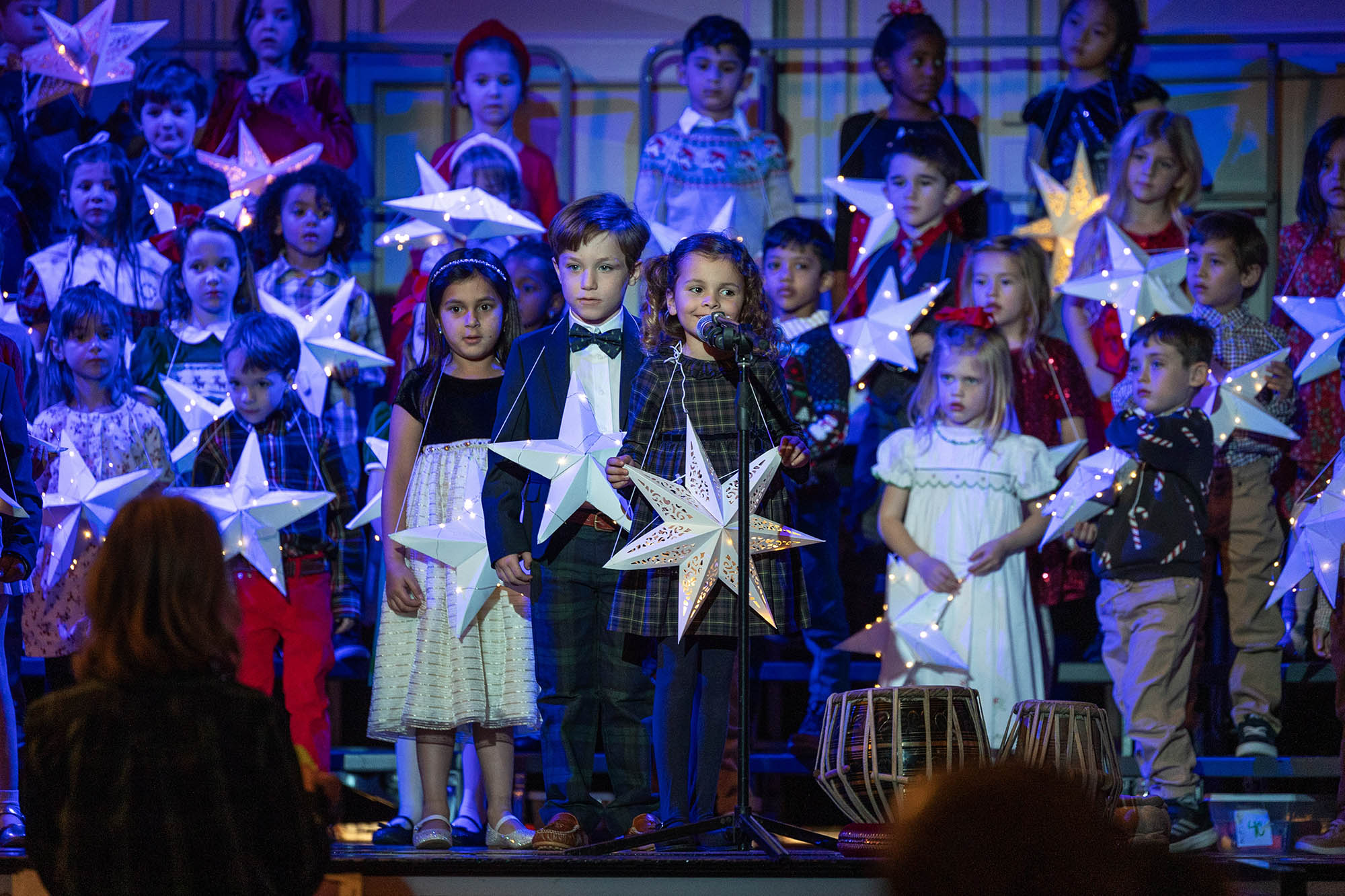 Mary Eliot Chapel was aglow with stars, moons, and Beasley musicians on Tuesday, December 16 for the annual Lower School Winter Program. This year’s theme was Winter Dreams, and all the songs focused on nighttime celebrations of winter and winter holidays. The speaking roles before each song consisted of poetry with a theme of dreams and nighttime, including classics such as Jane Taylor’s Twinkle, Twinkle Little Star, a condensed version of T’was the Night Before Christmas, Chanukah Dreams by Judith Ish-Kishor, and The Dream Keeper by Langston Hughes. The program was directed by Dr. Katy Nichols, Lower School Music Teacher, and accompanied by Kathleen Baker. Upper School Arts Teachers Patrick Huber and Tim Henderson, and Elika Coff ’30, assisted with sound and lighting.