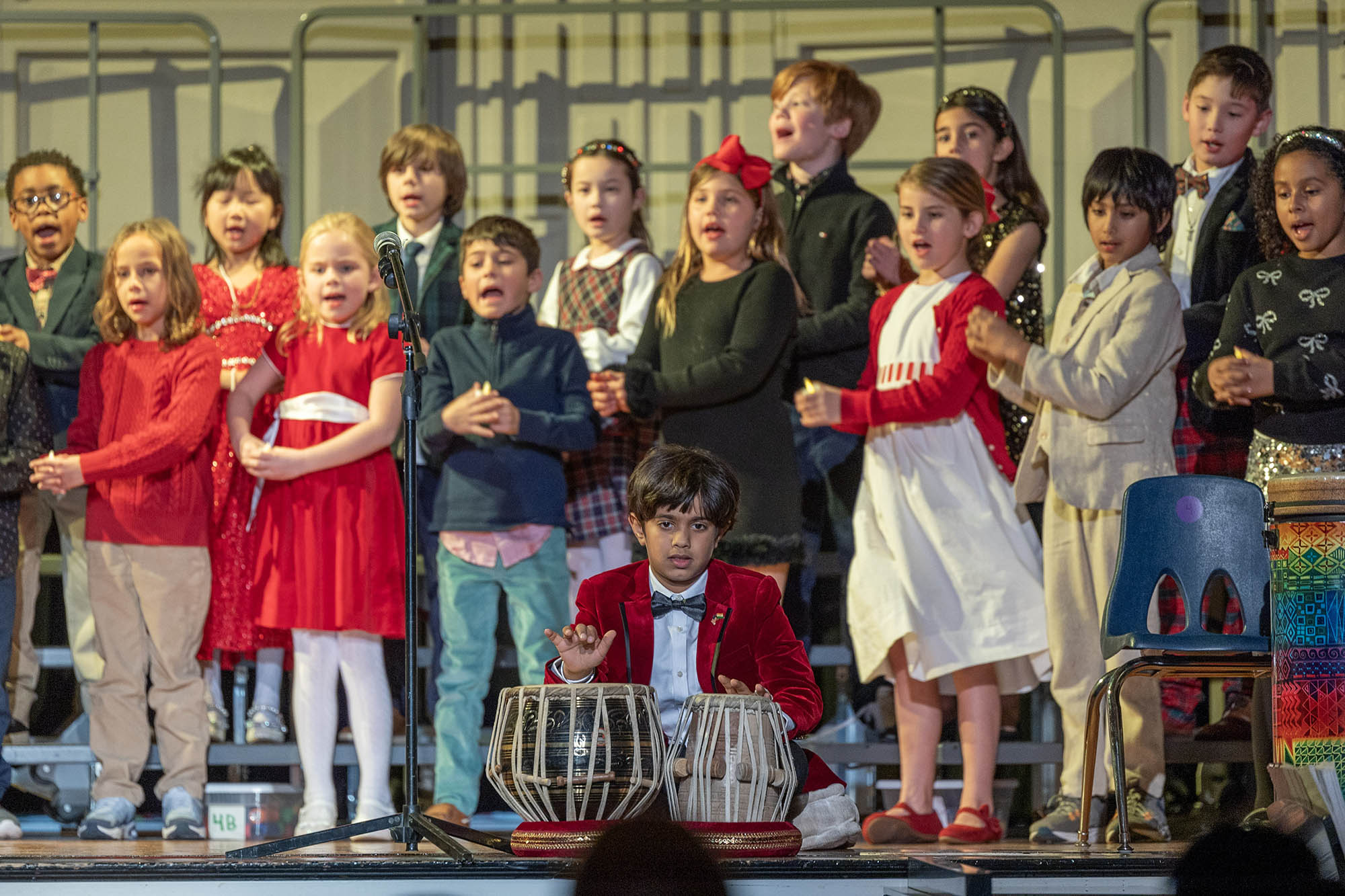 Next up were the second graders singing Aeyaya Balano Sakkad in honor of Diwali. This year, a second-grader who plays the tabla, an Indian drum set, was featured in the piece. He practiced under the direction of his tabla teacher and provided authenticity to the sound of the piece.