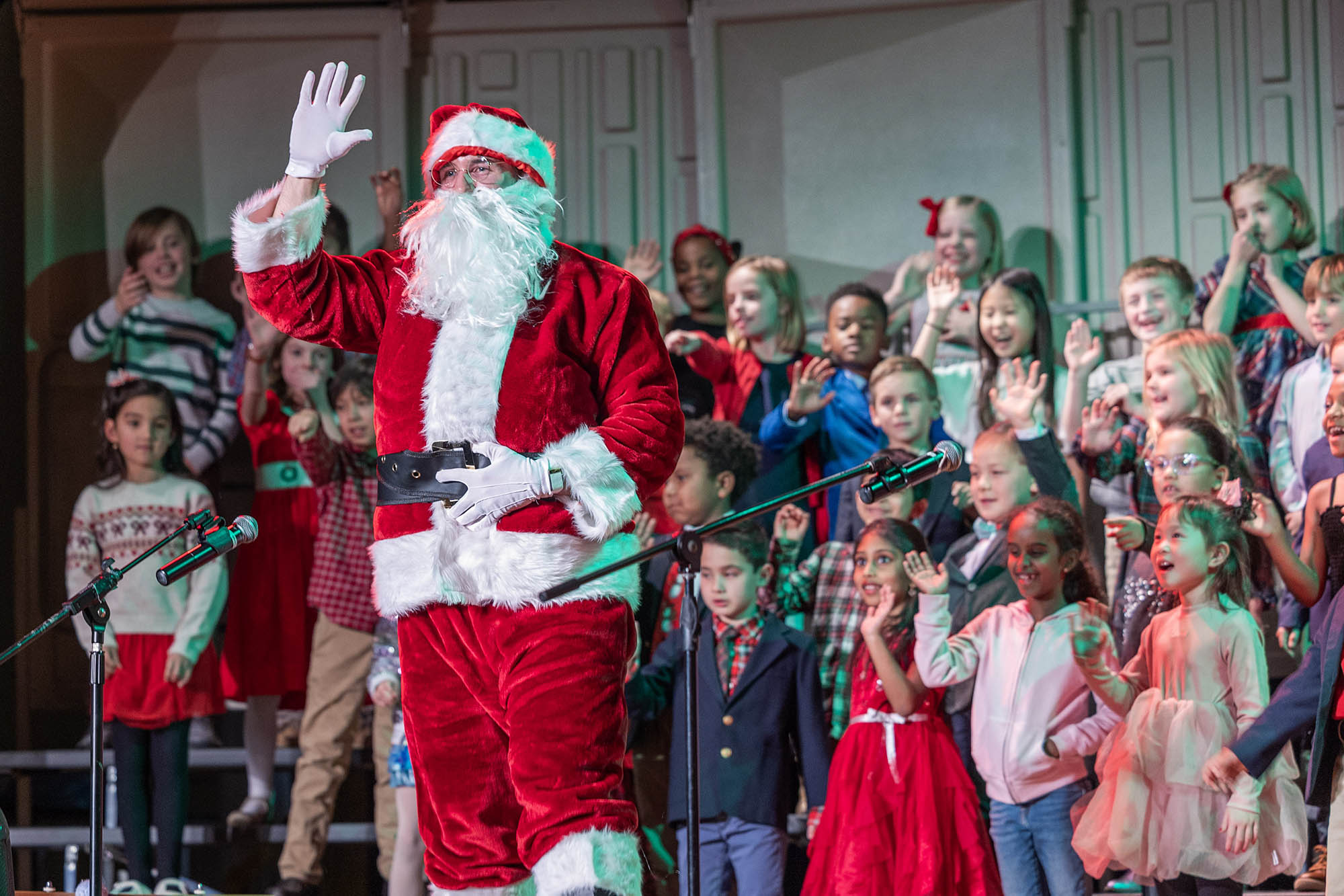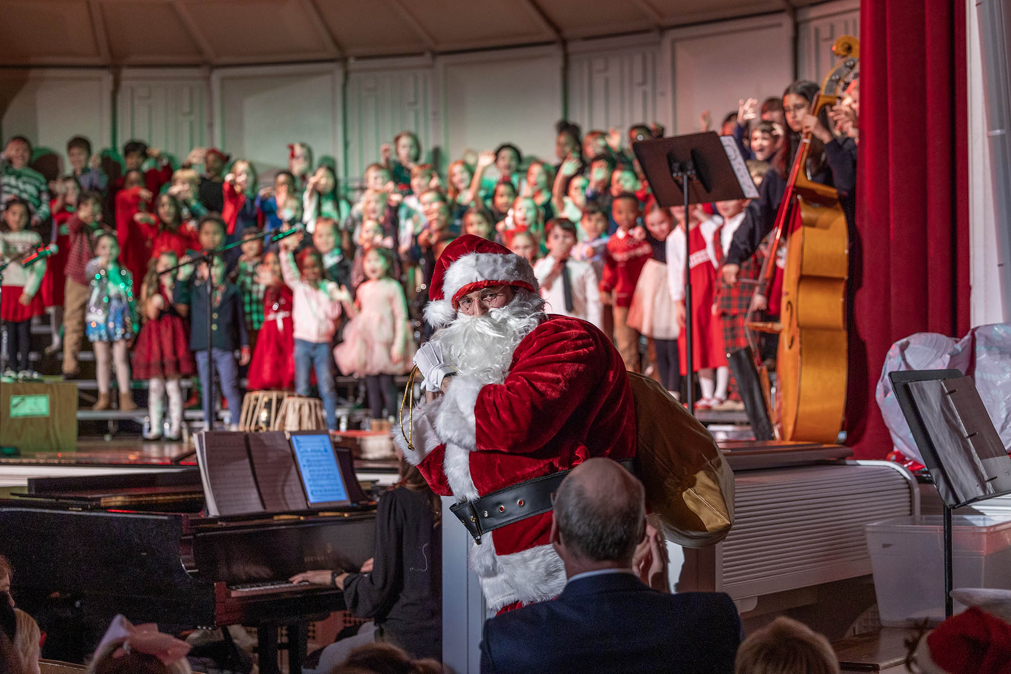 (Everybody’s Waitin’ for) The Man With the Bag featured an MICDS Middle School upright bass player, Prashanti Mamileti ’30, and a Middle School percussionist, Brandon Jewett ’31. This holiday classic also had a surprise guest, Santa Claus, played by First-Grade Teaching Associate Tanner Amell. The first- and second-graders were in on the surprise and had much anticipation for this special moment in the song. It was adorable to see their reactions while they were singing.