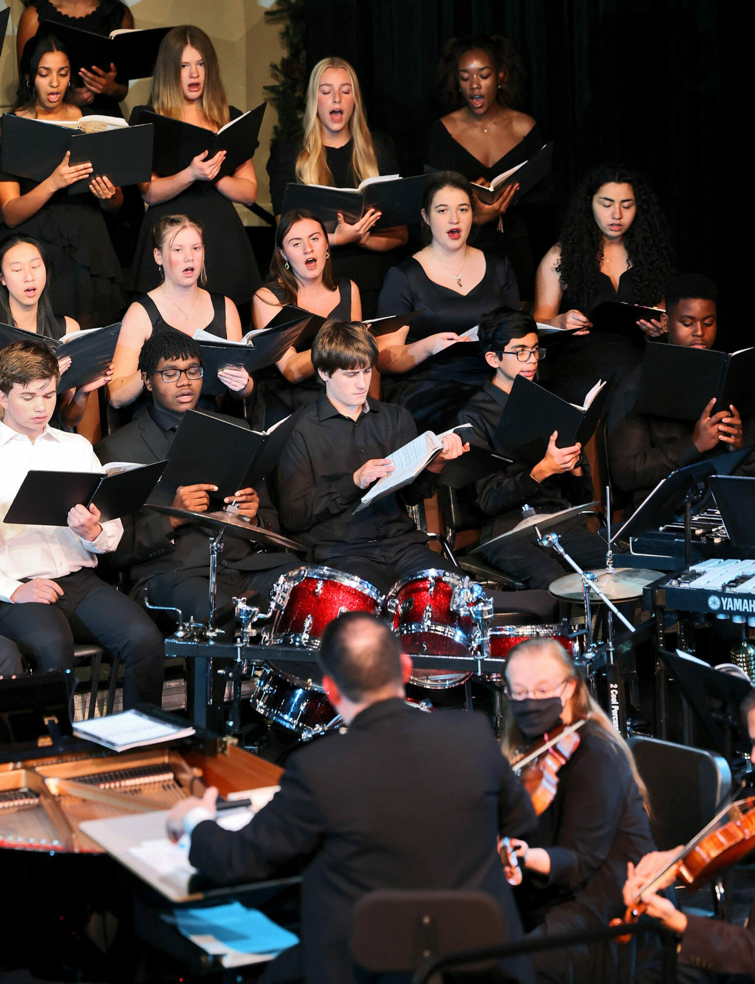 Featured soloists included seniors Ella Chamberlain ’23, Noah Macam ’23, Alizeh Jawaid ’23, and Livi Thomas ’23. The choirs also performed several traditional holiday favorites, including Sleigh Ride, Winter Wonderland, It’s the Most Wonderful Time of the Year, Let it Snow! Let it Snow! Let it Snow!, and Jingle Bells as recorded by Barbra Streisand, and a new addition to the program, Irving Berlin’s White Christmas. The show closed with an invitation for guests to join the choir on stage in singing Handel’s Hallelujah Chorus.